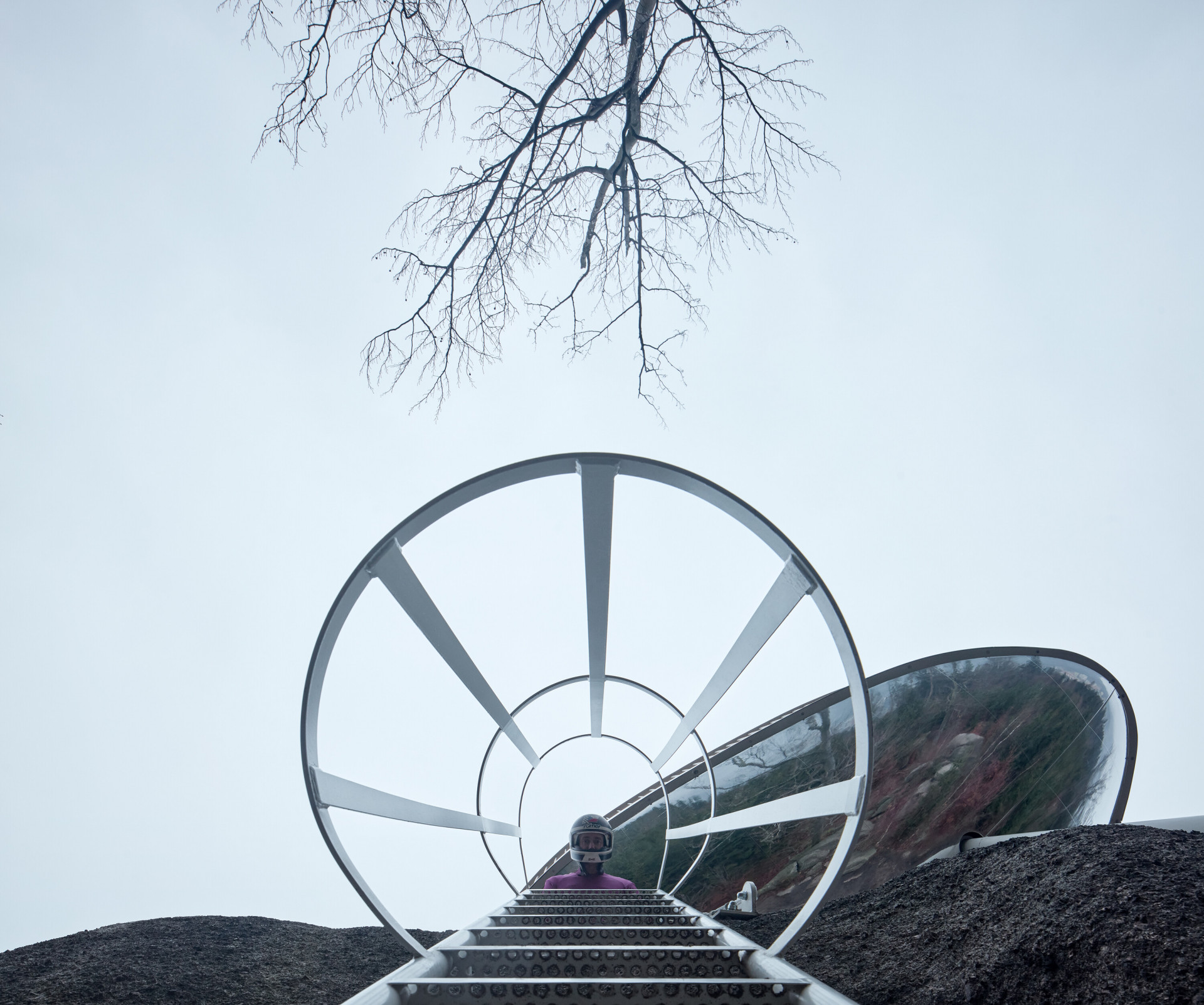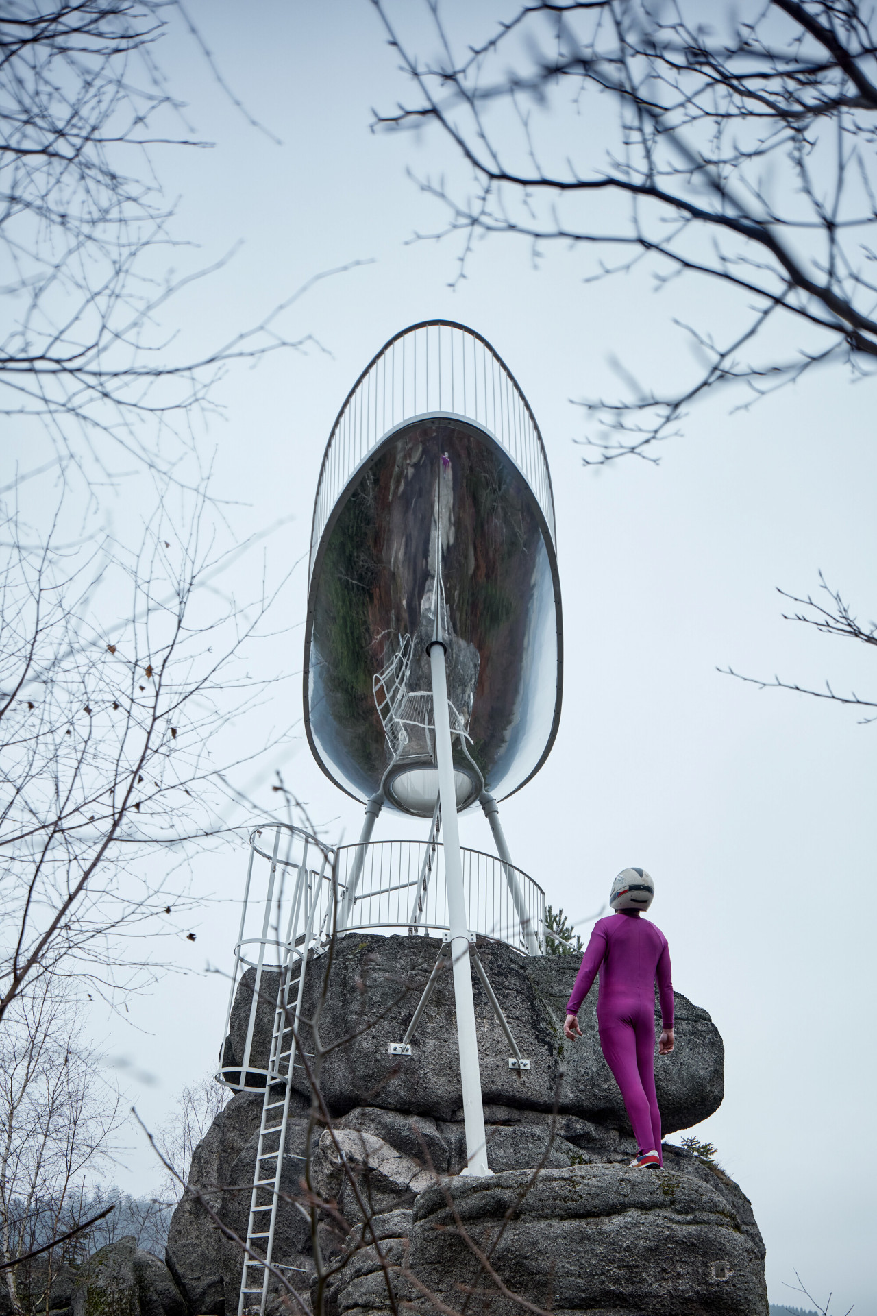 Organická vyhlídka na severu Čech korunovala jednu z místních skal. Její abstraktní podoba vyšla ze vzpomínky na závodníky, kteří kdysi brázdili svahy zdejších kopců na lesklých bobech.