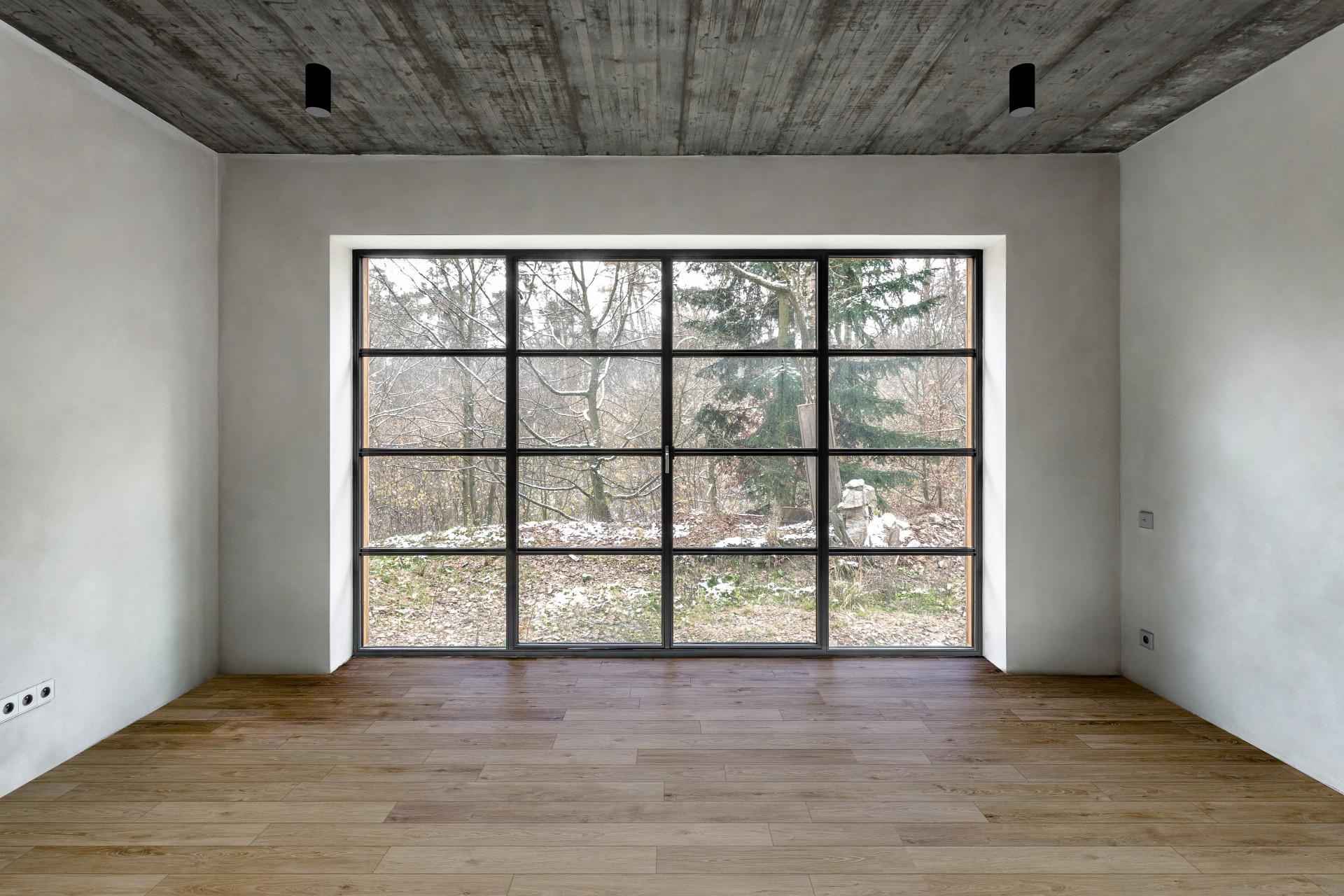 V nejnižším patře přímo navazujícím na zahradu se nachází obývací pokoj. Ten je navíc pomocí vertikální galerie vizuálně propojený s kuchyní. Nejvyšší místo v domě s nádhernými výhledy na řeku Vltavu si zasloužila ložnice se zázemím.