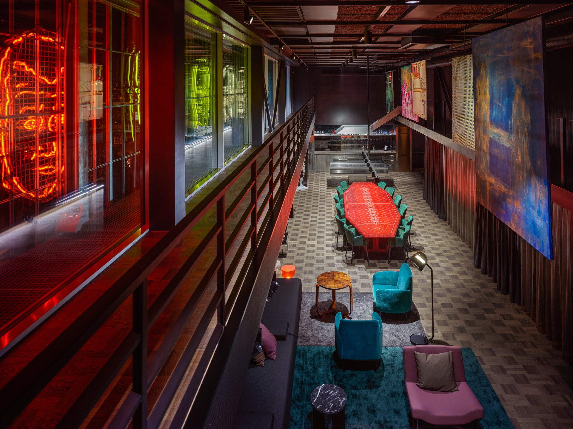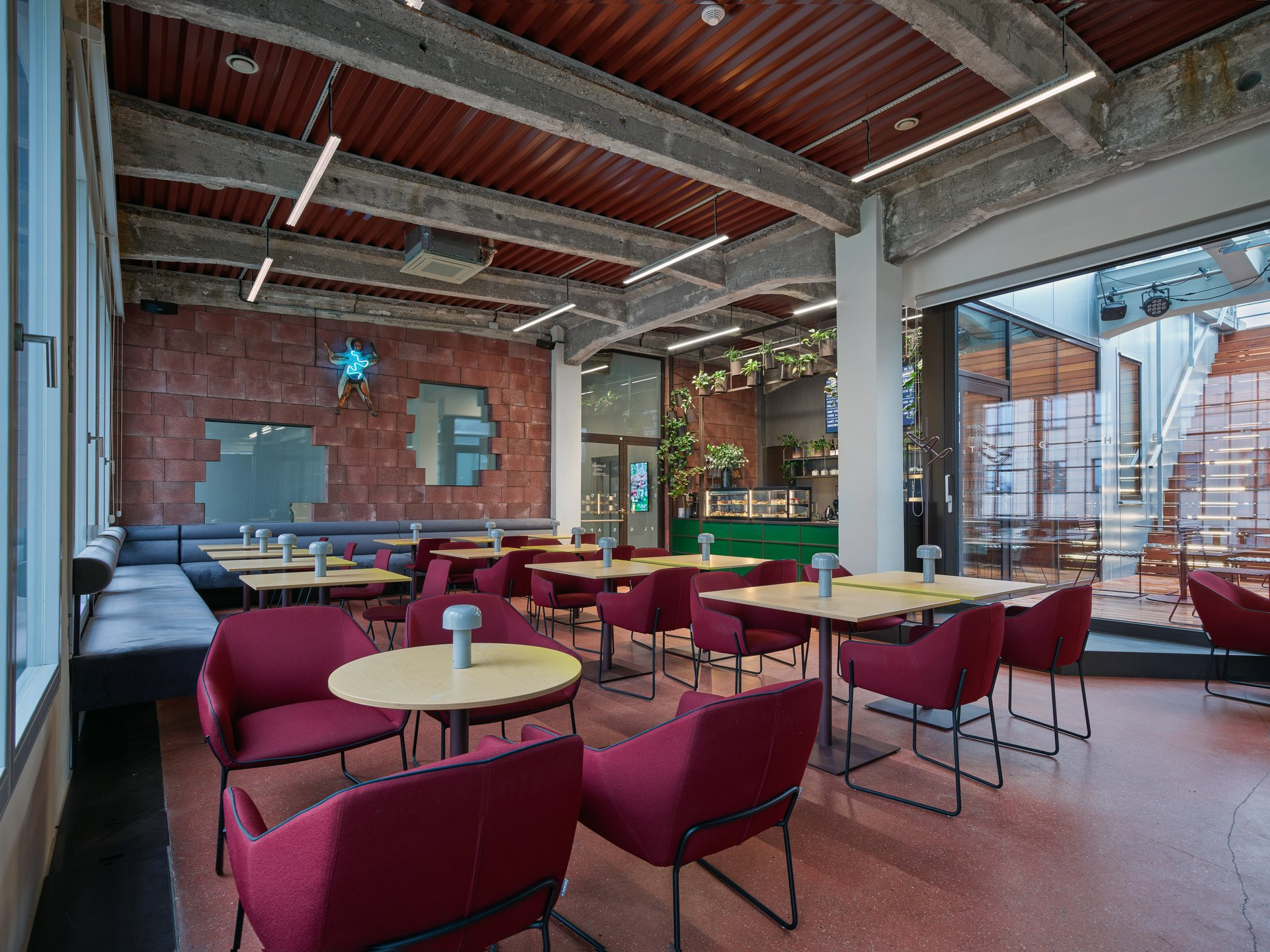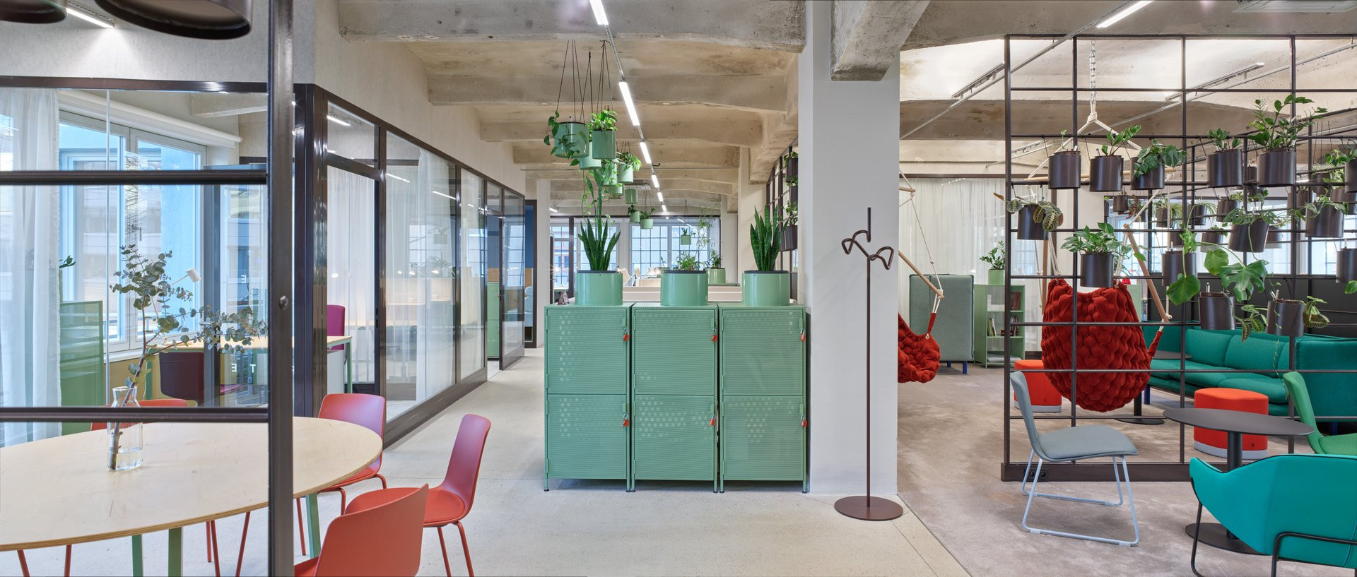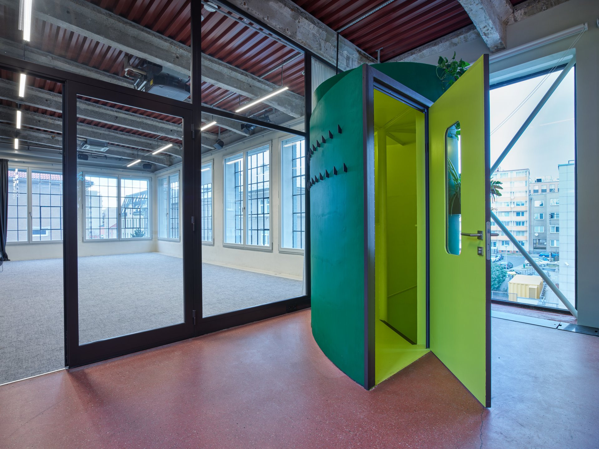Galerie v přízemí a coworkingová patra toho mají mnoho společného. V celé budově na sebe upoutávají pozornost odhalené původní konstrukční prvky. Opakuje se také použití skleněných příček v tmavě šedých rámech. Barvu do interiérů kanceláří přináší především pestré vybavení.