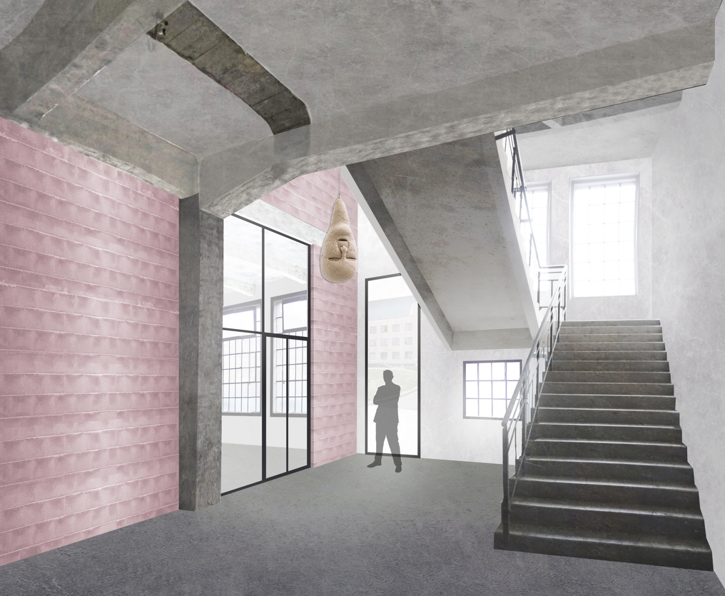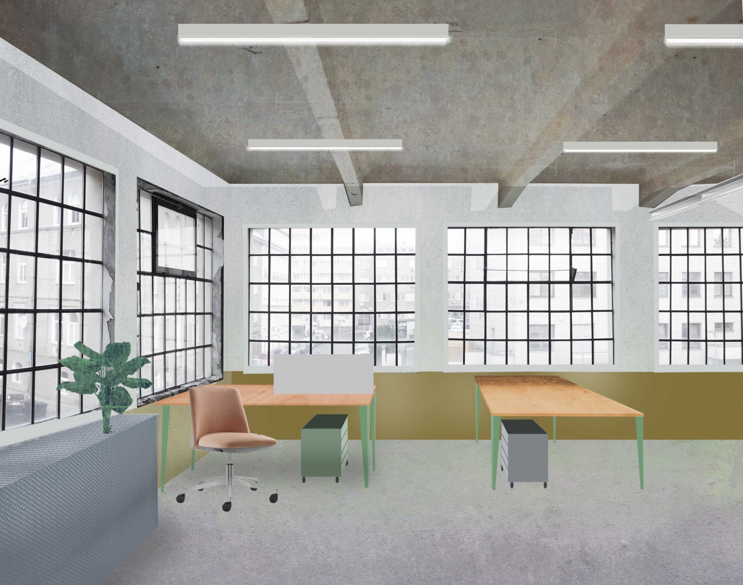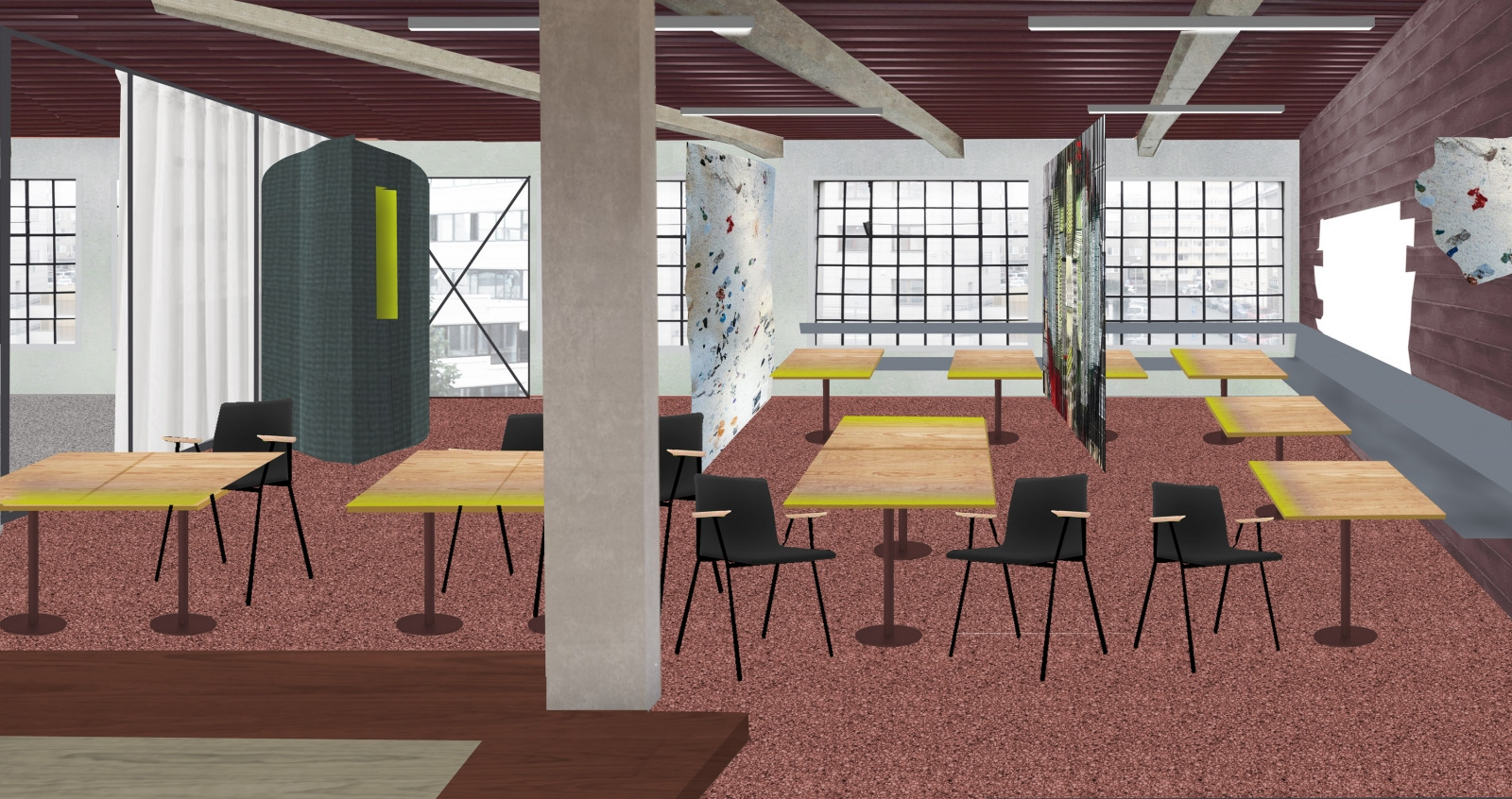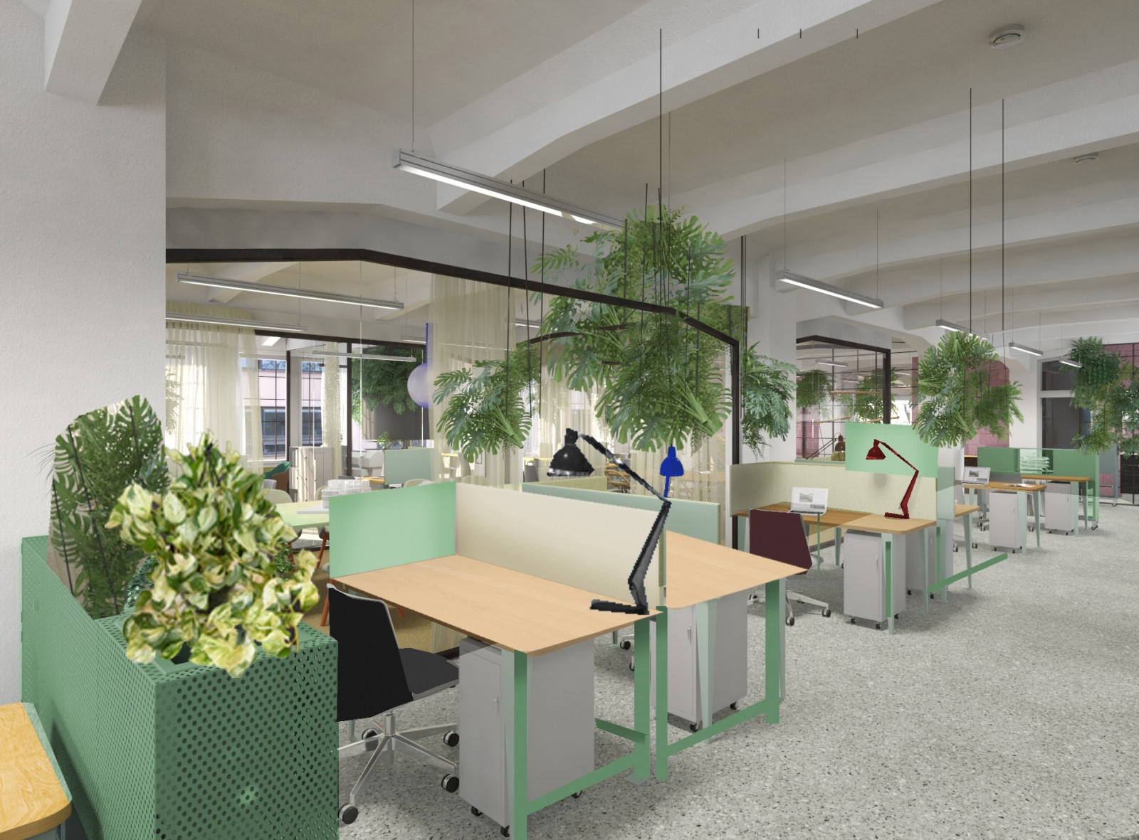 Galerie v přízemí a coworkingová patra toho mají mnoho společného. V celé budově na sebe upoutávají pozornost odhalené původní konstrukční prvky. Opakuje se také použití skleněných příček v tmavě šedých rámech. Barvu do interiérů kanceláří přináší především pestré vybavení.