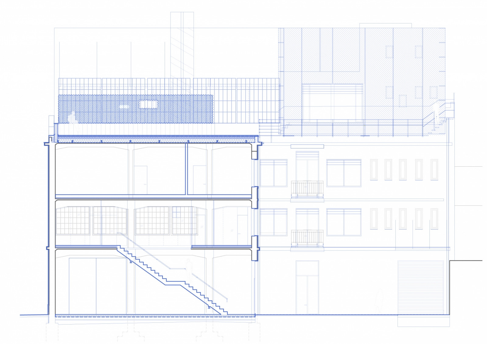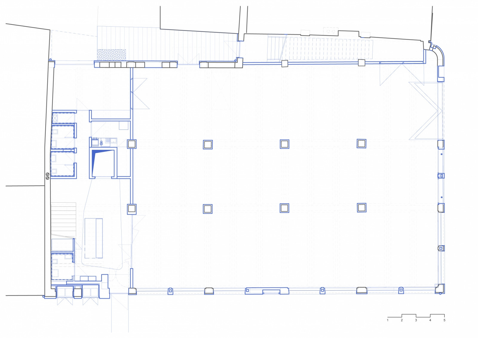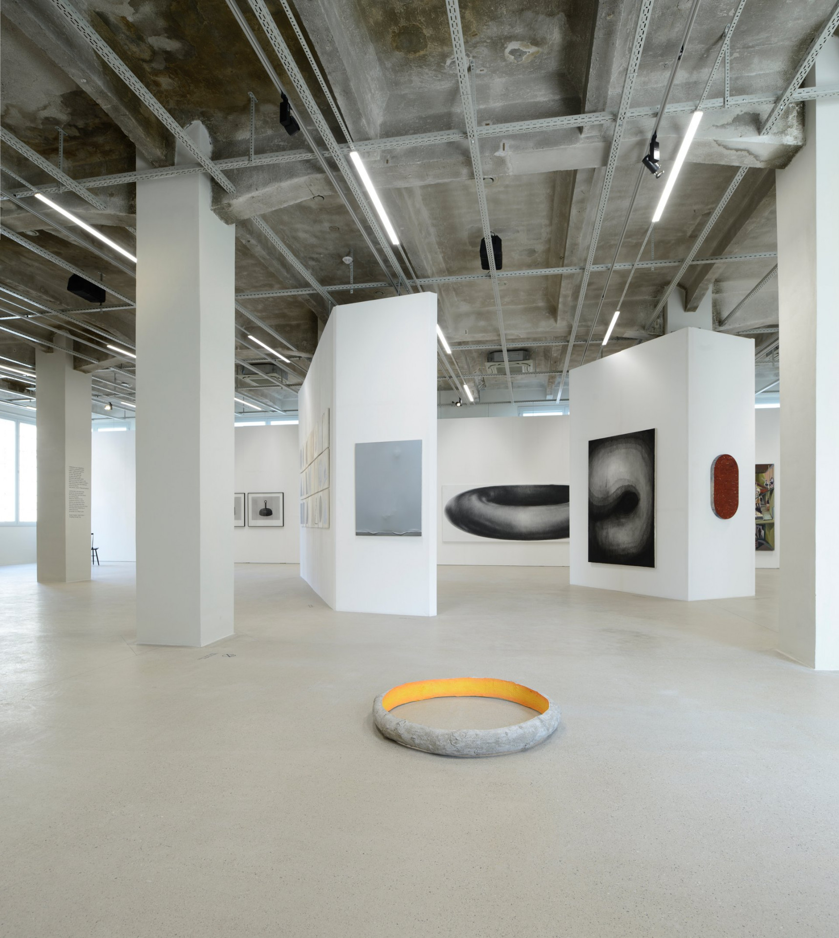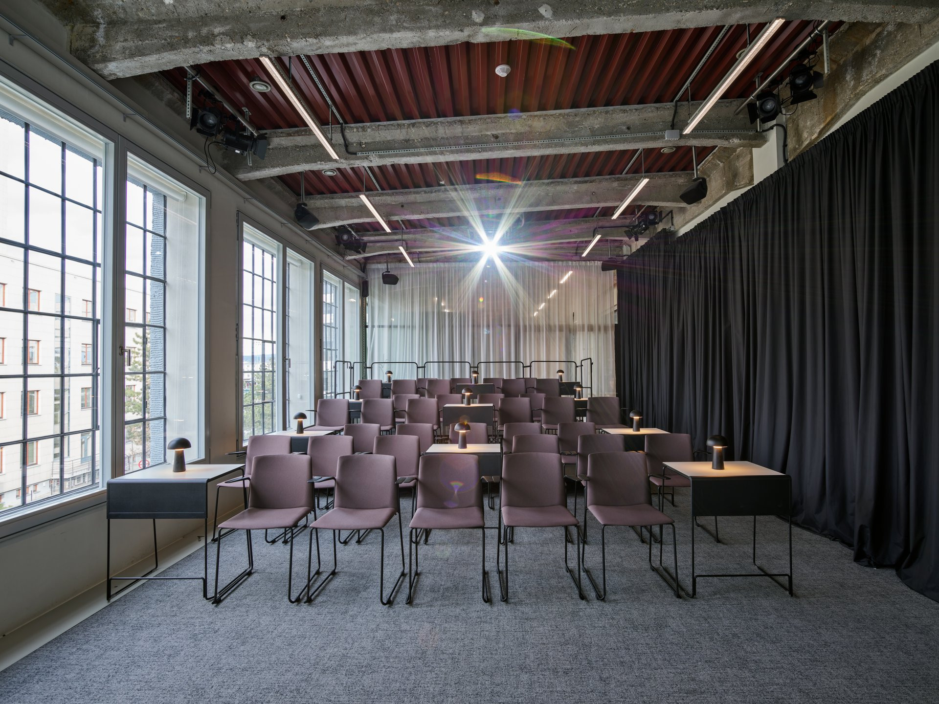 Galerie v přízemí a coworkingová patra toho mají mnoho společného. V celé budově na sebe upoutávají pozornost odhalené původní konstrukční prvky. Opakuje se také použití skleněných příček v tmavě šedých rámech. Barvu do interiérů kanceláří přináší především pestré vybavení.