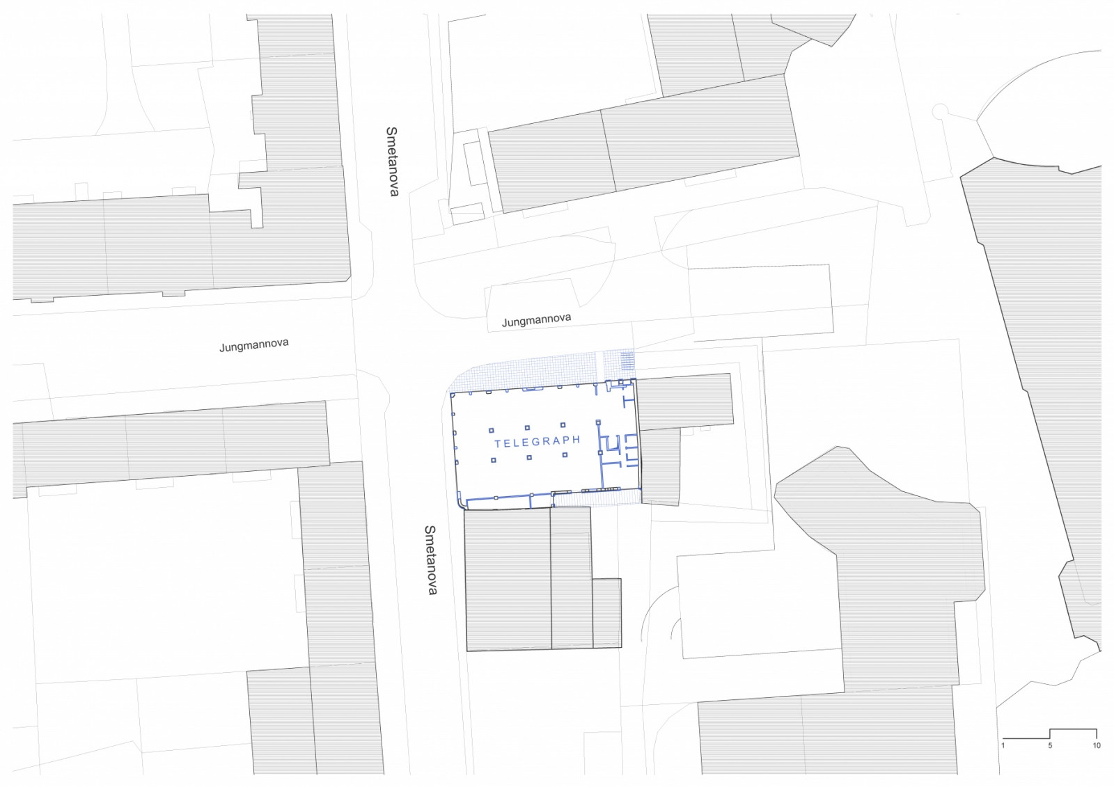 „Původní objekt je zvenku památkářsky zachován, ale s novou strukturou na fasádě. Zachovali jsme původní princip etážové výroby – každé patro je jiné (funkcí i designem),“ popisují realizaci architekti z lokálního architektonického studia Ječmen. Investorem byl olomoucký podnikatel Robert Runták, který je rovněž majitelem rozsáhlé sbírky moderního a současného umění. Právě galerijní prostory zabírají celé přízemí objektu. Umělecká díla a instalace ovšem citlivě zrekonstruovanou budovu zdobí i zvnějšku. „Na fasádě přízemí je legální graffiti stěna – Telegraph se snaží vystupovat i vně a vtahovat kolemjdoucí,“ dodávají architekti.