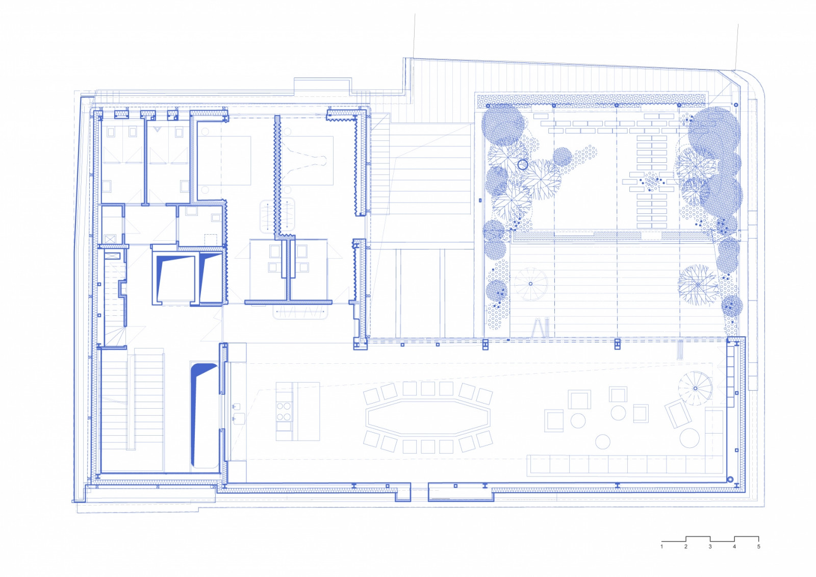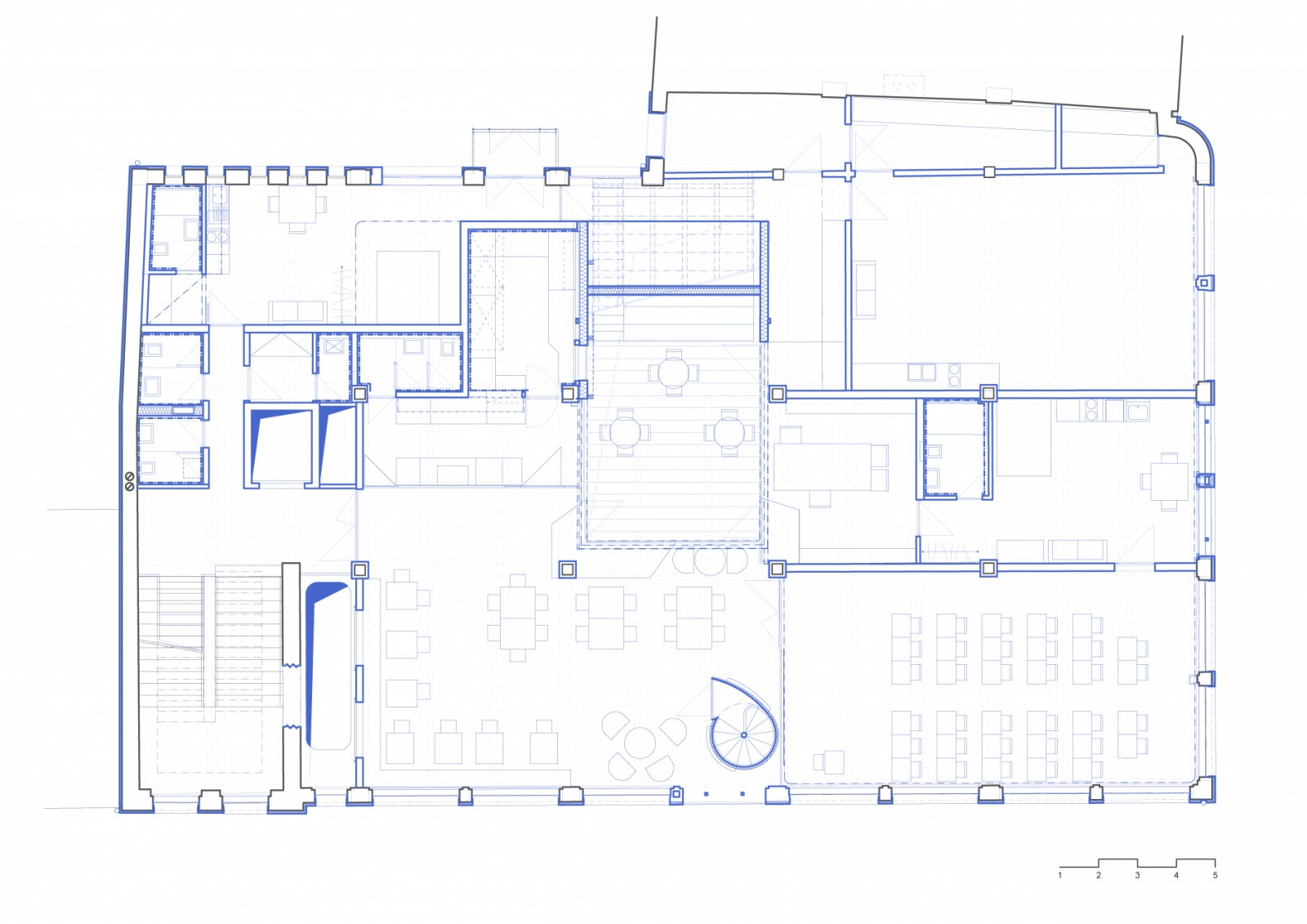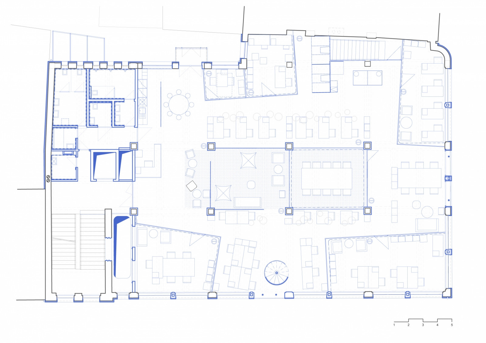 Součástí budovy je dnes poměrně velký coworking, zabírá druhé a třetí podlaží. Z velké části je koncipován jako open space, vizuálně ho však rozdělují vložené zasedací místnosti, odpočinkové zóny nebo menší uzavřené kanceláře. „Coworkingové centrum je hybrid mezi volnou kancelářskou krajinou a samostatnými kancelářemi,“ říkají o kancelářských prostorech architekti Eva Blažková a Lukáš Blažek ze studia Ječmen. V Telegraphu se ale nachází třeba i byt pro hostujícího umělce nebo multifunkční sál.