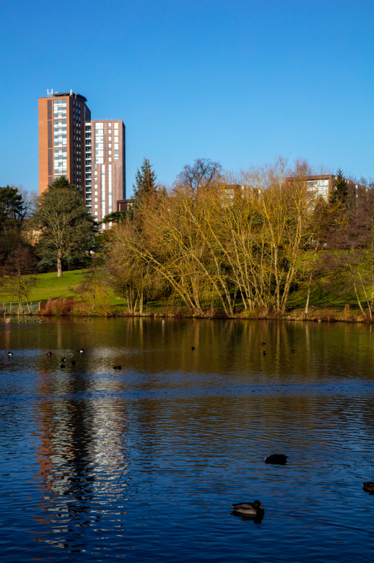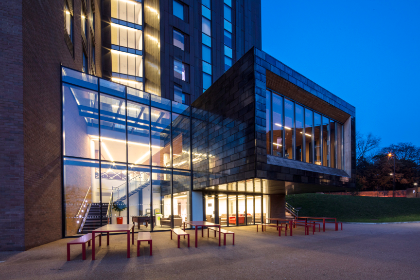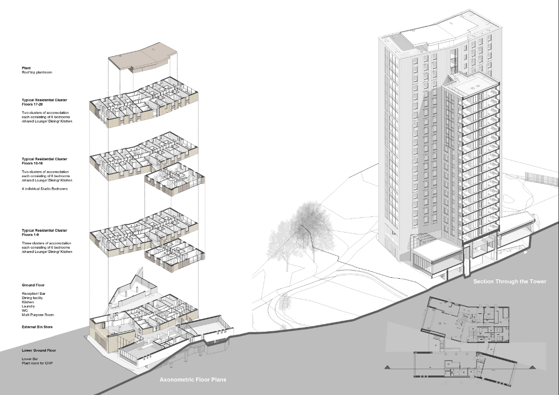 Na návrh nového kampusu byla proto v roce 2012 vyhlášena velká architektonická soutěž, ve které ze 120 projektů zvítězilo birminghamské studio Glancy Nicholls Architects. Architekti celý areál rozdělili do třech lineárních křídel se sdílenými zahradami a volnočasovými prostory, kterým dominuje obytná věž o 21 patrech. Koleje nabízí celkem 726 studentských pokojů. Ty se sdružují ve shlucích po 5 až 6 pokojích, část z nich pak tvoří samostatná studia. Půdorys nového komplexu je vepsán do obvodu předchozích budov, což minimalizuje dopad na okolní park.