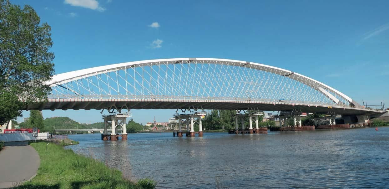 Most má dvě pole. Hlavní pole překračující Vltavu o rozpětí 200,4 m má obloukovou konstrukci s táhlem. Krajní inundační pole má roštovou konstrukci a rozpětí pouze 40,4 m. Šířka mostu včetně chodníků dosahuje cca 36 m. Obě pole jsou podepřena na společném pilíři P2, ale staticky spolu nespolupůsobí, jsou oddělena dilatací. Podélný řez je schematicky uveden na obr. 1.