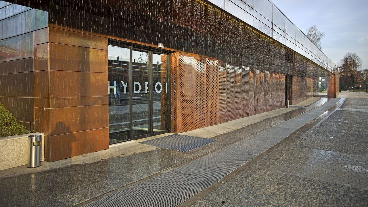 Vstupní prostor, navržený jako nová budova, přistavěná k existujícímu rezervoáru, tvoří novou fasádu, ladící s nedalekou vodárenskou věží - klenotem místní architektury a technologickým zázrakem konce 19. století. Pro vstupní prostor byly zvoleny přírodní materiály - beton, sklo a měď - doplňující materiály původního rezervoáru a historické vodárenské věže. Fasády stavby jsou většinou pokryté pouze hladkým a děrovaným klasickým měděným plechem; na vnitřní stěny byla použita předoxidovaná měď. Fasáda vstupního prostoru nabízí návštěvnickou atrakci - 46,5 m dlouhou vodní tiskárnu. Tekoucí, padající voda je umně řízena tak, že vytváří různé tvary, vzory a nápisy.