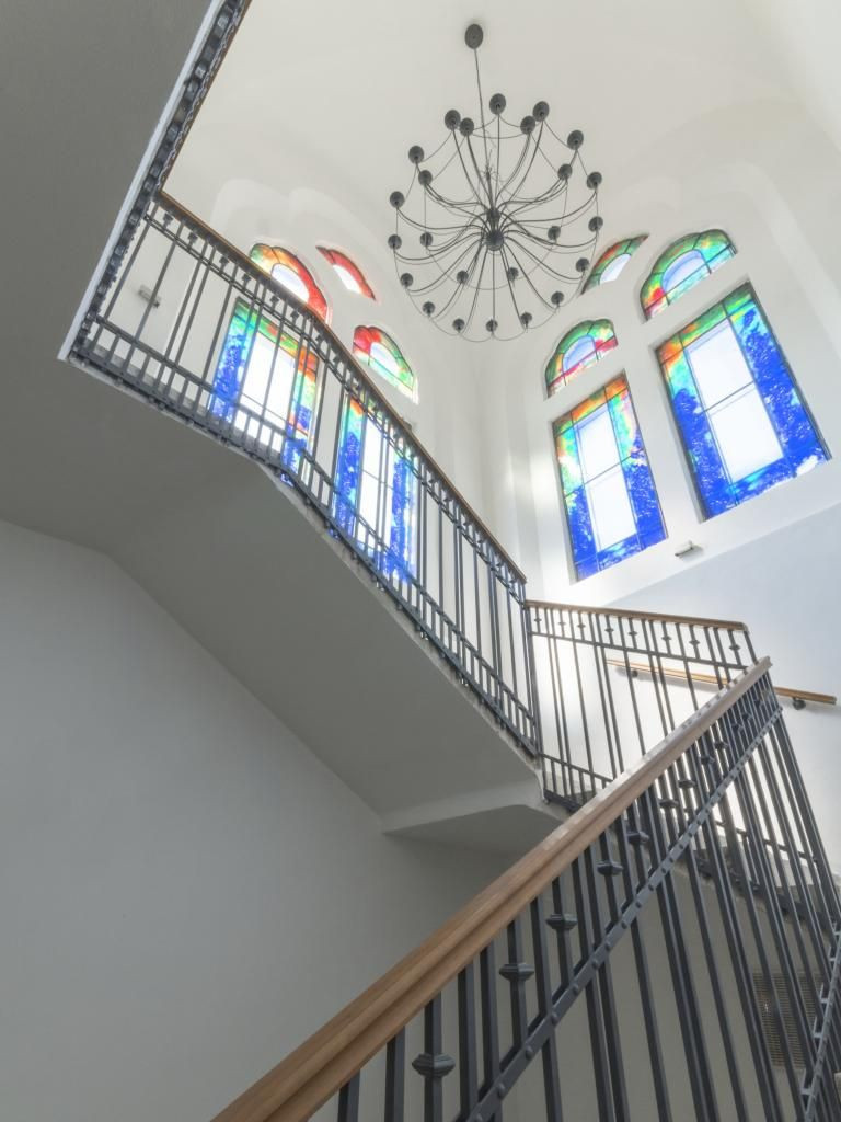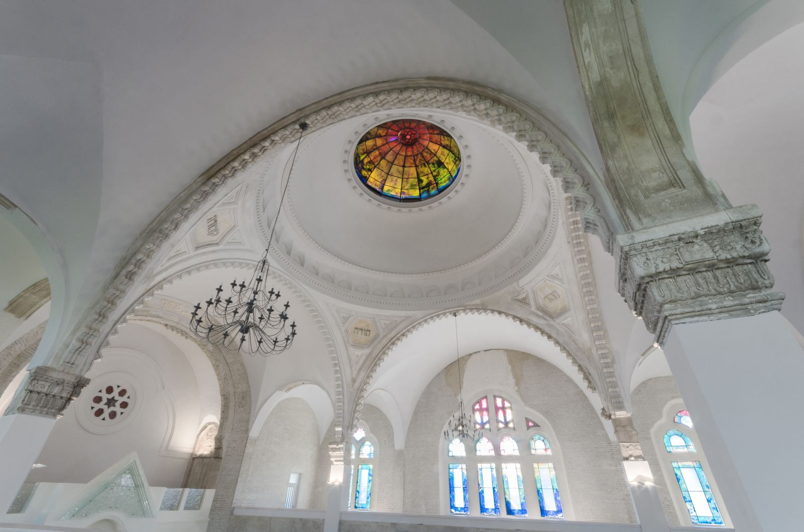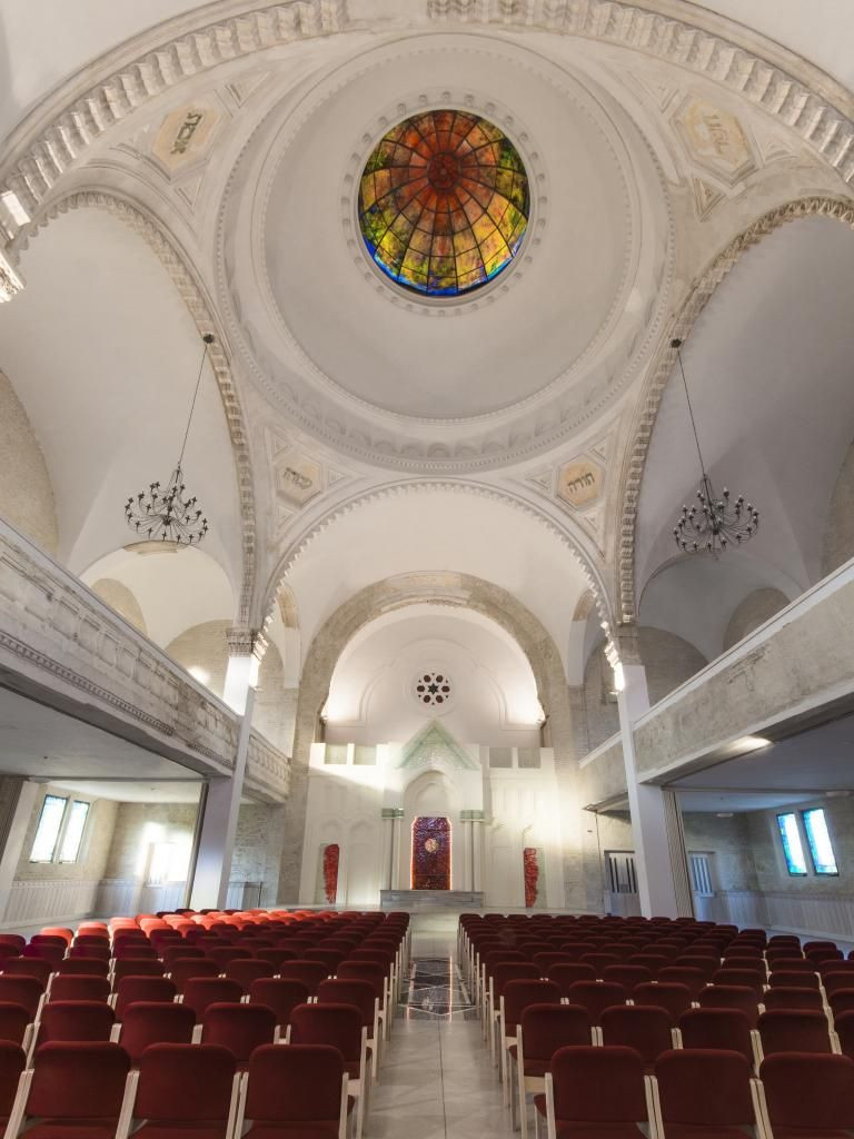 Původní zachovalá hmota byla doplněna novými prvky, výrazné jsou především barevné skleněné výplně a další skleněné prvky, například na oltáři. V něm však chybí tóra, takže budova není považována za svatostánek a je možné ji využívat k různým účelům. Důležitým dekorativním prvkem je kopule, která se kvůli odvětrávání hlavního sálu musela dokonce o pár centimetrů zvednout.