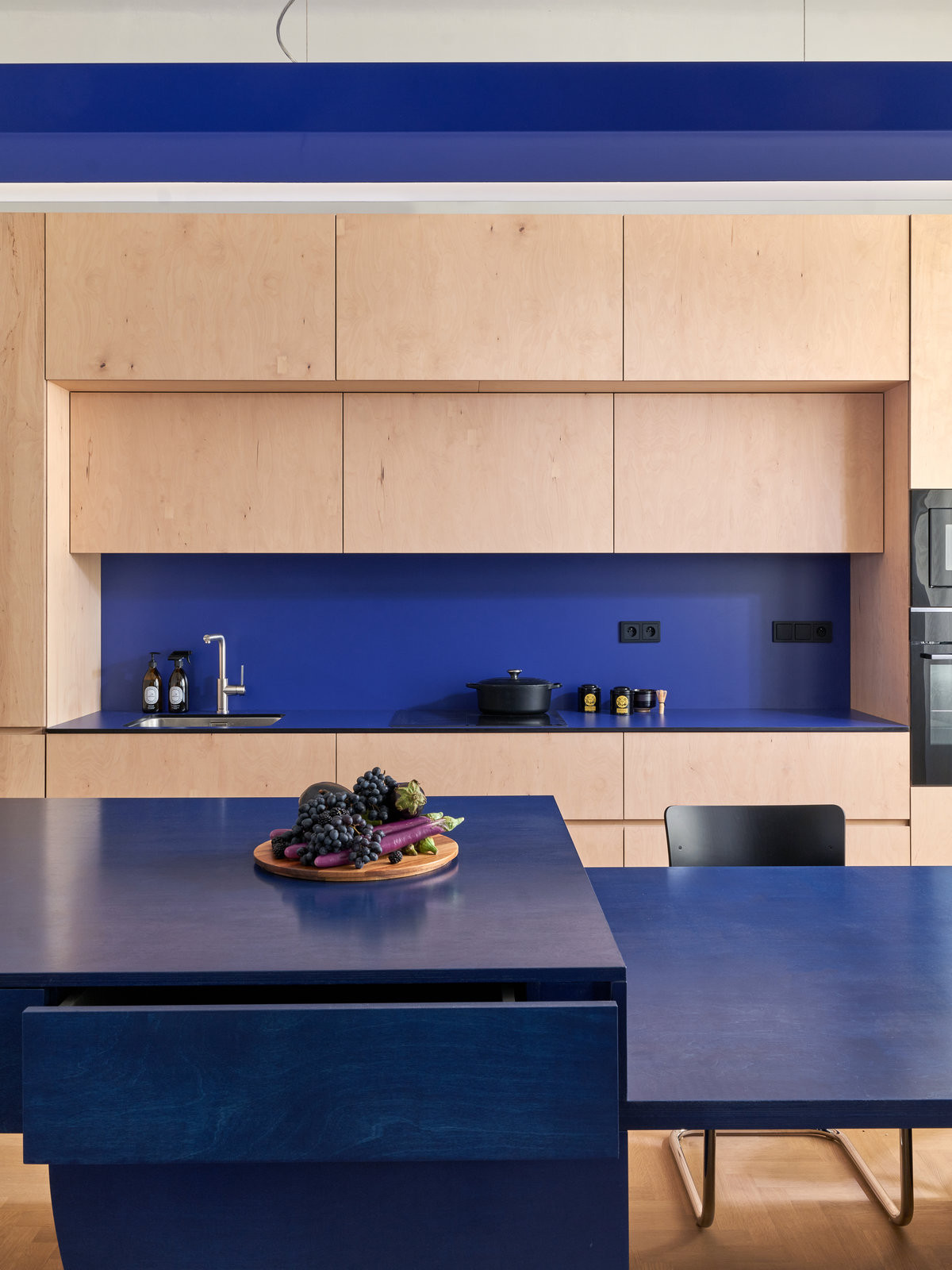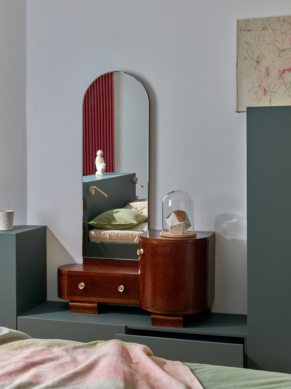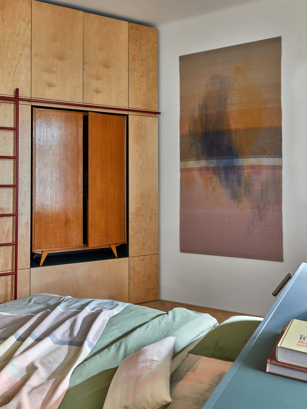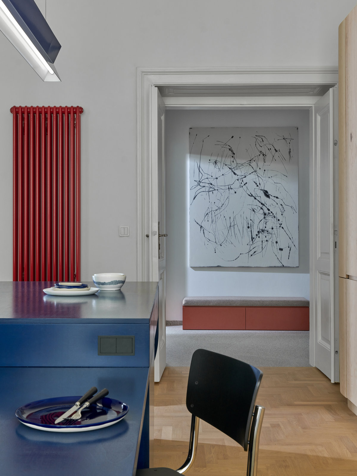 Kromě toho jsou v v interiéru i další výrazné autorské kusy nábytku: modrý kuchyňský ostrůvek, svítidlo, šedo-zelená postel v ložnici. Výrazné tvary a barvy se kombinují s obrazy, objekty ze skla, textilu, či výrazným kobercem. „Výtvarná stránka je pro nás důležitá a rádi zapojujeme kromě vlastních návrhů i výtvarná díla našich kolegů,“ říká Andrea Sobotková.
