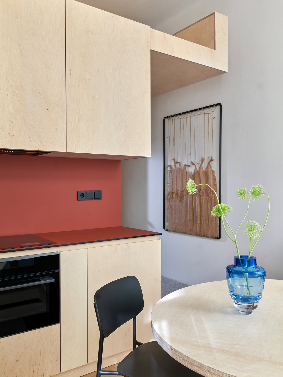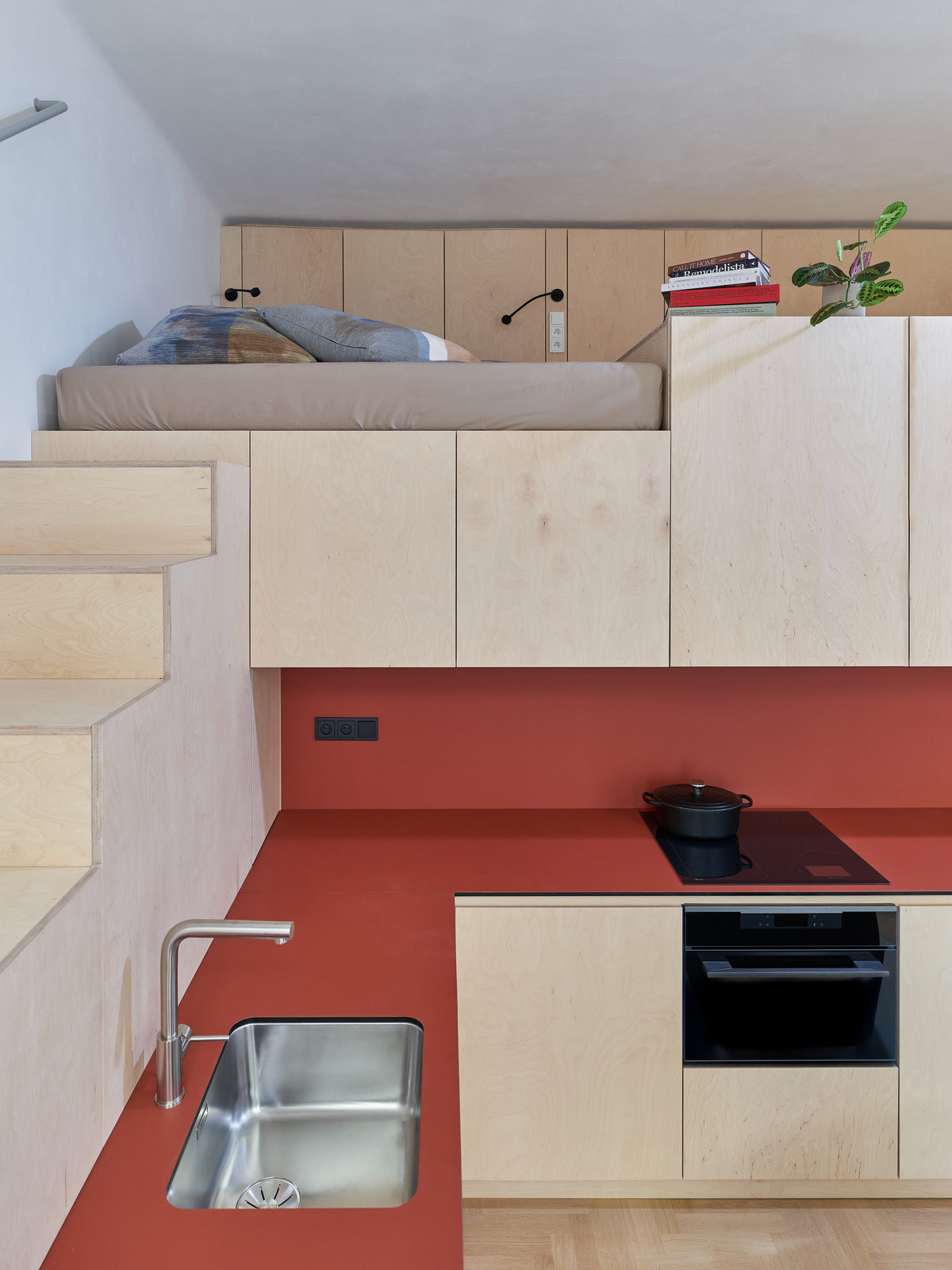 Ze vstupní haly vedou ještě jedny dveře. Tam, kde dřív byla druhá kuchyně, je teď samostatná garsonka. Má jen 27 m2, ale 3,6 metrů výšky, a tak se tam vešlo vše potřebné. Je tu kuchyně s malým obývákem, spaní na patře a pod ním koupelna. Opakují se tu stejné barvy a materiály jako ve velkém bytě.