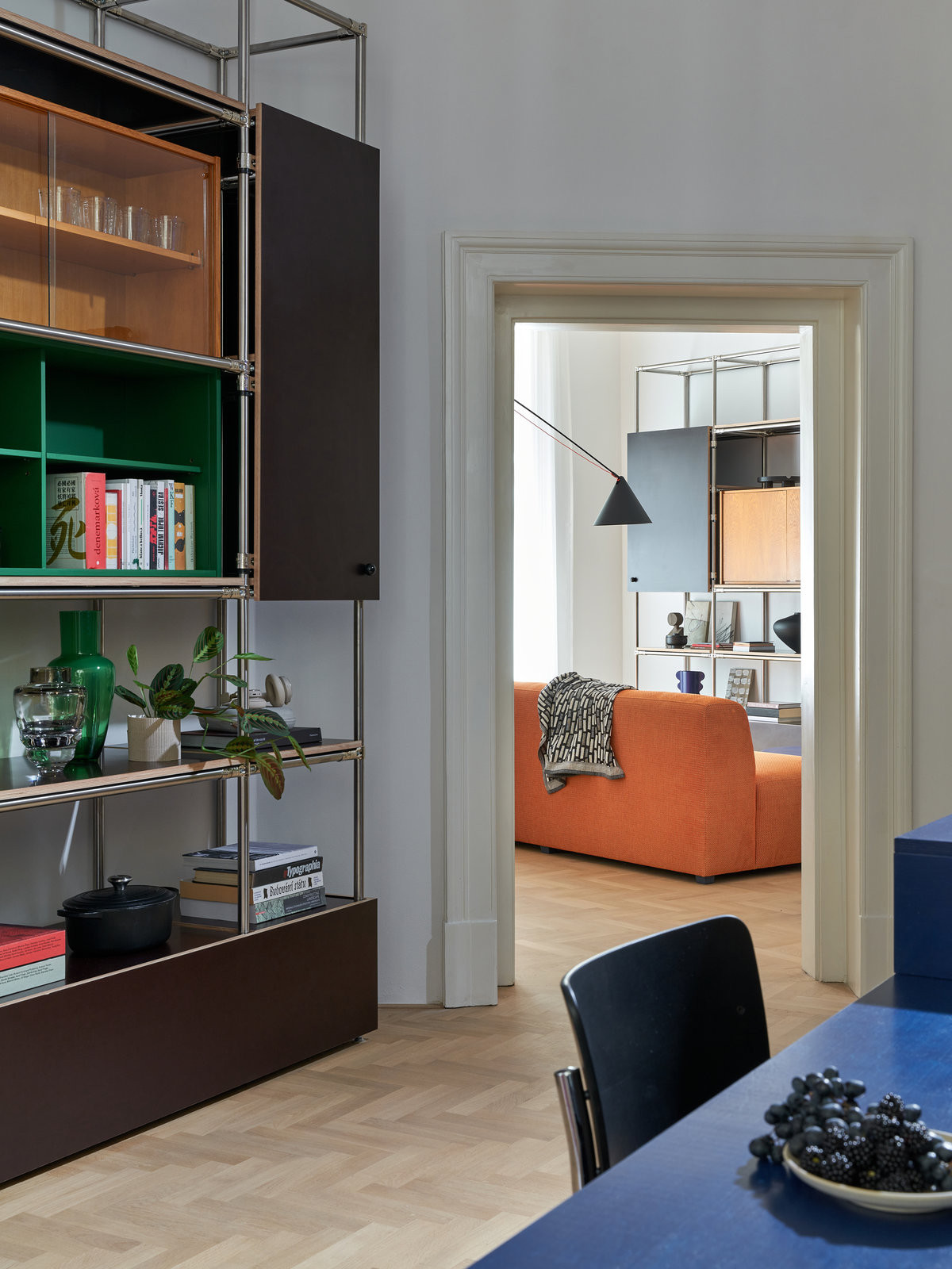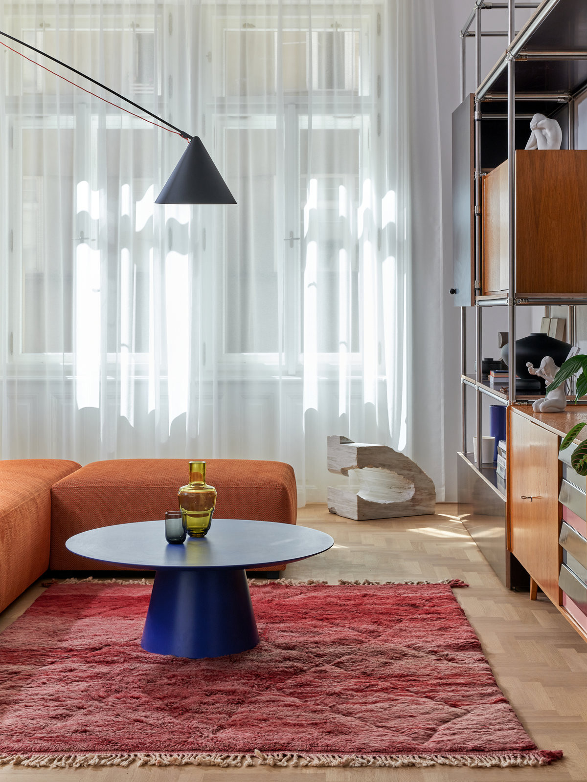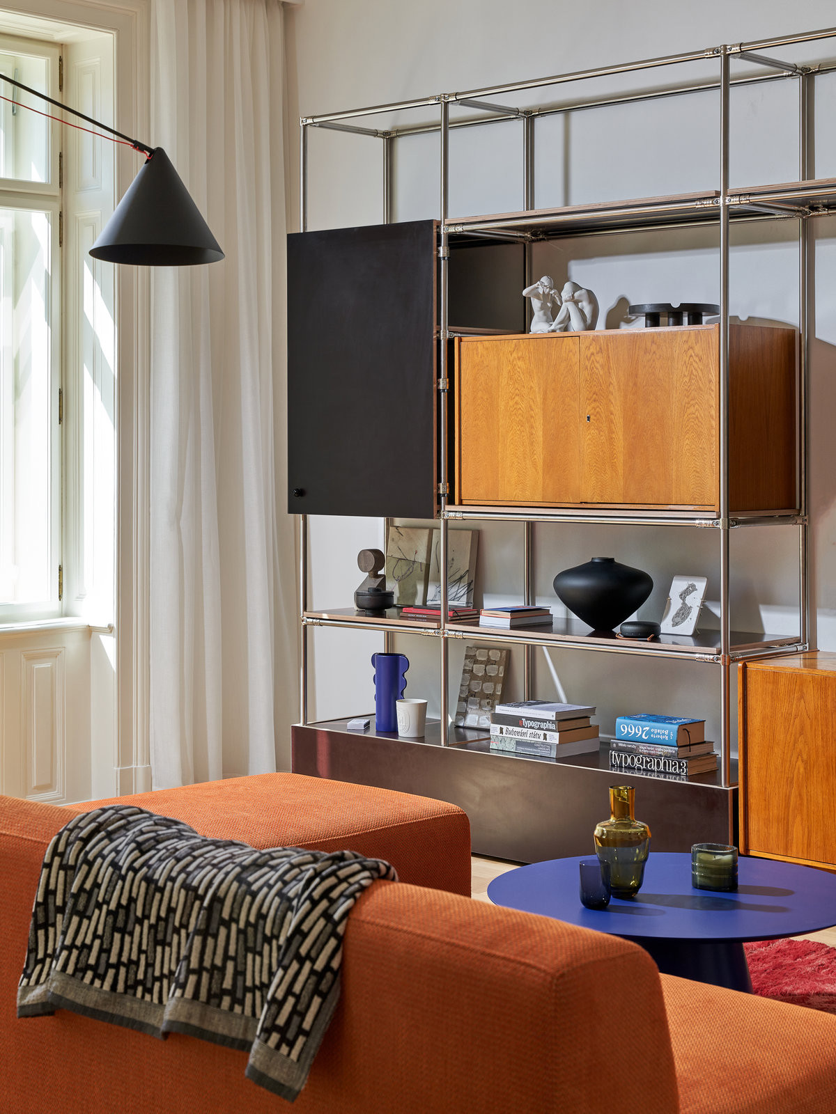 Do bytu se vchází rozlehlou halou. Odtud vedou dveře do obývacího pokoje s „rozvětvenou“ oranžovou pohovkou, která zabydlí rozlehlý obývák. V něm je ještě jeden staronový prvek – staré kusy nábytku zrepasované a vložené do ocelového rámu, jakási nábytková koláž. Podobné kusy najdeme i v dalších místnostech, do koláží je zapojená stará skříň i toaletka. Autorkou originálních sestav je Andrea Sobotková: „Některé kusy nábytku, které jsme v bytě našli, byly skoro nepoužívané. Byla by škoda se jich zbavovat,“ říká.