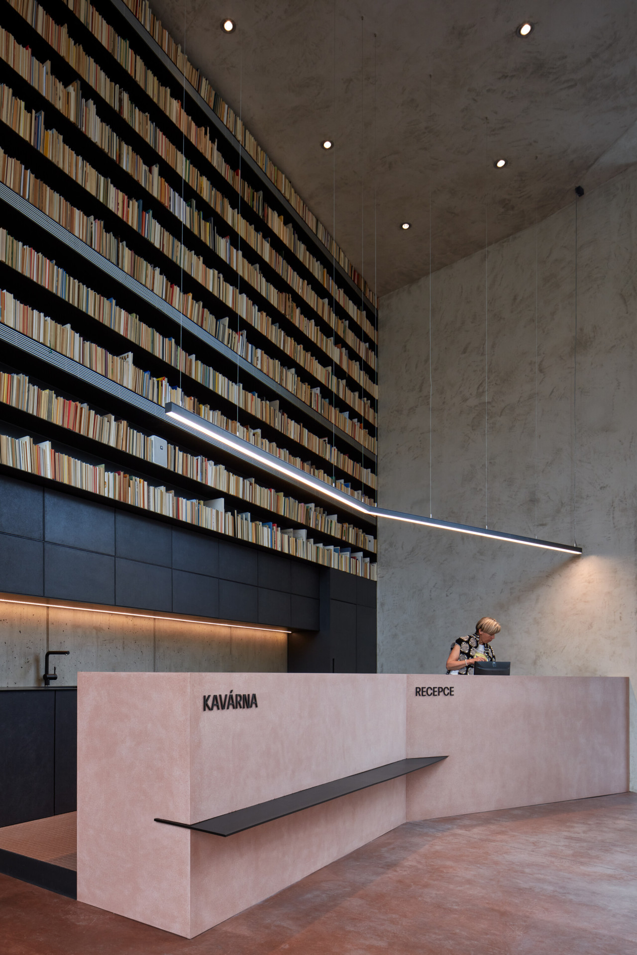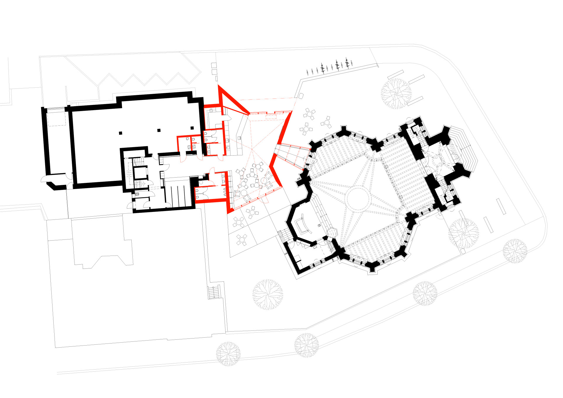 Nová kulturní náplň kostela potřebovala řádné provozní a sociální zázemí, to se ovšem do původní hmoty kostela nevešlo. Architekti se chtěli vyhnout nekoncepčním zásahům a přístavbám kostela, které by narušili jak jeho vnitřní prostor, tak jeho výraz a siluetu z přední strany. Rozhodli se tedy pro přístavbu za kostelem, mezi jeho hlavní lodí a ředitelstvím knihovny. A jelikož spolu oba provozy úzce souvisí, stala se přístavba spojujícím článkem obou objektů, obsahující vstupní prostor s recepcí a kavárnu. Díky odstranění oplocení se navíc z okolí kostela stala veřejná piazzetta s mobiliářem a zelení.