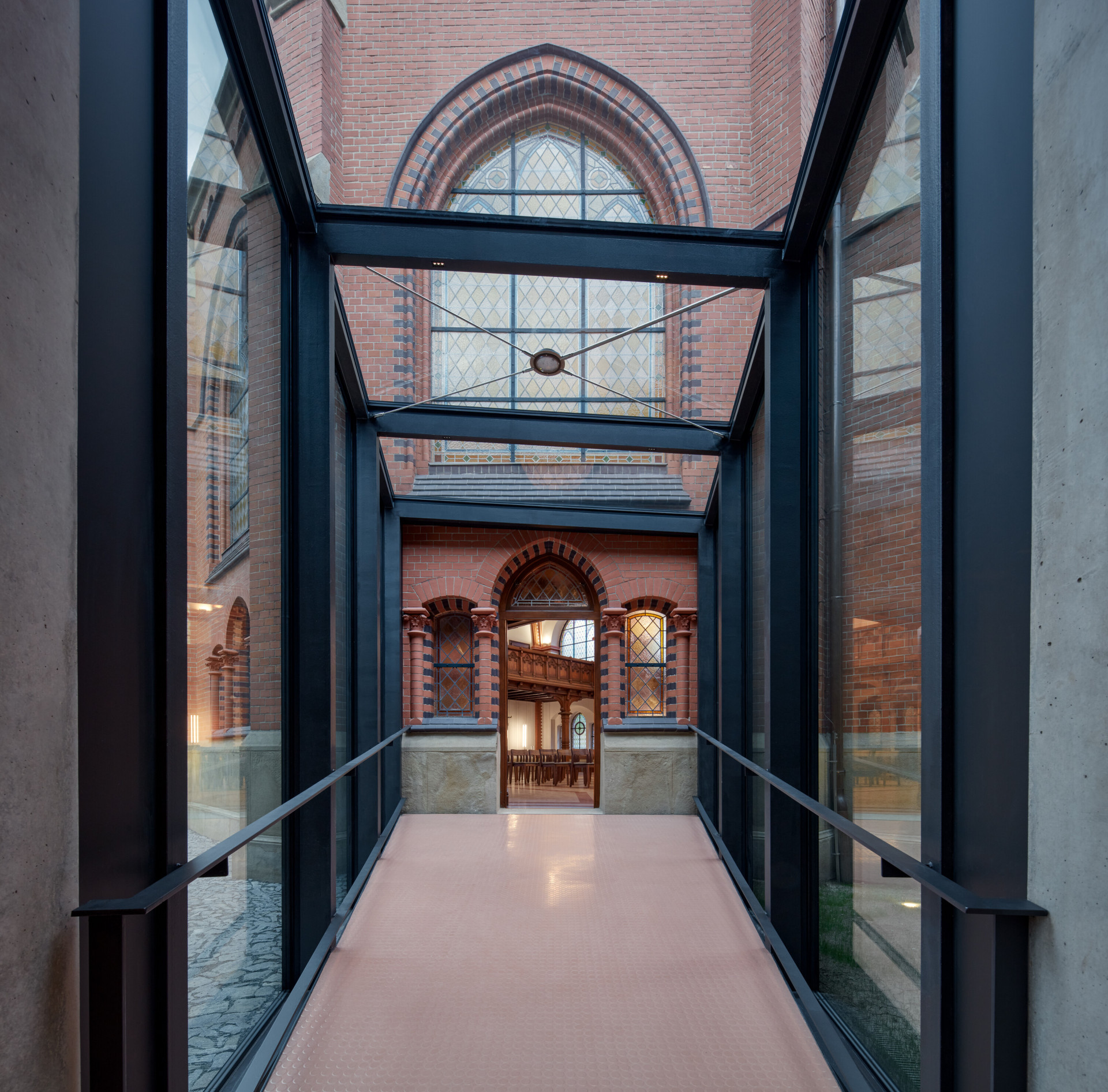 Nová přístavba tak nejen logicky a funkčně propojuje související provozy, zároveň do areálu vstupuje radikálně a kontextuálně zároveň. Radikálně ve smyslu materiálové, konstrukční a výrazové odlišnosti, kontextuálně ve smyslu urbanistické situace a charakteru, který na neogotickou formu navazuje půdorysným členěním. Interiéru přístavby dominuje beton. Na detailní návrh a výběr interiérových prvků si architekti přizvali Denisa Strmiskova Studio, se kterým společně specifikovali všechny materiály a povrchy interiérů. Nalezneme zde tudíž nespočet zajímavých detailů a originálních kusů nábytku a osvětlení.