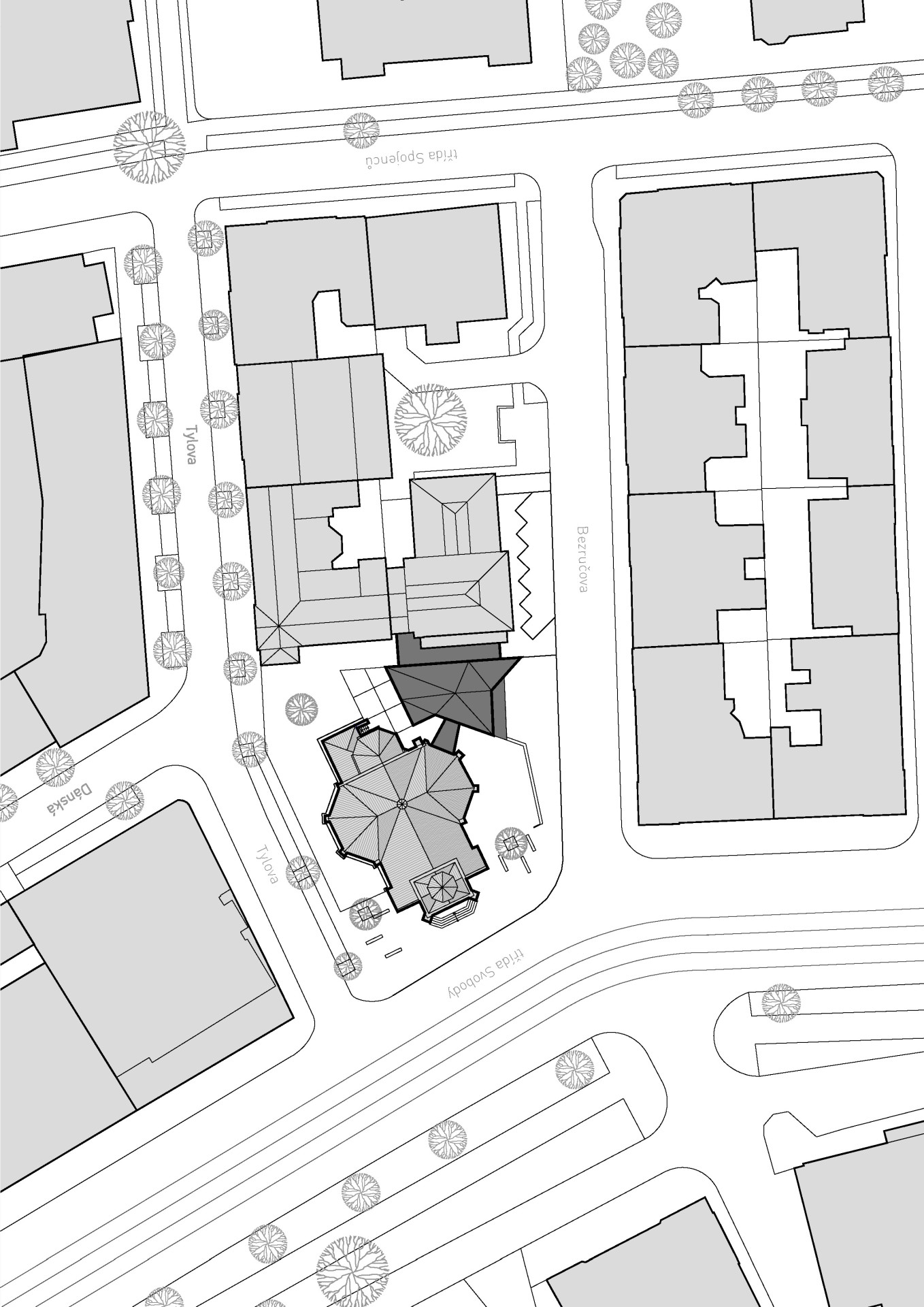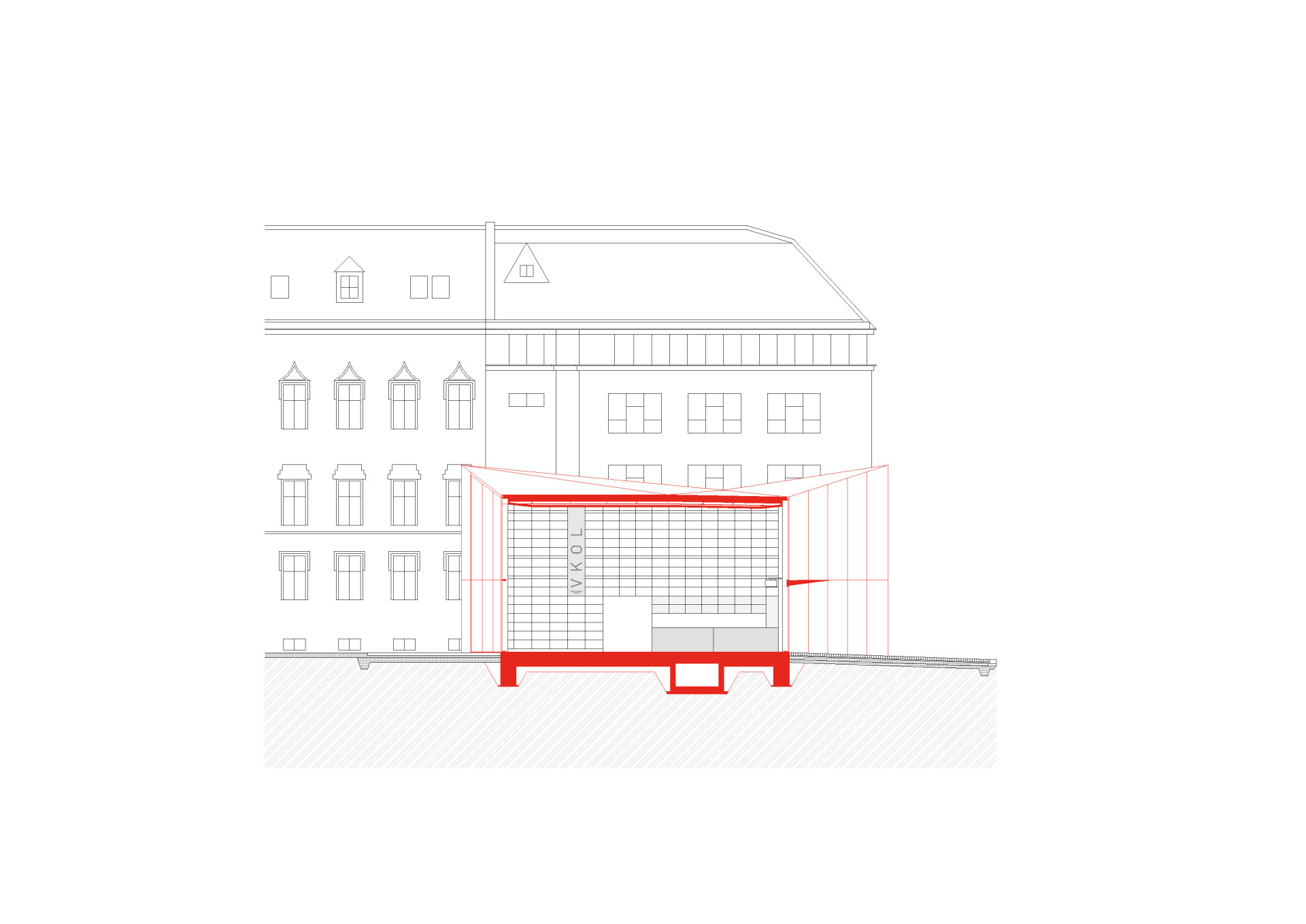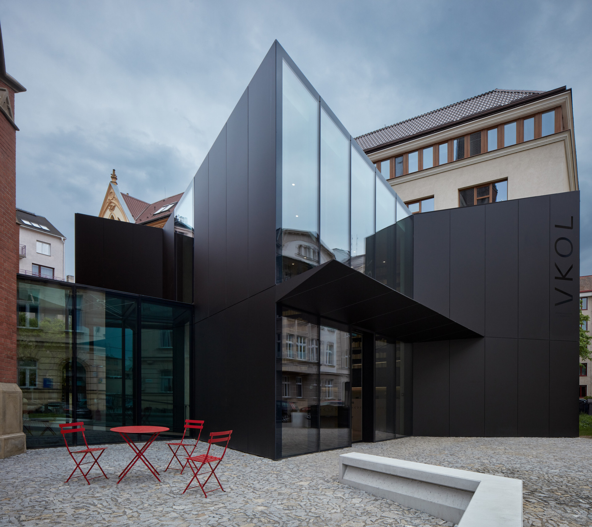 „Přístavba respektuje uliční čáru ulice Bezručovy a udržuje si dostatečný odstup od obou stávajících staveb,“ popisují koncept přístavby architekti. „Krystalická hmota nového objektu reaguje na neogotickou formu Červeného kostela. Rovněž půdorysná stopa nové části vychází z jeho půdorysného členění. Půdorys je výřezem části podlahy kostela a je vysunutý mimo původní platformu. Fasády i střecha objektu jsou provedeny z černého hliníkového sendvičového plechu.“