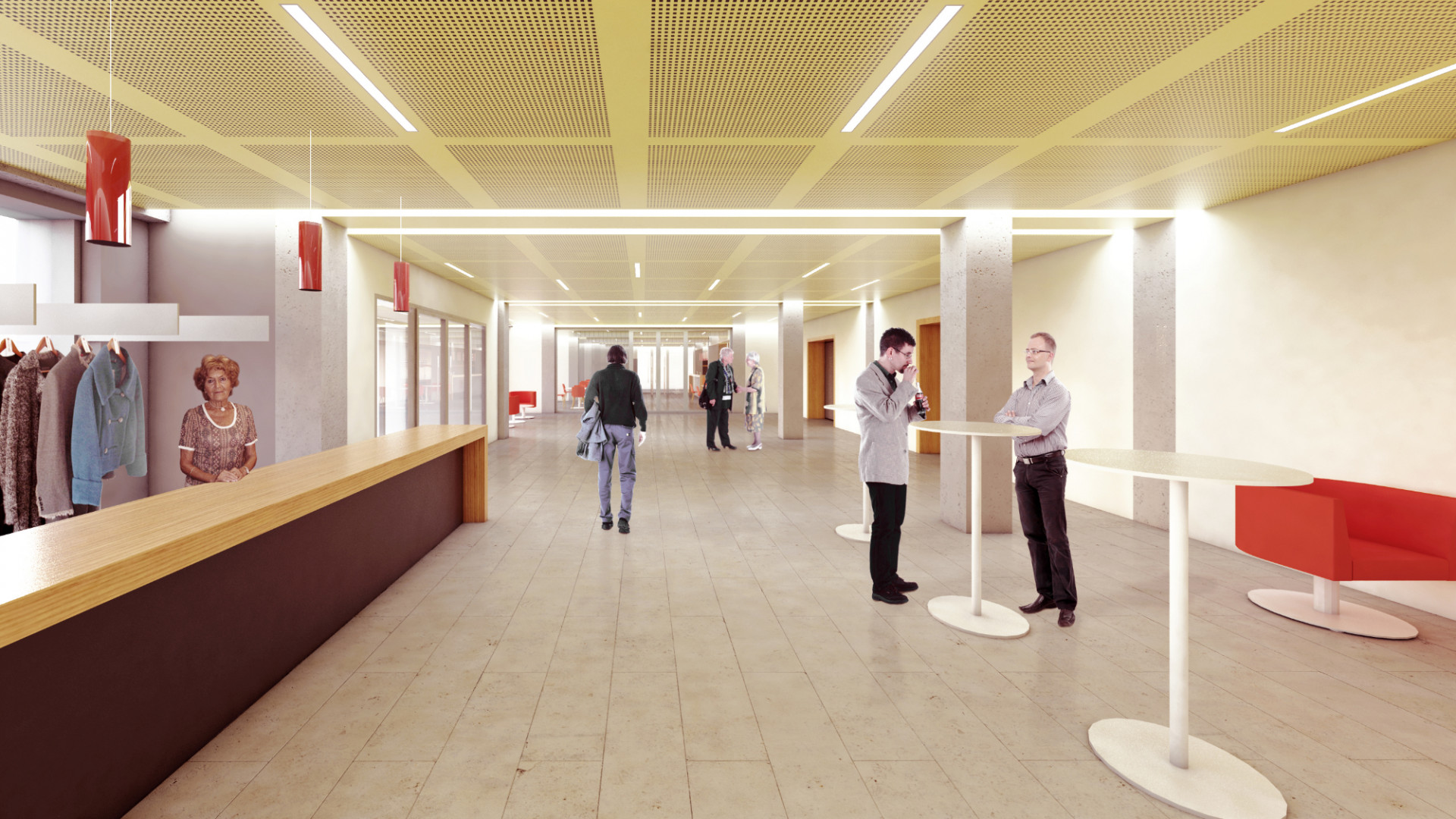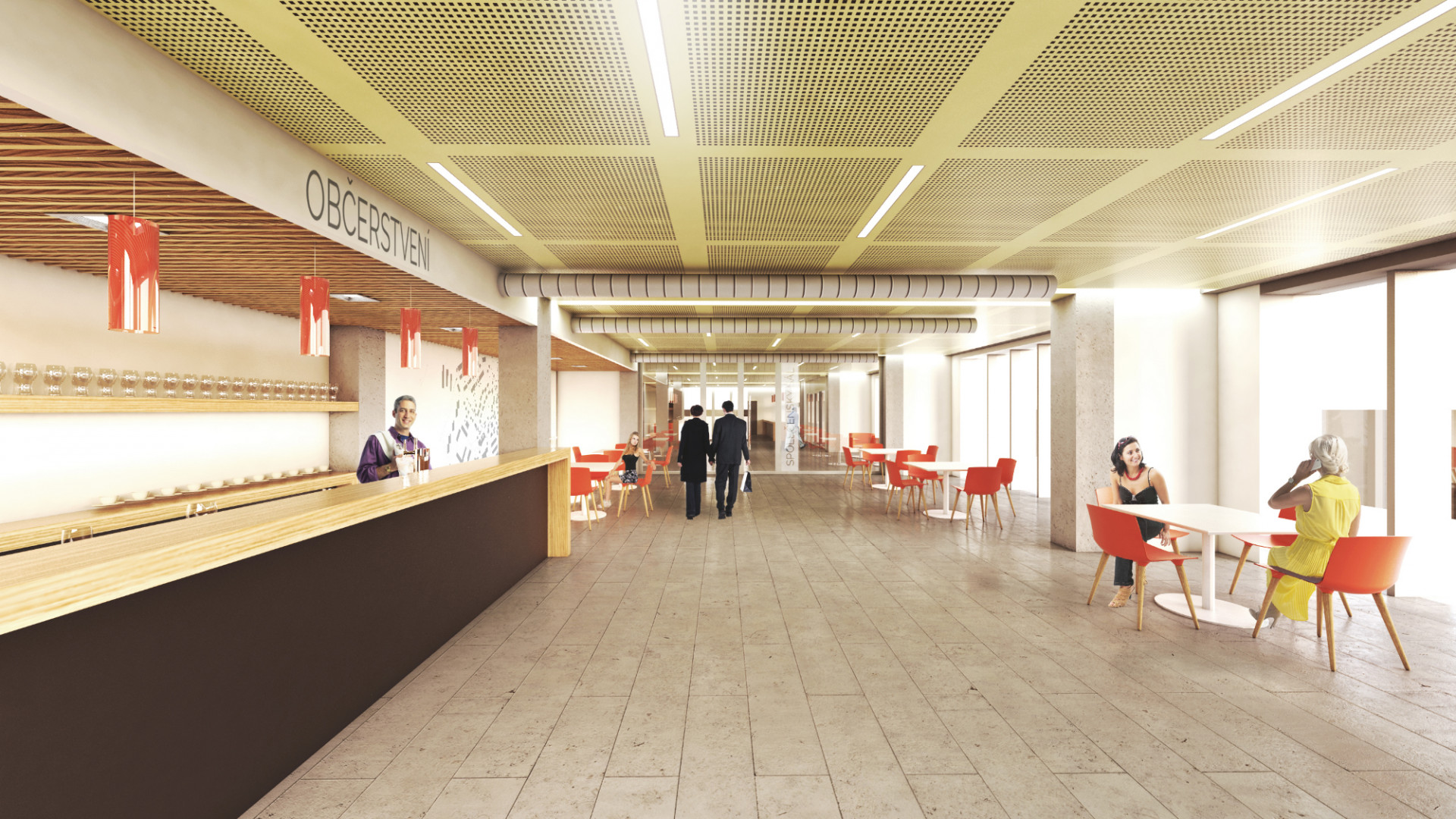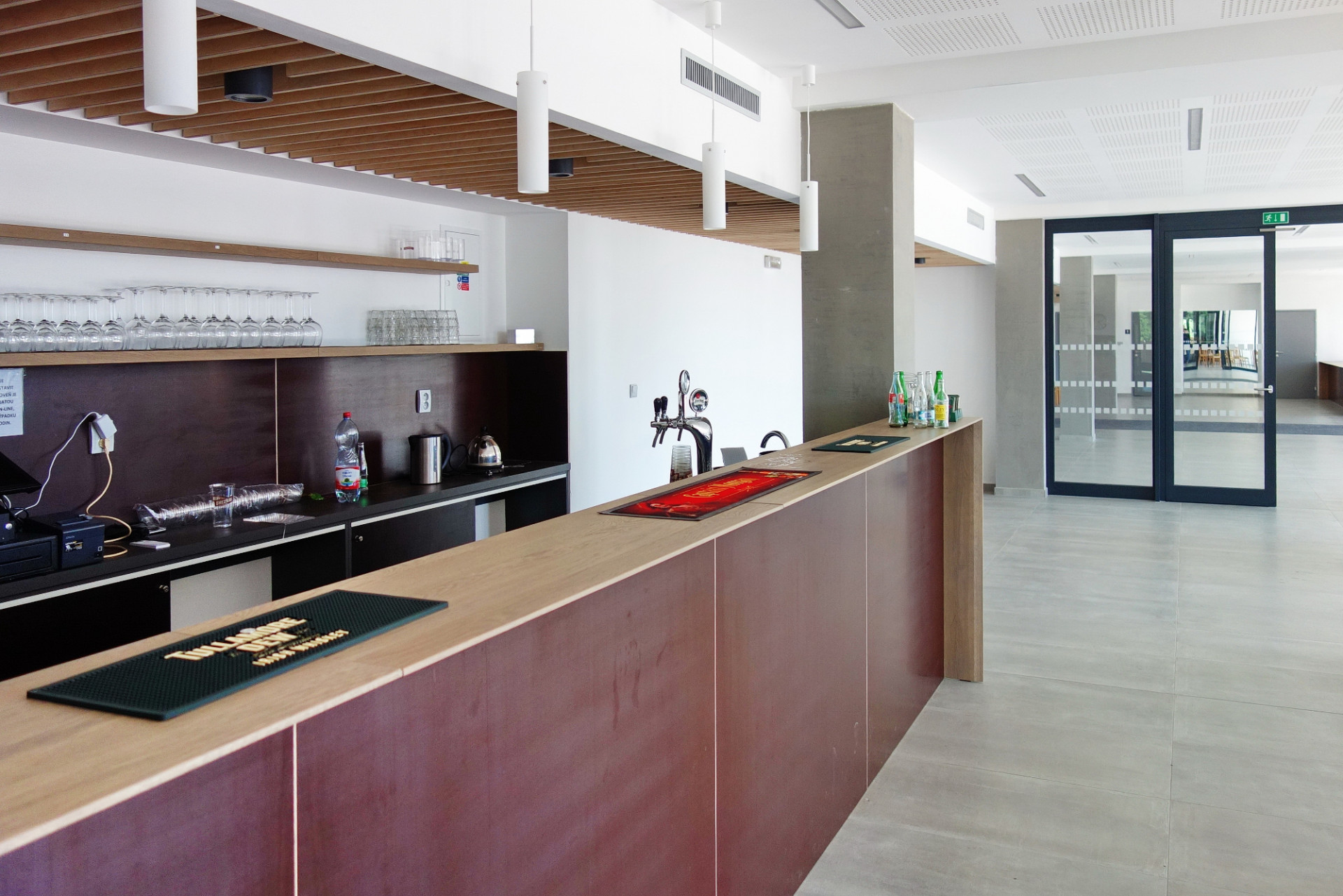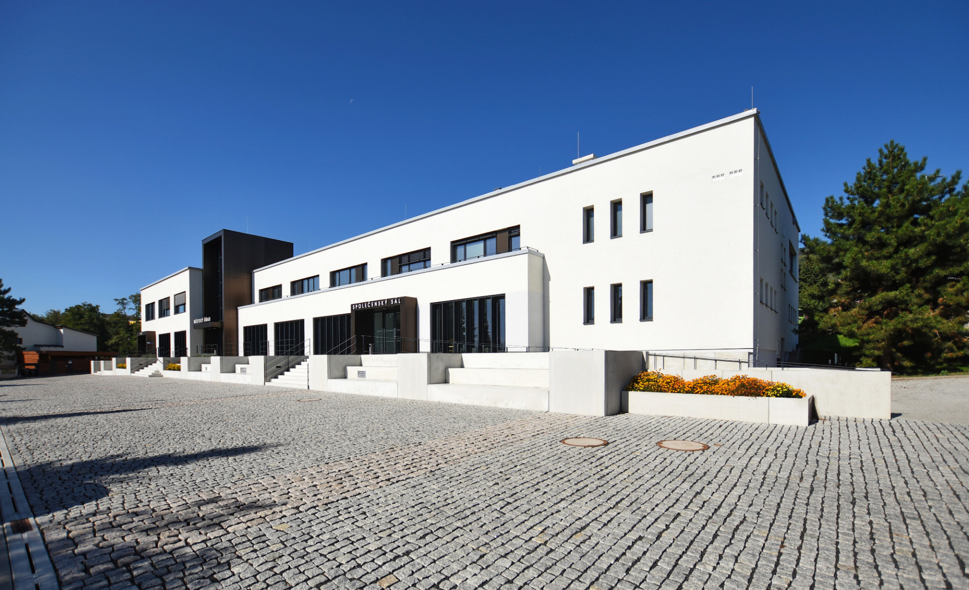Kompletní modernizací prošly také interiéry včetně změny dispozic a výměny domovní technologie. Součástí obnovy byl i prostor společenského sálu, kde bylo potřeba věnovat zvýšenou pozornost akustice. Projektanti pracovali s akustickým stropním podhledem a akustickými obklady stěn. Úprav se dočkala také vstupní terasa a přilehlé náměstí, kde asfaltovou plochu parkoviště nahradila dlažba.