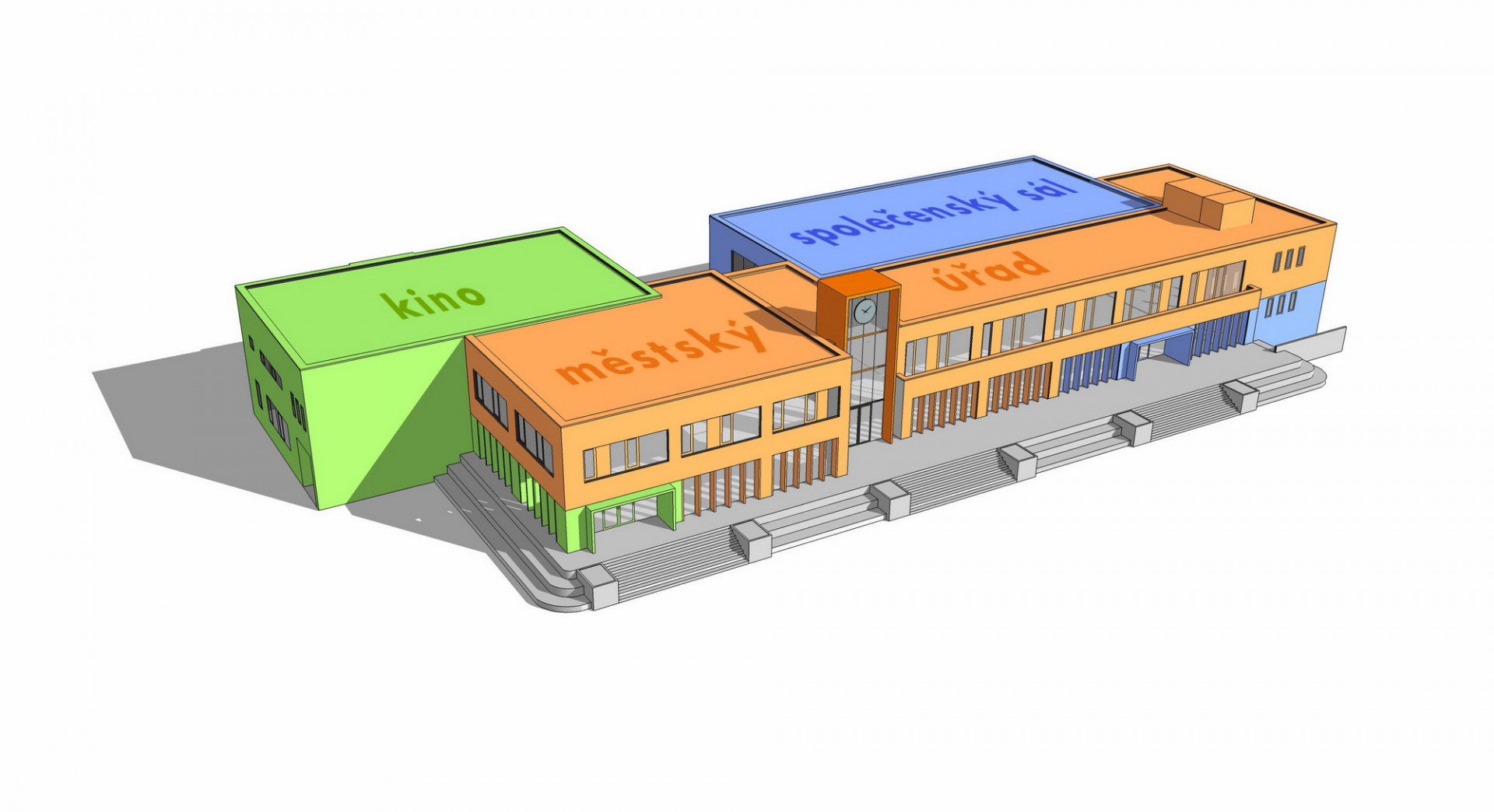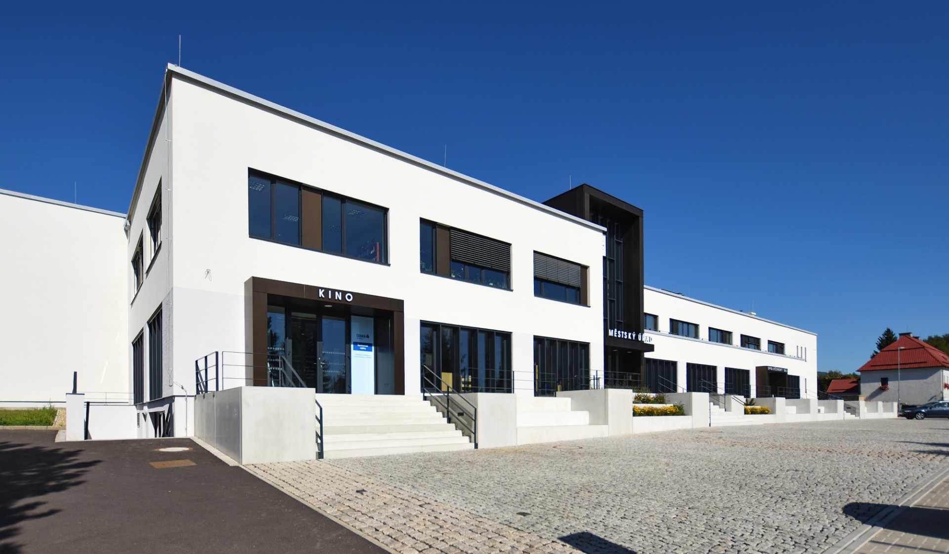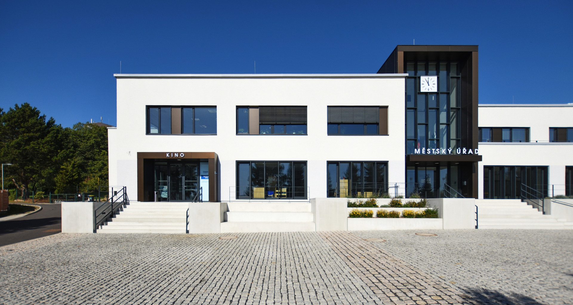 Architekt Ondřej Tuček do místa styku budov vložil vertikální hmotu, která zcela změnila kompozici celku. Soubor budov tak získal na první pohled čitelnou hierarchii s jasně artikulovanými vstupy do jednotlivých částí. Nový prvek tvoří věž s hodinami, kam autoři logicky umístili hlavní vstup do městského úřadu se schodišťovým prostorem s výtahem. Nová dominanta se odlišuje jak ve hmotě, tak v barevnosti a materiálovém provedení. K hladkým bílým omítkám nižších horizontálních hmot zvolil architekt kontrastní povrch v podobě hliníkového obkladu v tmavém měděném odstínu. Vstupy do dalších částí budovy – kina a společenského sálu – akcentují předsazené portály rovněž s obkladem z hliníkových kompozitních desek.