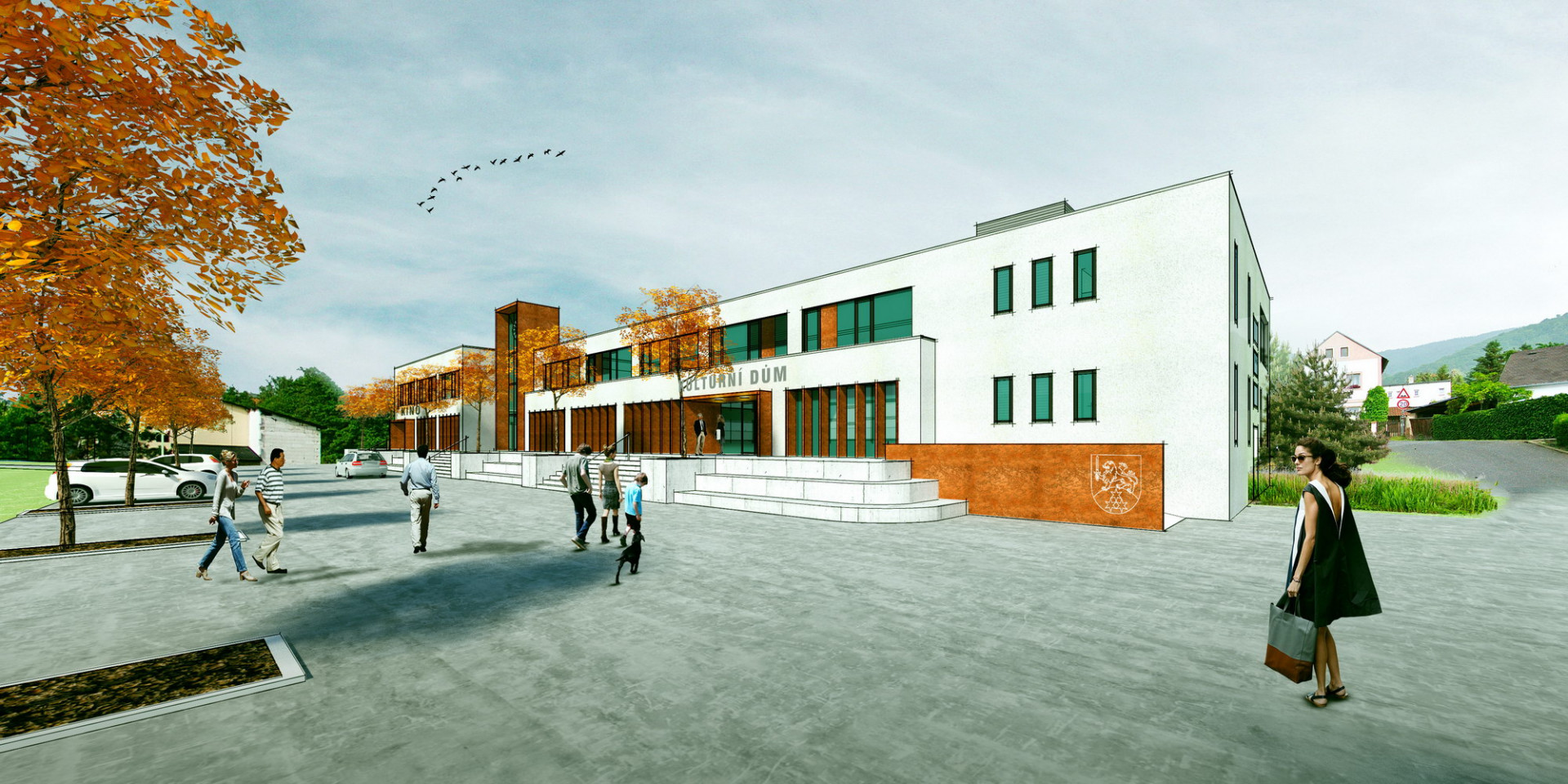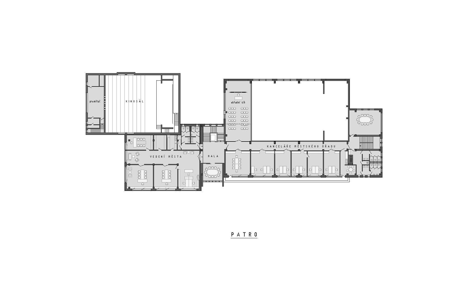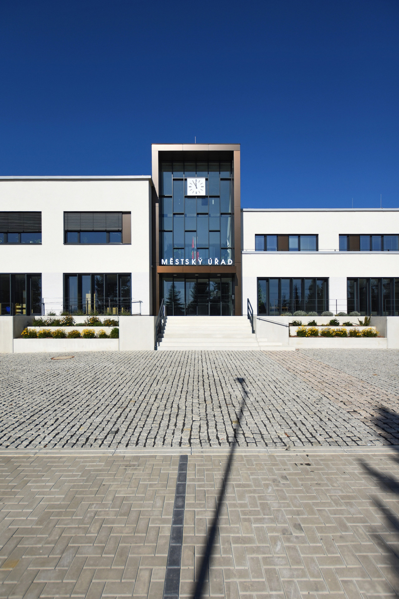 Architekt Ondřej Tuček do místa styku budov vložil vertikální hmotu, která zcela změnila kompozici celku. Soubor budov tak získal na první pohled čitelnou hierarchii s jasně artikulovanými vstupy do jednotlivých částí. Nový prvek tvoří věž s hodinami, kam autoři logicky umístili hlavní vstup do městského úřadu se schodišťovým prostorem s výtahem. Nová dominanta se odlišuje jak ve hmotě, tak v barevnosti a materiálovém provedení. K hladkým bílým omítkám nižších horizontálních hmot zvolil architekt kontrastní povrch v podobě hliníkového obkladu v tmavém měděném odstínu. Vstupy do dalších částí budovy – kina a společenského sálu – akcentují předsazené portály rovněž s obkladem z hliníkových kompozitních desek.
