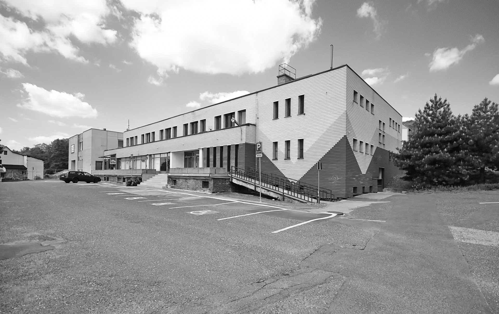 Novému vnímání budovy napomohlo také přeformátování některých okenních otvorů. Jejich původní kompozici autoři v principu zachovali. V patře však sdružili stávající okenní otvory do větších dělených oken v tmavě šedých plastových rámech. V přízemí rovněž pracovali s větší plochou zasklení, díky čemuž vnitřní prostory opticky lépe komunikují s přilehlým náměstím. Díky novému členění prosklených ploch s pravidelným rastrem hliníkových profilů Aluprof s vysokými krycími lištami z exteriérové strany získala hlavní fasáda budovy jasný řád. Použitá sloupko-příčková fasáda současně umožnila vytvořit úzkou pohledovou šířku předělů mezi jednotlivými poli výplní. Fixní zasklení prosklených ploch místy doplňují vložené dveře. Tmavé plochy rámů i zasklení navíc kontrastují s bíle omítanými plochami fasád.