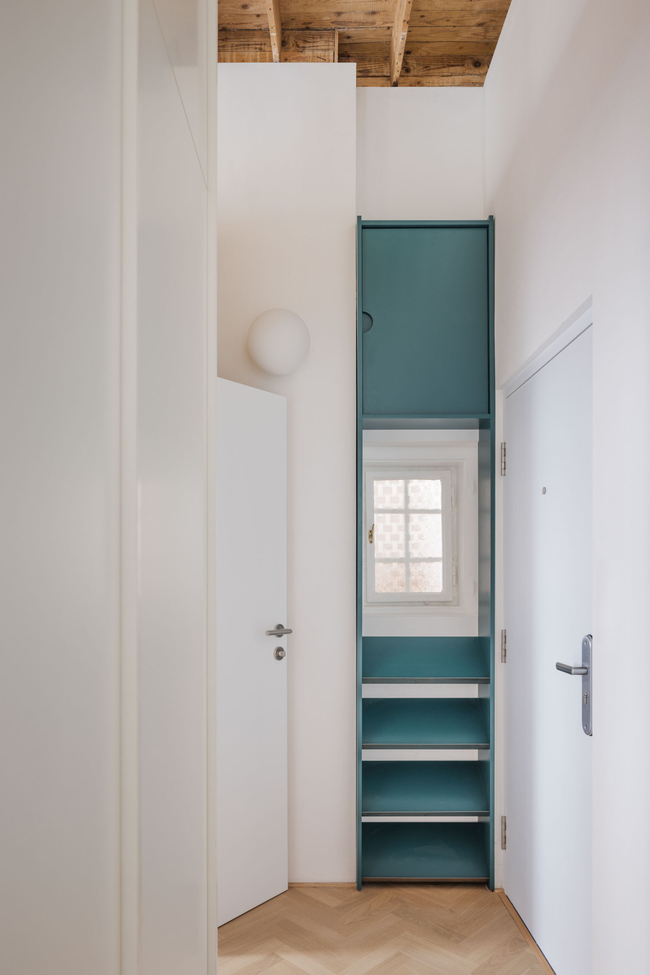 Místo, aby oddělili vstupní prostor od zbytku bytu příčkou, vytvořili architekti zádveří za pomoci delší šatní skříně mezi vstupem a ložnicí. Skříň na rozdíl od stěny nejde až ke stropu, do zádveří se dostává světlo a prostor může plynout.