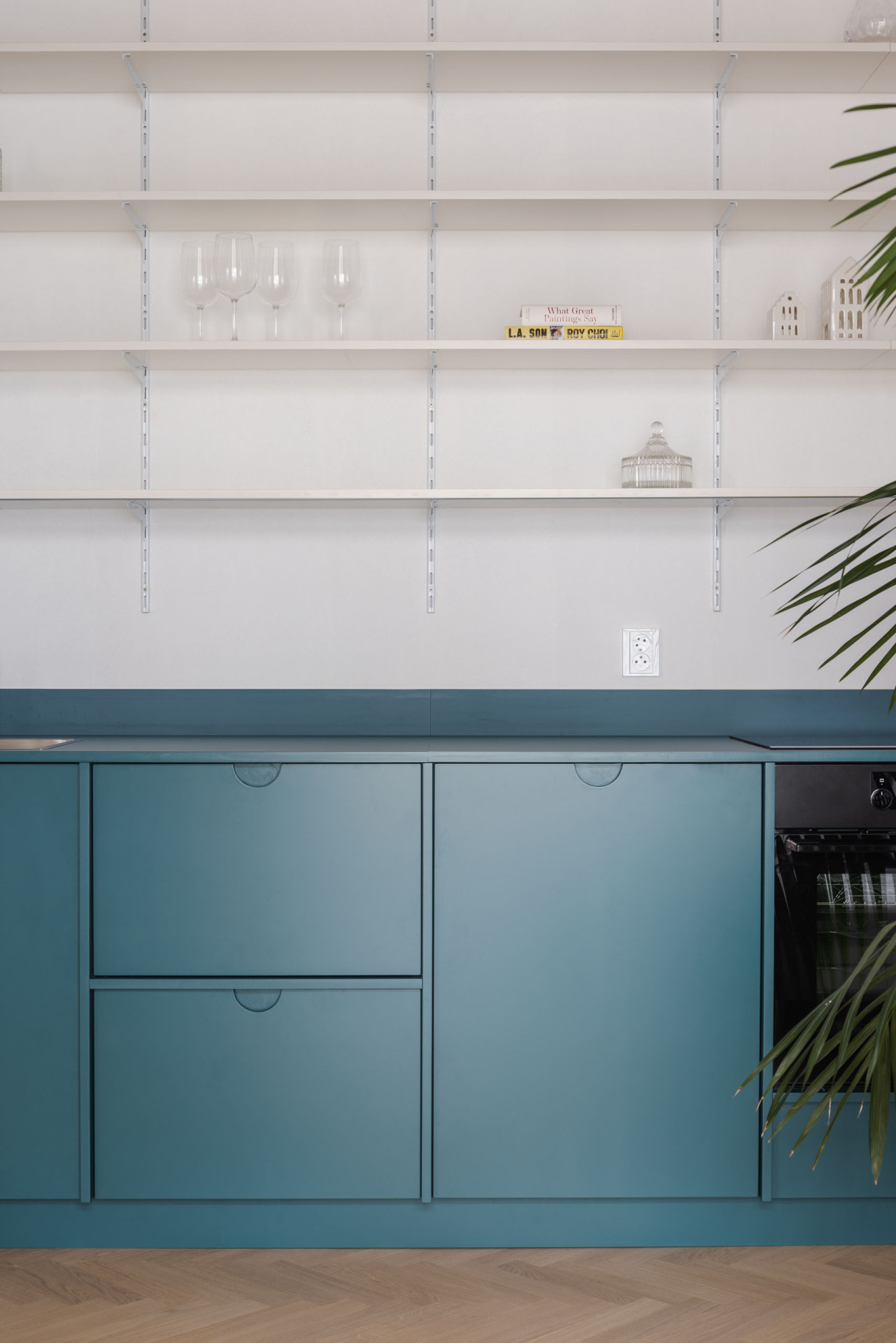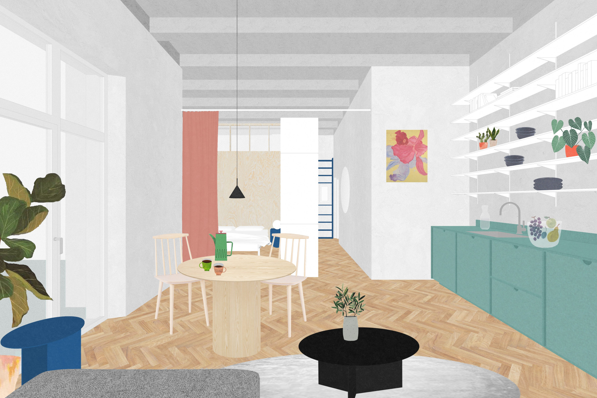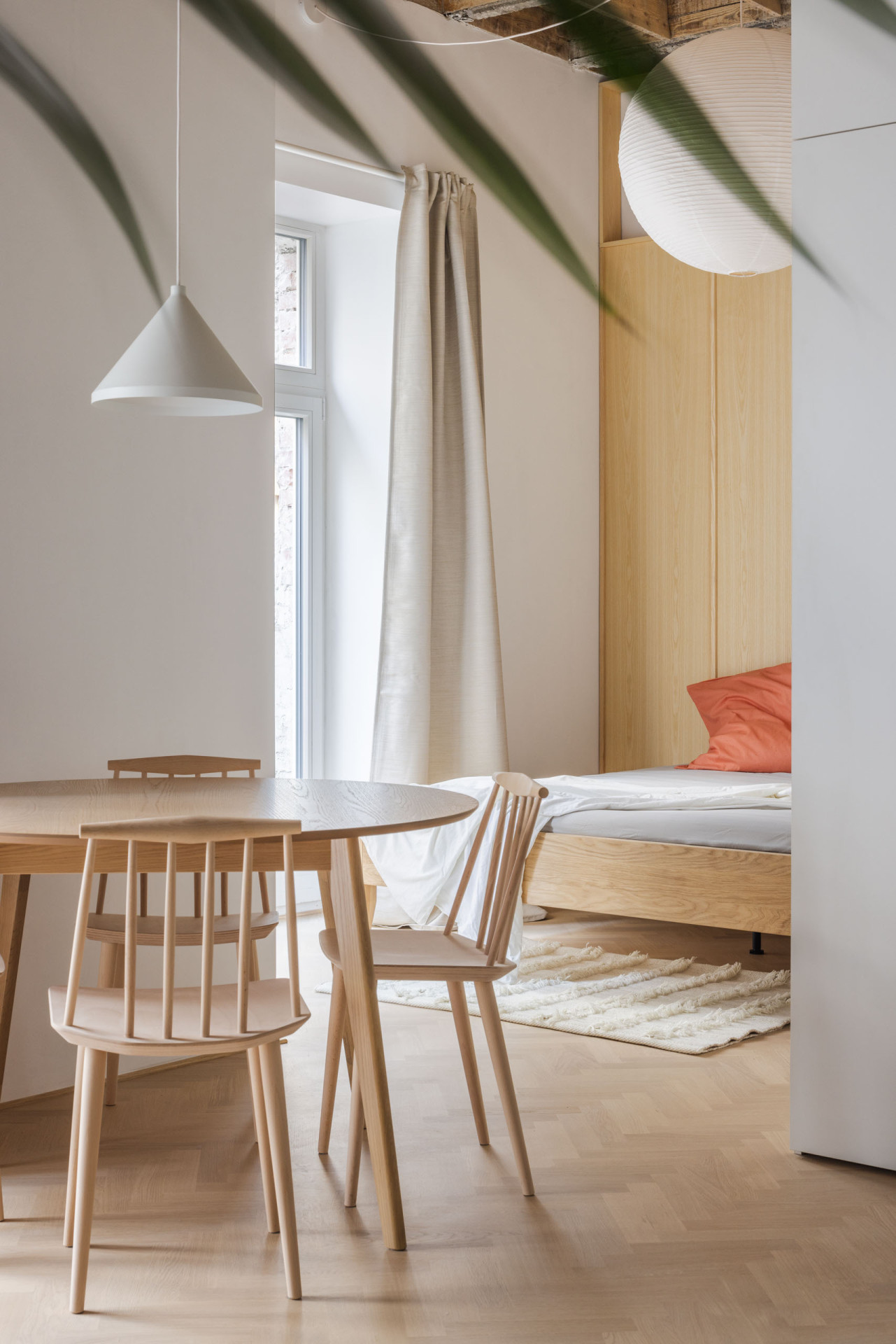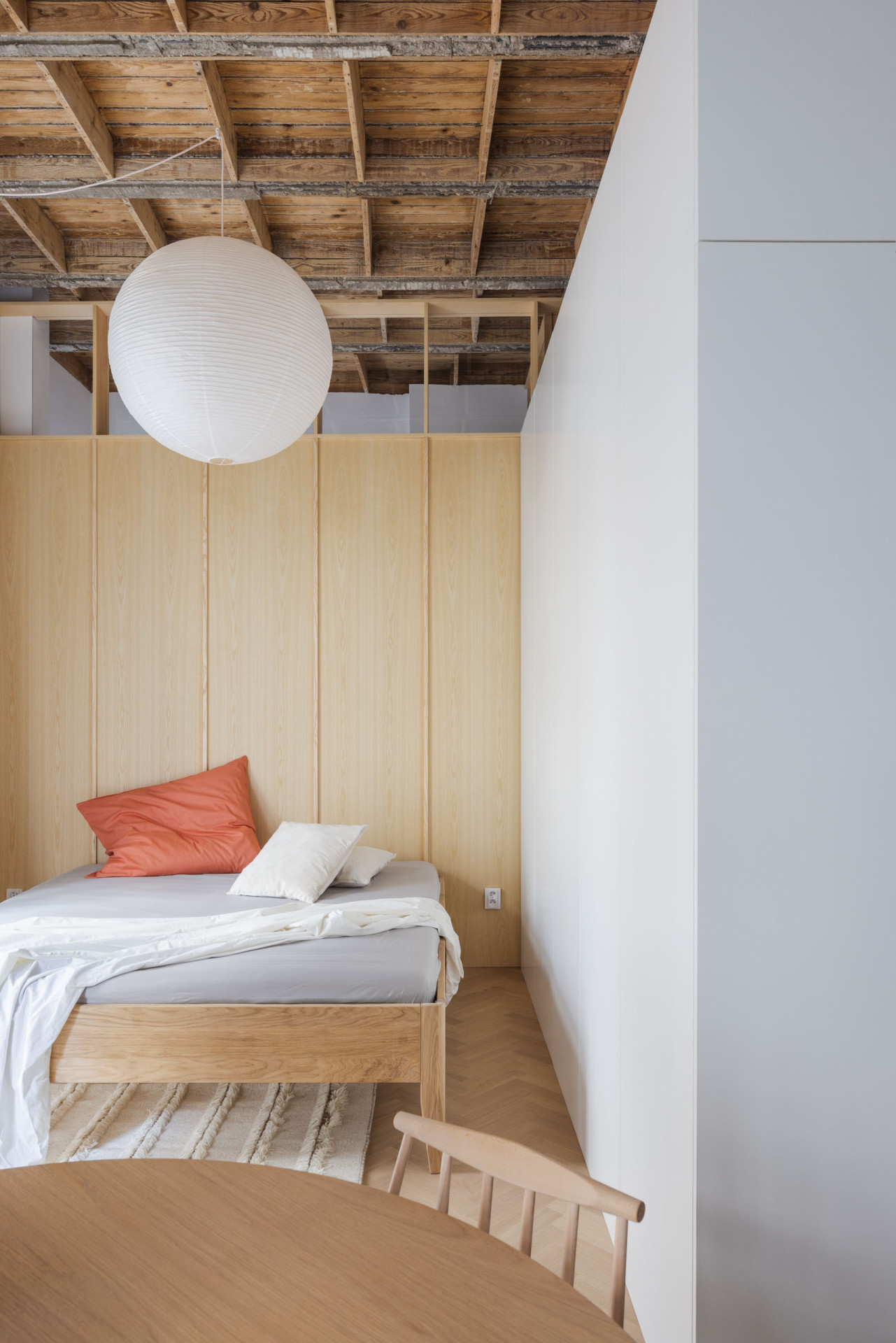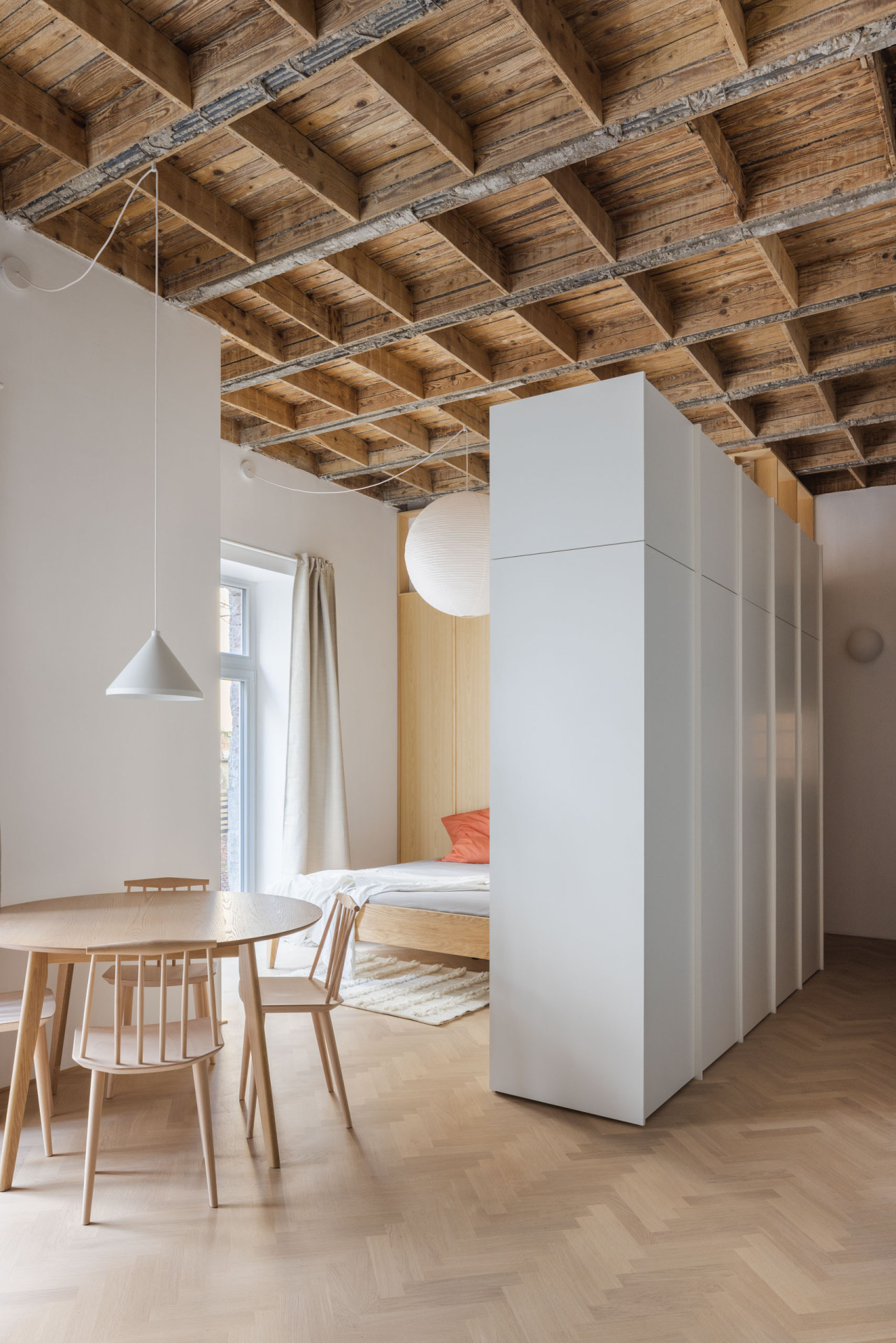 Atypický strop s jasným členěním se stal dominantním prvkem rekonstrukce, dodávající bytu ojedinělý charakter. Zbytek interiéru je – jak to autoři mají ve zvyku, doplněn o prvky jasných barevných odstínů, které mu dodávají na živosti, v kombinaci s dřevěnou podlahou a nábytkem. Ovšem všeho s mírou, a tak akorát, díky čemuž celý interiér, i přes svou živost, působí jednotně, uceleně a harmonicky.