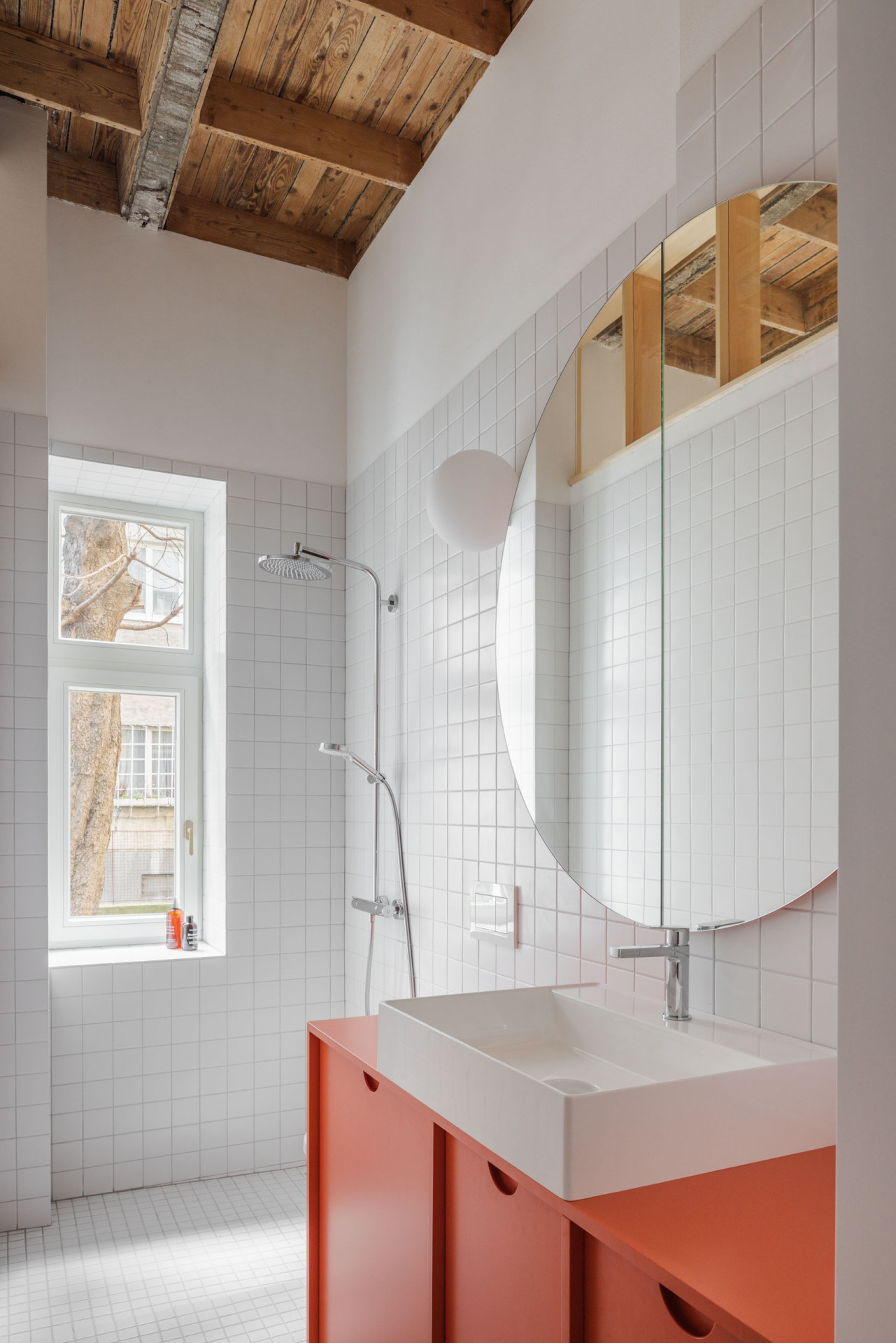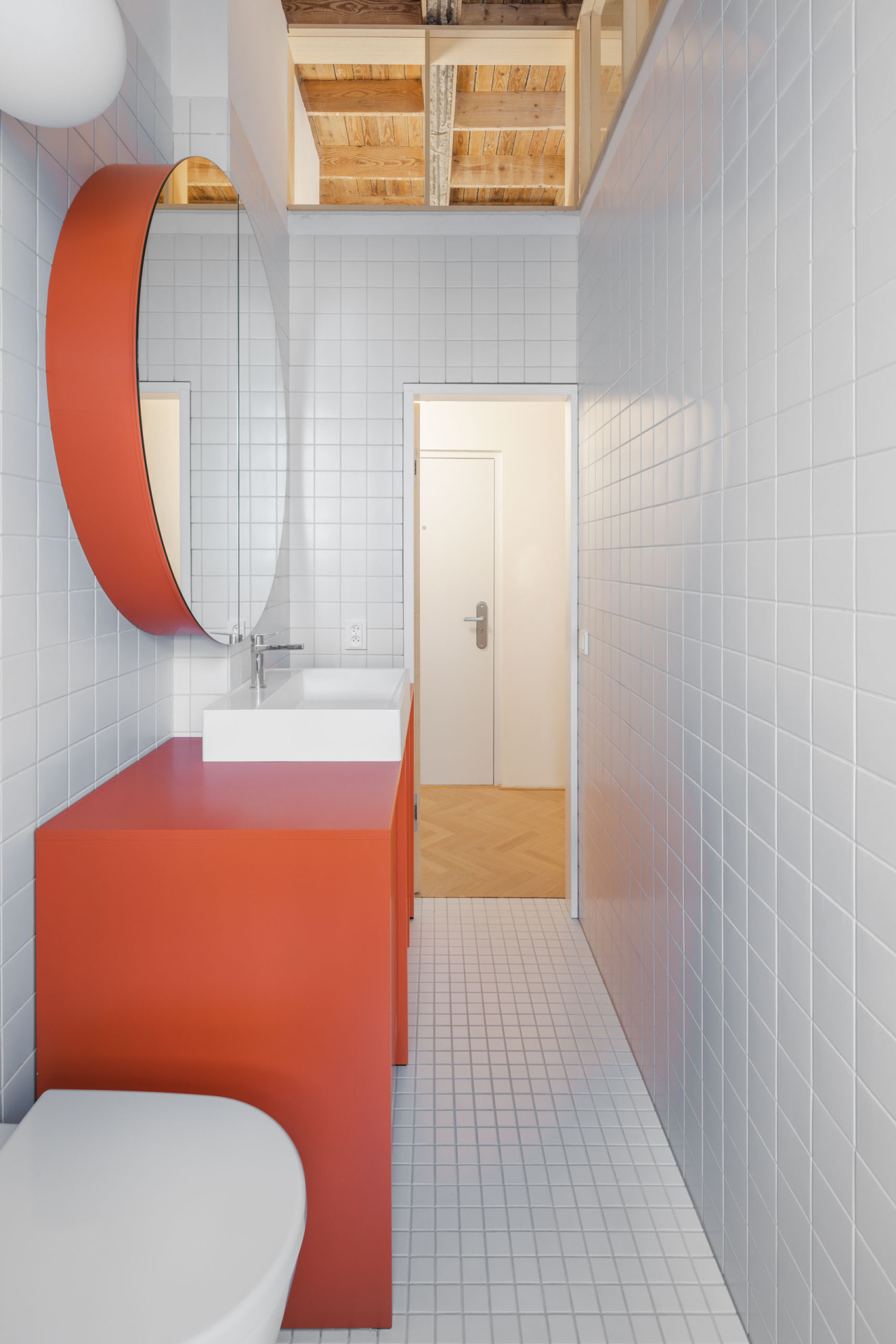 Zajímavého vylepšení a zvětšení se dočkala také koupelna. Ta je od ložnice oddělena dřevěnou příčkou s vrchním světlíkem. „Příčka v koupelně je u stropu zakončena celoplošným střešním oknem. Světlík přes den osvětluje prostor koupelny a chodby a v noci vytváří na stropě ambientní osvětlení,“ upřesňují Grau Architects.