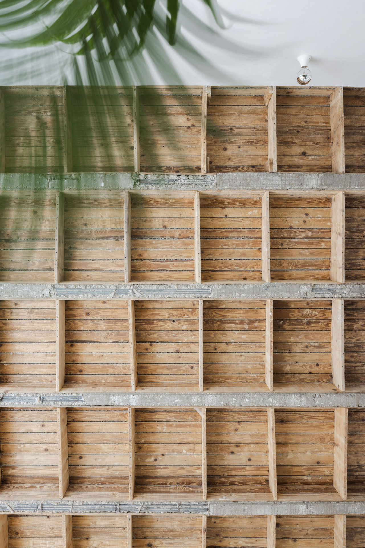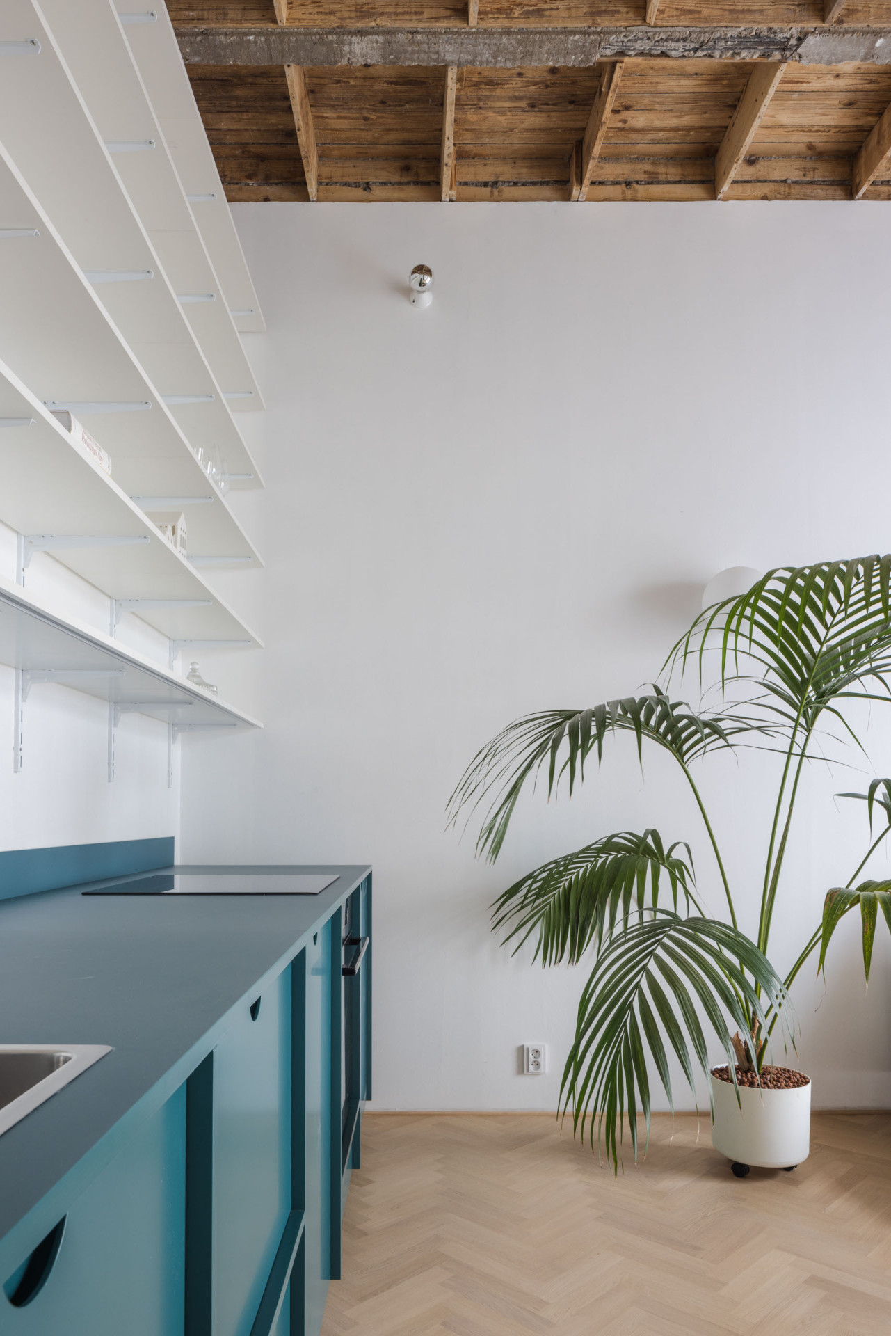 Příjemným překvapením byl objev původního stropu. Ten se autoři rozhodli odkrýt, aby dotvořil celkovou atmosféru bytu. Strop však nebyl takový, jak původně čekali. „Při rekonstrukci jsme očekávali klasický dřevěný strop, ale objevili jsme unikátní betonový strop s dřevěným záklopem, který dodává bytu na jedinečnosti a autentičnosti“ dodávají.