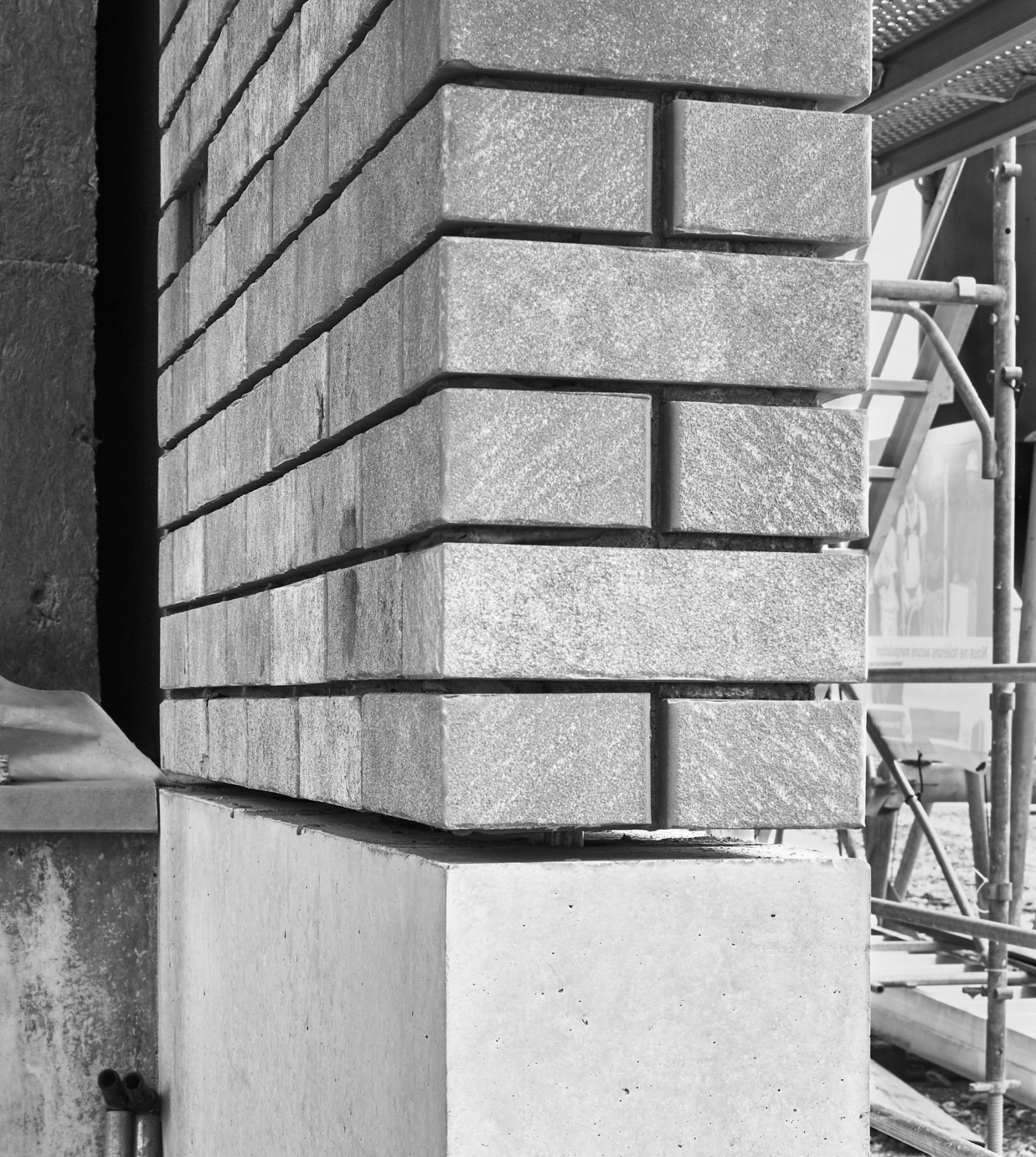 Pravidelné dispozice a strohý interiér změkčují klenby, jejichž hlavní funkcí je roznést zatížení vzniklé velkými rozpony nosných konstrukcí. Slouží ale také jako připomínka původní zástavby. Stejný důvod má i materiálové řešení. Fasádu pokrývají cihly usazené na betonové konstrukci, které tak odkazují na industriální historii okolí a dodává celému objektu jemnou texturu.