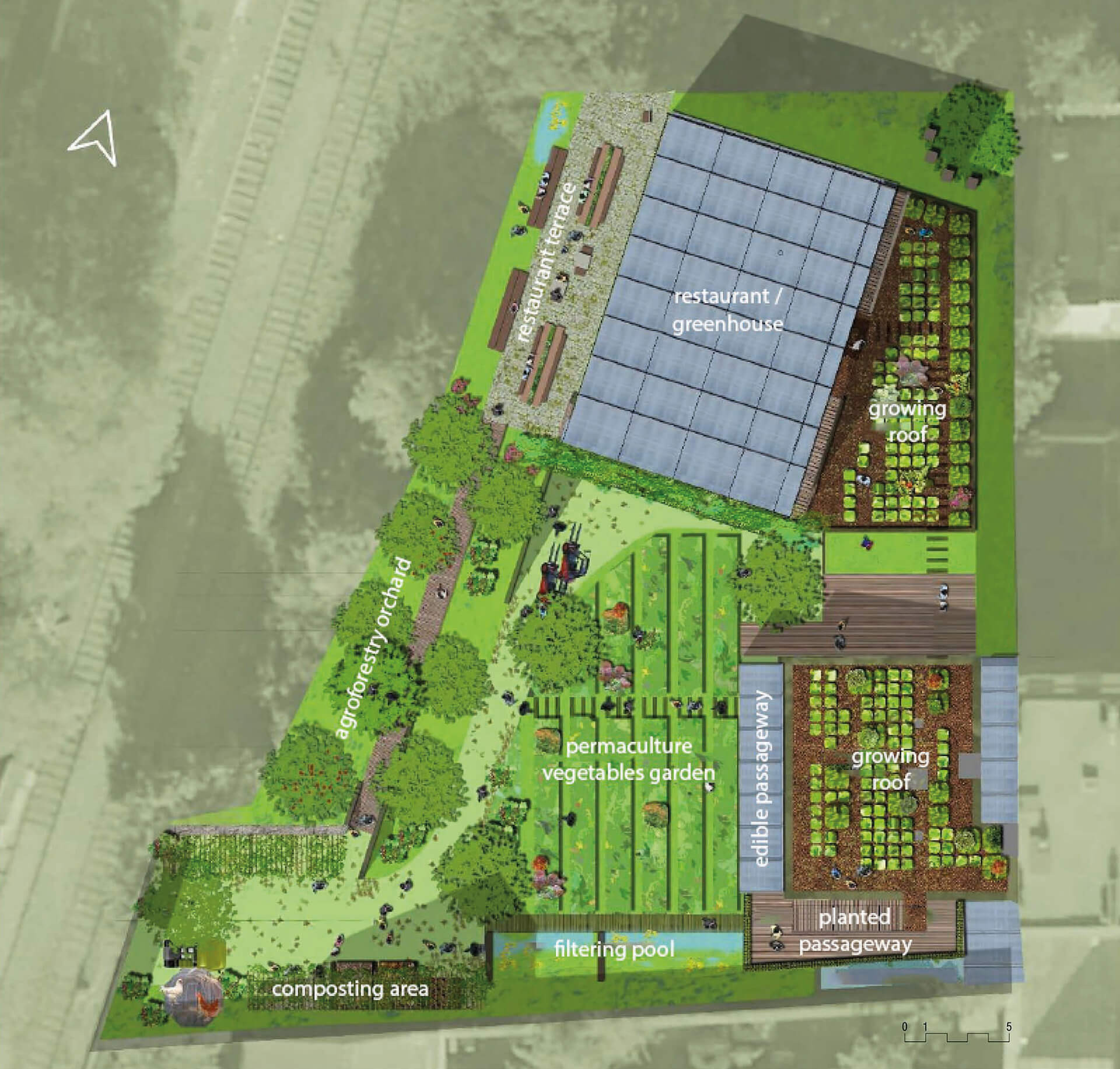 Nově zbudované místo v sobě zahrnuje sociální a ekologickou stránku komunitního života. Jeho součástí je také 5 studentských a 15 nouzových bytových jednotek, restaurace nabízející menu z lokálně vypěstovaných surovin a veřejné pěstitelské záhony a skleníky nebo dokonce jeskyně pro pěstování hub. Přírodní a klidná oáza uprostřed města, která doslova ukazuje, jak efektivně hospodařit s přírodními zdroji a jak je šetrně využívat i v prostředí měst.