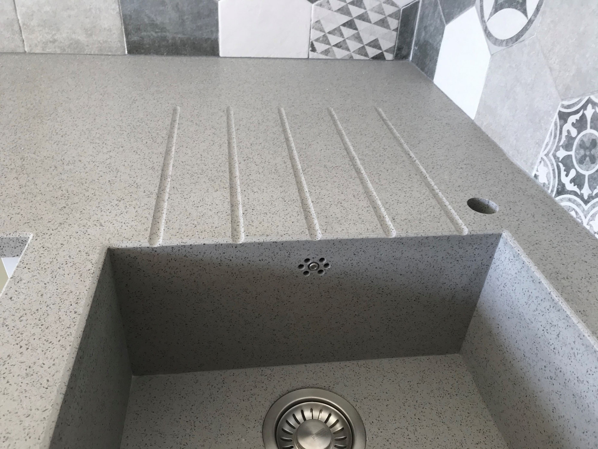 Šedou barvu použili architekti i na pracovní desce kuchyňské linky, kterou vybrali z tvrzeného kamene. „Pro kuchyňskou desku jsme zvažovali několik variant, mimo jiné také dřevo, ale nakonec jsme se shodli na pracovní desce z TechniStone®, přičemž jsme použili dva odstíny v saténové úpravě. Světle šedý odstín pracovní desky rámuje bílý nábytek linky, solitérní ostrůvek uprostřed místnosti je pak celý čistě bílý včetně desky z tvrzeného kamene,“ doplňuje Eva Eisenreichová.