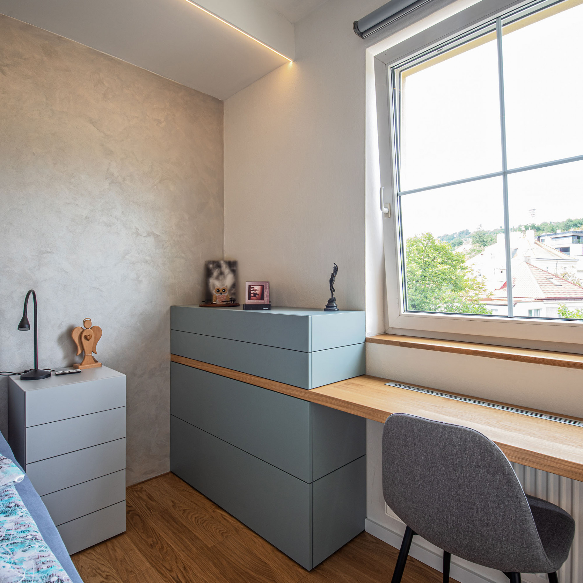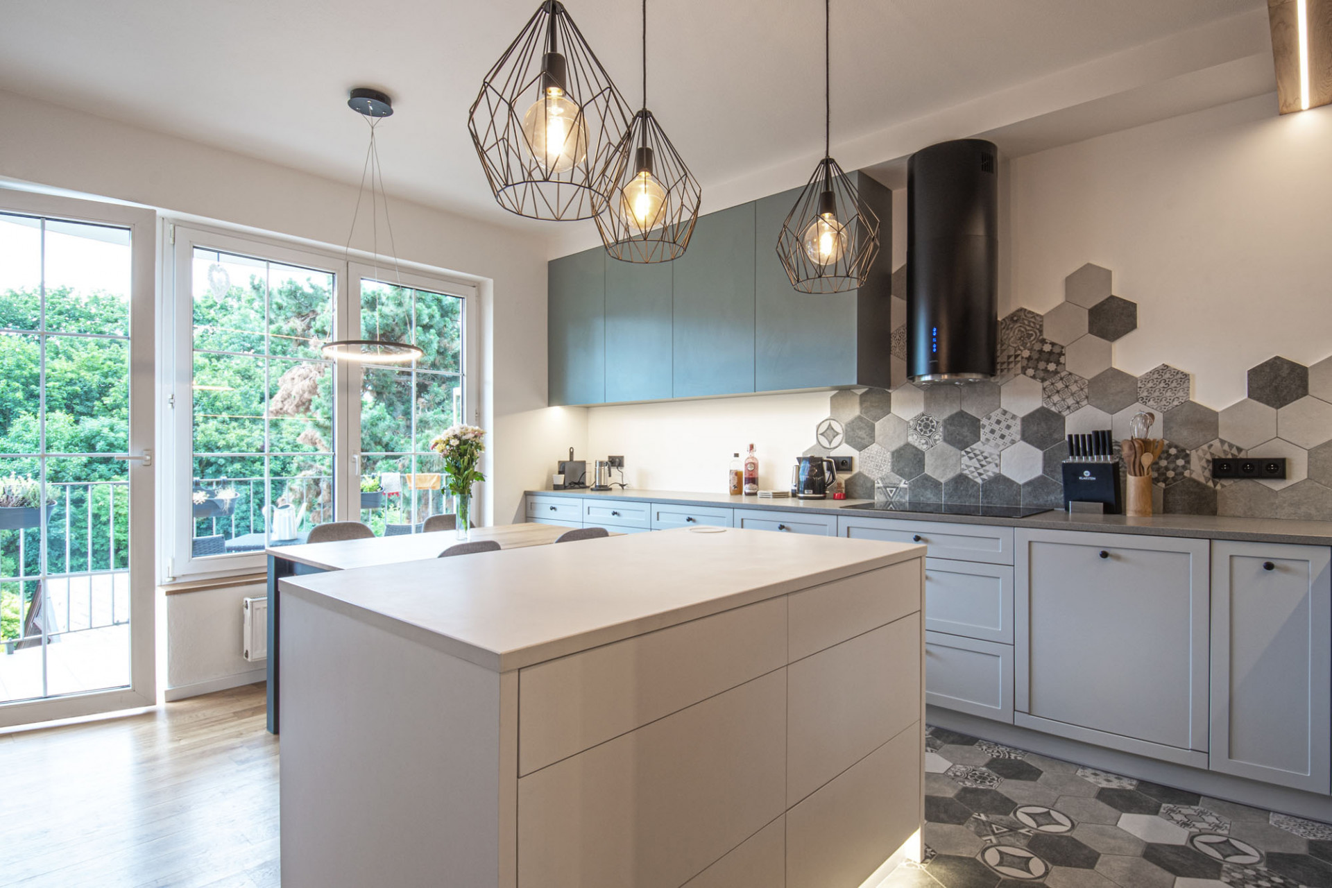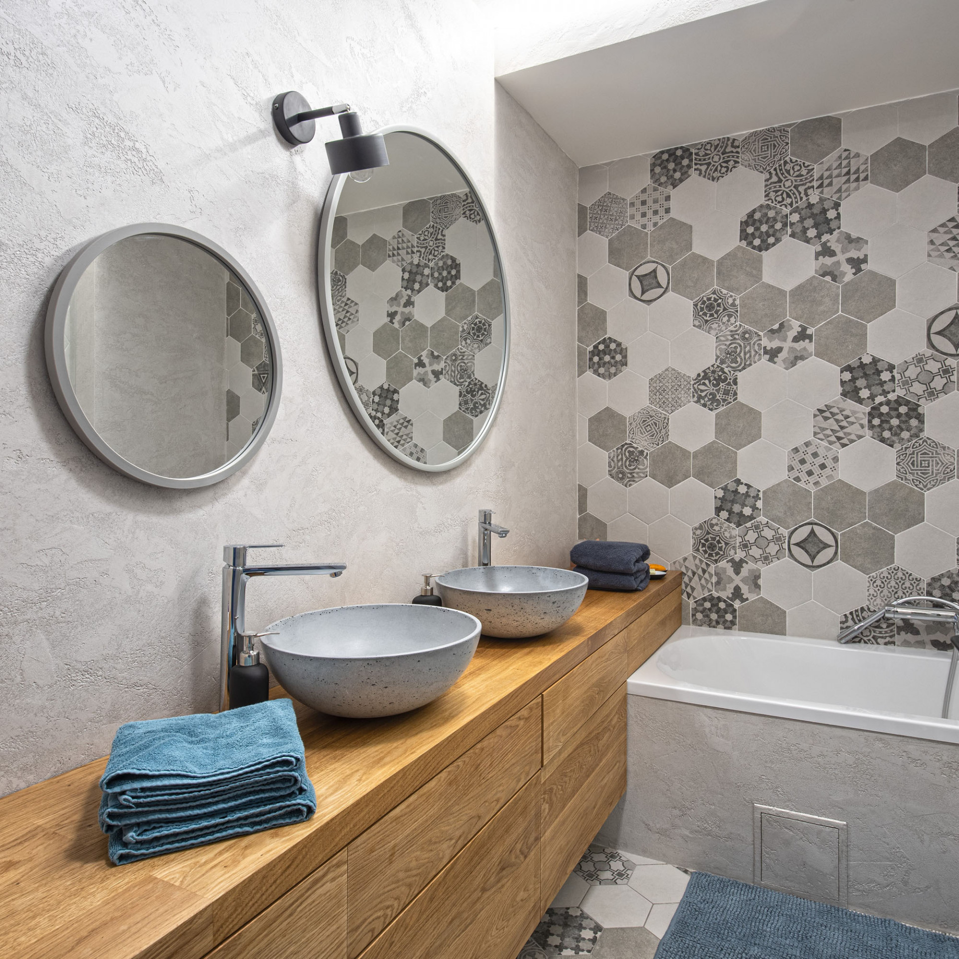 Rozdělení bytu podle funkcí podtrhují i použité povrchy. S olejovaným přírodním dubem zrenovovaných původních parket kontrastuje hexagonová dlažba v několika odstínech šedi, kterou doplňuje betonová stěrka stejných tónů. Tyto barvy pak určily barevné ladění celého interiéru. Dekor stávající dubové podlahy se uplatňuje i na vybraných kusech nábytku. Barevný akcent představují detaily z tyrkysového lamina opakující se v celém bytě. „V našem návrhu jsme se snažili skloubit minimalistický a lehce zdobný styl. Hexagonový tvar dlaždiček spolu se střídáním jednobarevného dekoru s ornamentálním vzorem nám přišel jako ideální,“ říká autorka proměny bytu Eva Eisenreichová.