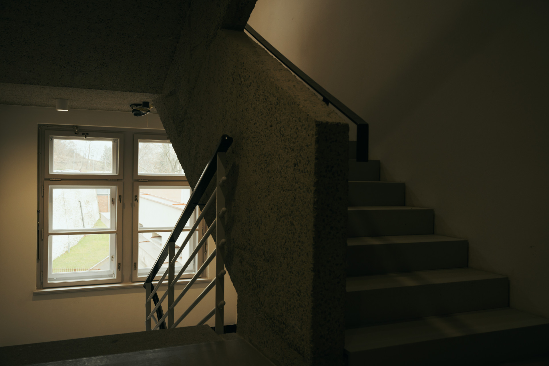 Za pozornost stojí také materiálové zpracování, a to jak detailů, tak větších celků. Stěny z hrubého zrnitého betonu jsou ručně „zdrsněné“ tzv. technikou pemrlování, díky čemuž vytváří zajímavou strukturu. Na podlahách najdete většinou teraco vyskládané z různých materiálů místního původu, plavou v něm třeba i kusy měděných drátů i porcelánových izolátorů z vysloužilých transformátorů. Architekti podle svých slov při realizaci několikrát zaexperimentovali. „Jde zejména o vývoj teracových podlah, broušené teraco na nástavbě a těžké betonové dveře,“ vyjmenovává Zuzana Drahotová.