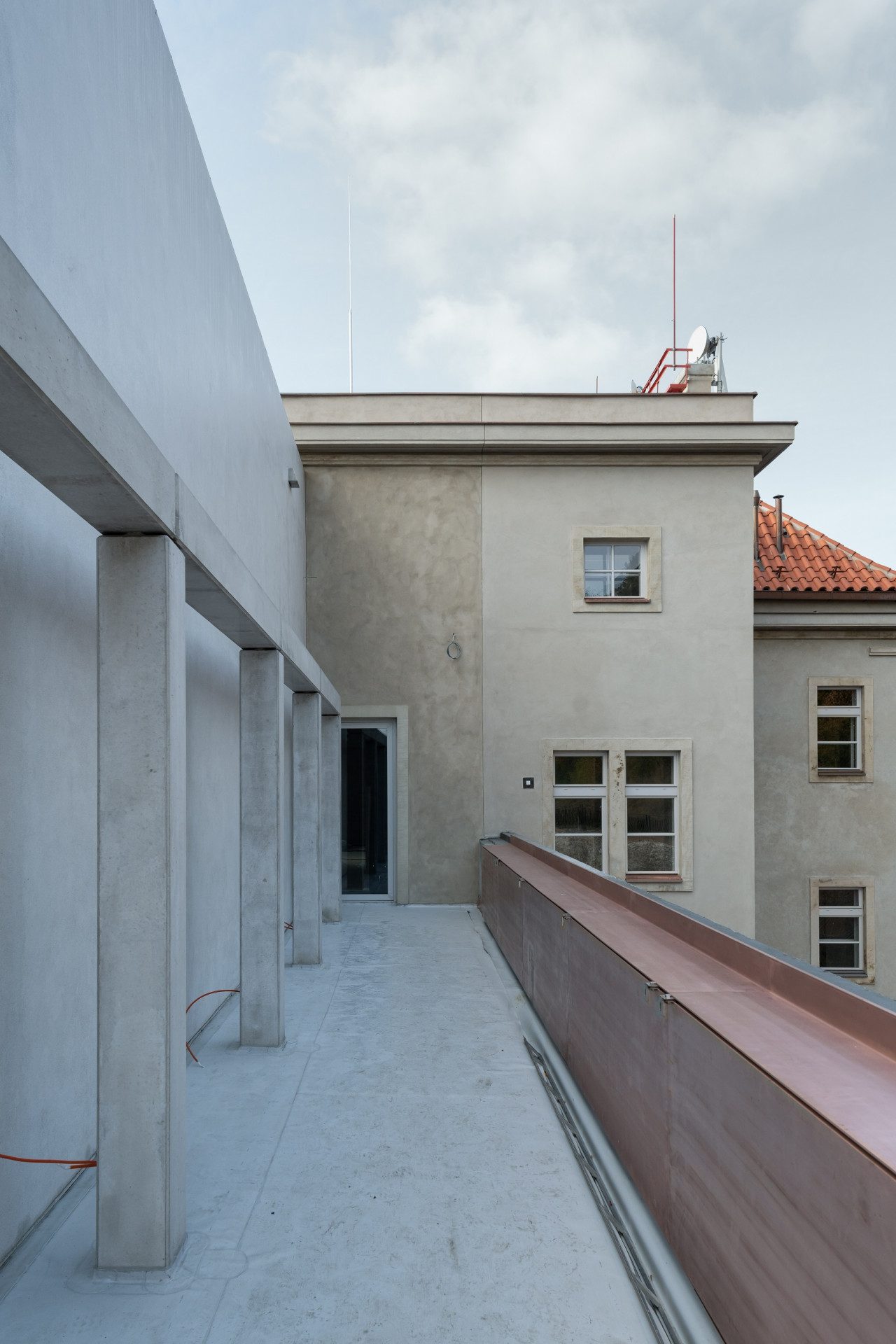 Vedle nových interiérů dostala budova také novou nástavbu. Poměrně jednoduchá nová hmota se ke stavbě připojuje v její zadní části a kopíruje zalomení tohoto křídla. Architekti nástavbu umístili do místa, kde se dříve nacházela technická terasa. Pás terasy se kolem nové hmoty táhne i dnes, právě odsud je také nejlépe vidět již zmiňované broušené bílé teraco, které celou nástavbu pokrylo.