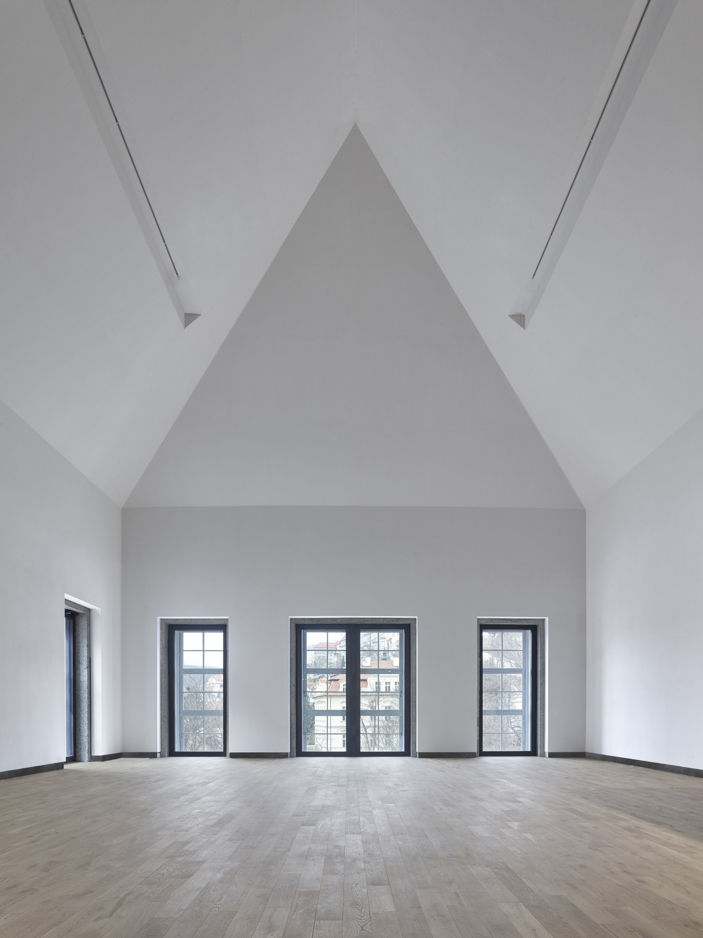 Ve vstupní hale čeká architektka Zuzana Drahotová, po chvíli přichází i Jan Schindler – jeden ze dvou partnerů pražského ateliéru Schindler Seko Architects. Do vstupní haly, kde nechybí pult pro nákup vstupenek ani galerijní shop, proudí velké množství denního světla. Zprostředkovávají ho úzká vertikální okna, která se táhnou hlavním průčelím budovy z 30. let. Návštěvníka na první pohled zaujme zrnitá betonová stěna v čele prostoru, za ní se odehrává již vlastní galerijní svět. „Původně jsme chtěli stěnu udělat prosklenou, aby atmosféra ze vstupní haly přecházela i do výstavního prostoru, na to nám ale kurátoři rychle řekli, že to naopak žádoucí není,“ říká architekt Jan Schindler.