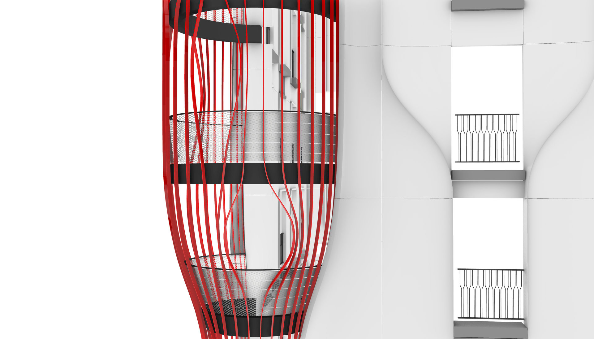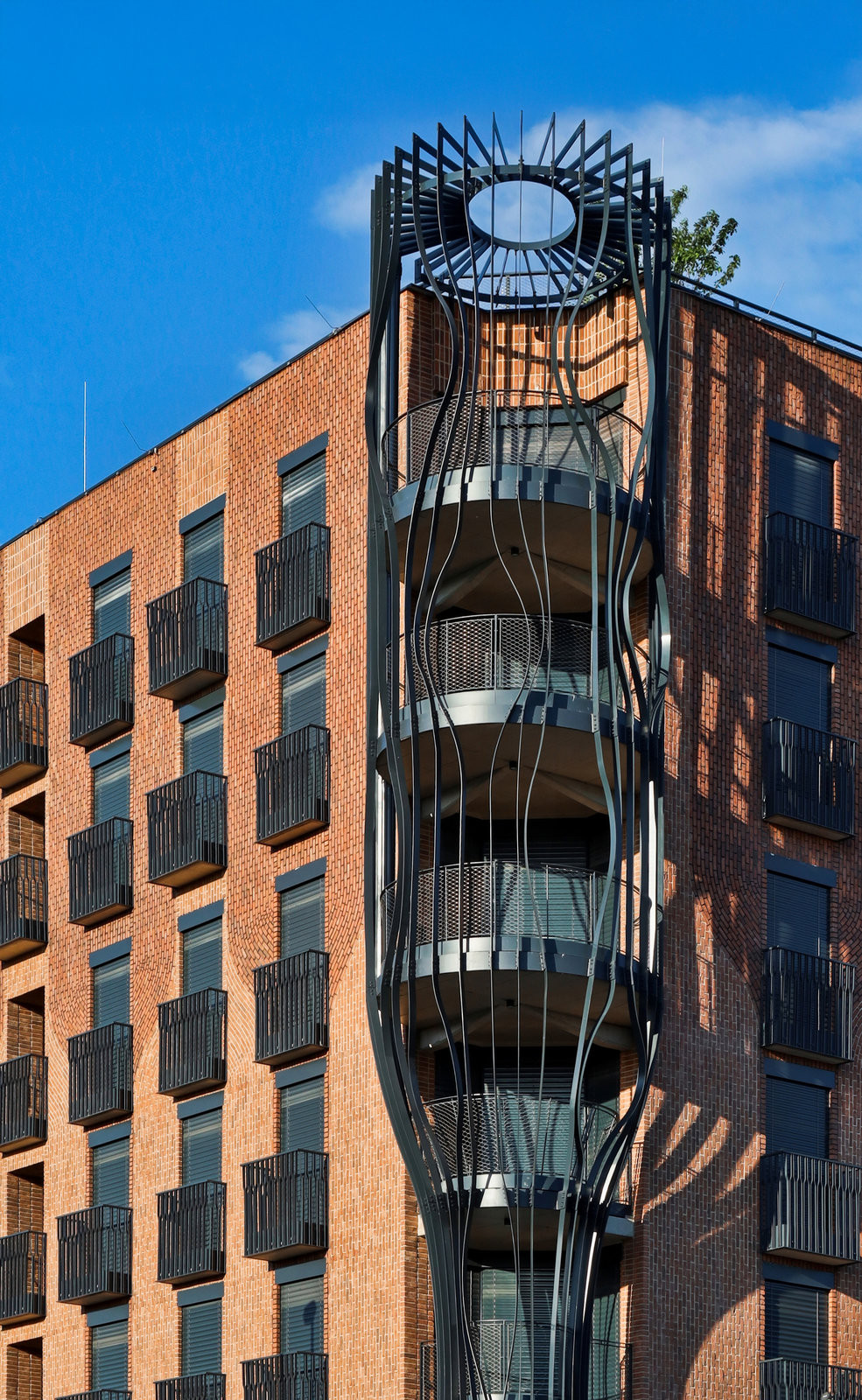 „Vznikla série rozdrobených domů, které ale mají jedno společné, a to je cihla. Výrazné je také nároží s dominantou, která odkazuje na to, co se tady historicky vyrábělo. Je to láhev obrácená dnem vzhůru, v jejímž těle a hrdle jsou umístěné jednotlivé balkóny a lodžie,“ popisuje Radek Podorský.