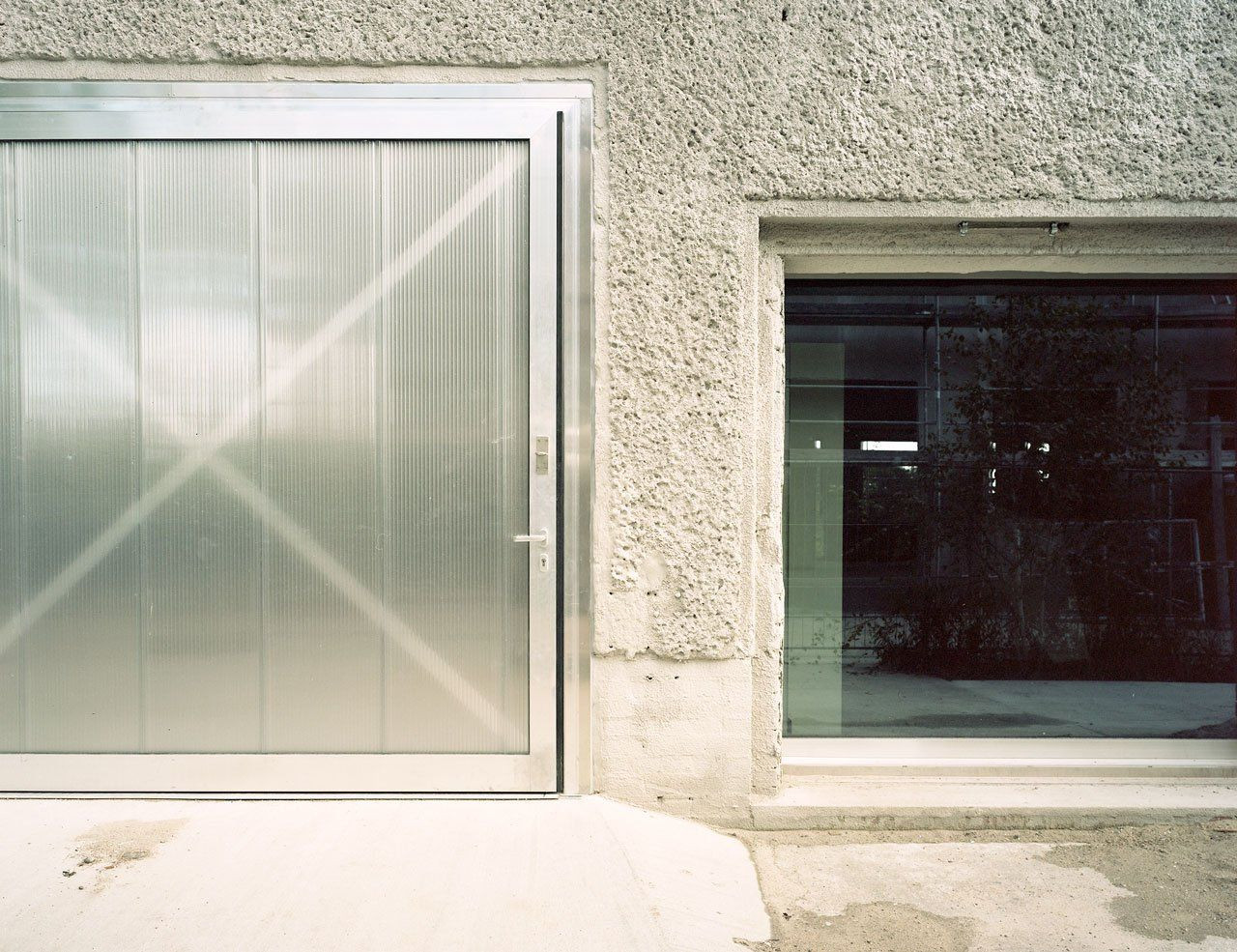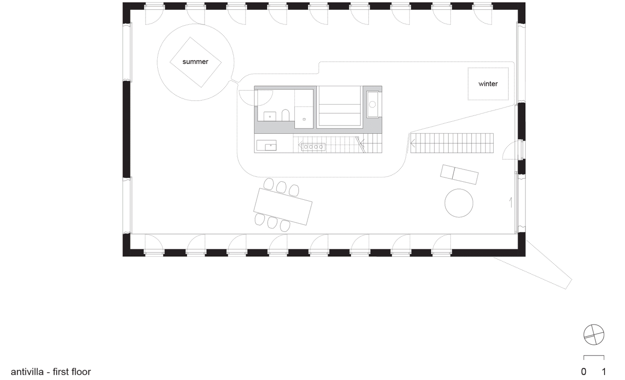 Místo toho, aby se stávající objekt zateploval, a také, aby se ušetřily finanční náklady, byla fasáda ošetřena stříkaným betonem. Veškeré nenosné stěny byly zbourány, aby se získal větší prostor, a do obou podlaží bylo nainstalováno jádro se schodištěm, koupelnou, kuchyňským koutem, krbem a saunou na ploše 20 m2. Takový prostor lze jednoduše přepažit na jednotlivé zóny průhlednými závěsy z PVC, a sice podle aktuálních klimatických podmínek. V létě se závěsy omezí pouze na ložnici o rozloze 10 m2, což je skutečně málo, když vezmeme v úvahu, že celý otevřený prostor loftu zabírá plochu 230 m2. V zimě naopak tvoří vytápěný prostor pouze 60 m2 celé podlahové plochy, z čehož vyplývá potřeba posunout lůžko blíž k otevřenému krbu.