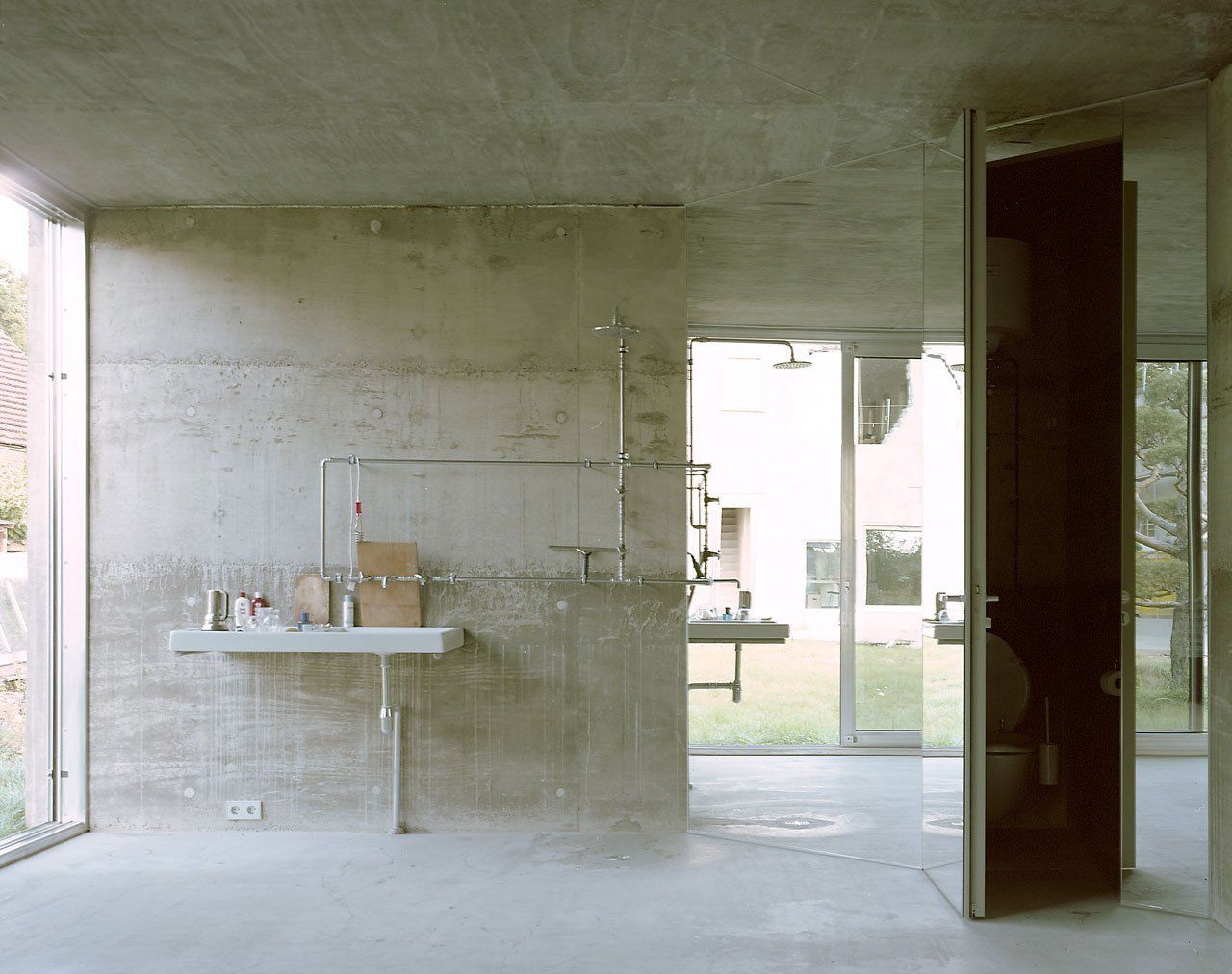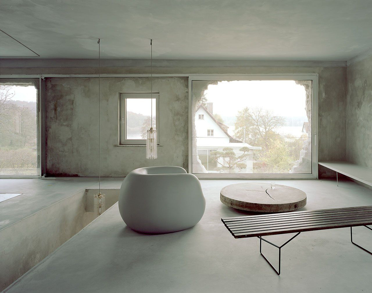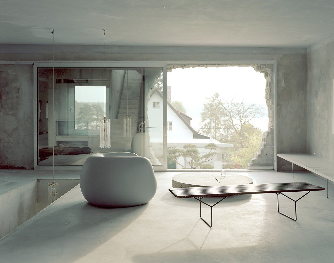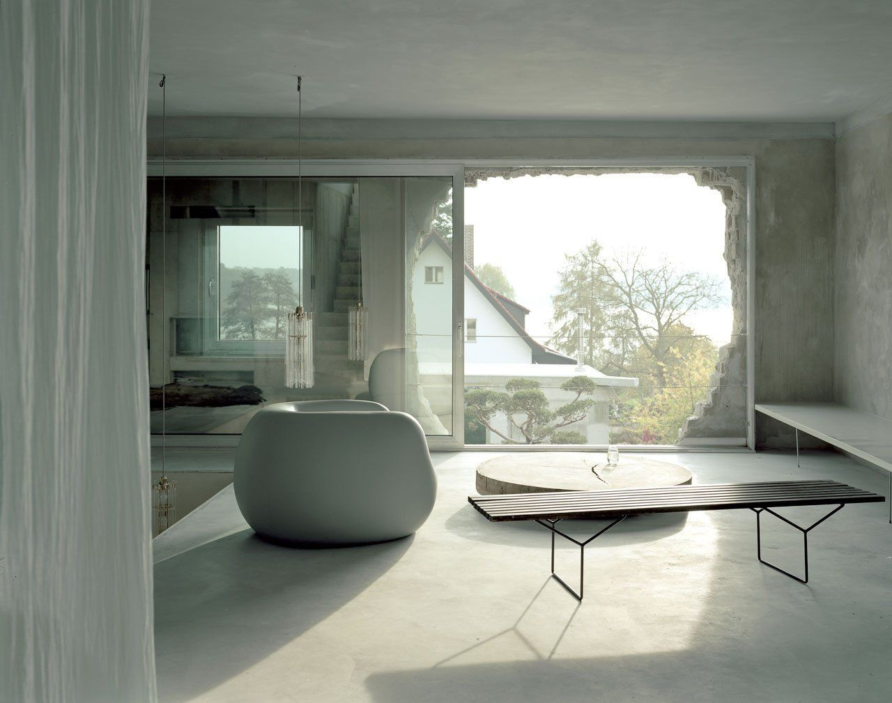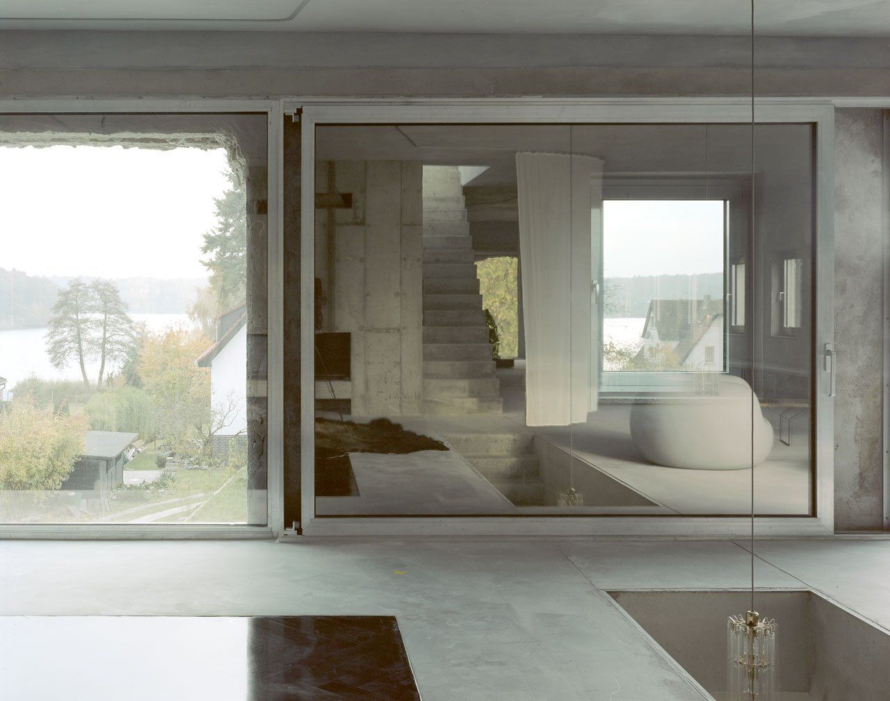 Interiér je pojat čistě minimalisticky v dokonalé kombinaci betonu skla a světlých doplňků, což maximálně umožňuje světlu pronikajícímu do interiéru velkorysými otvory utvářet specifickou atmosféru.
