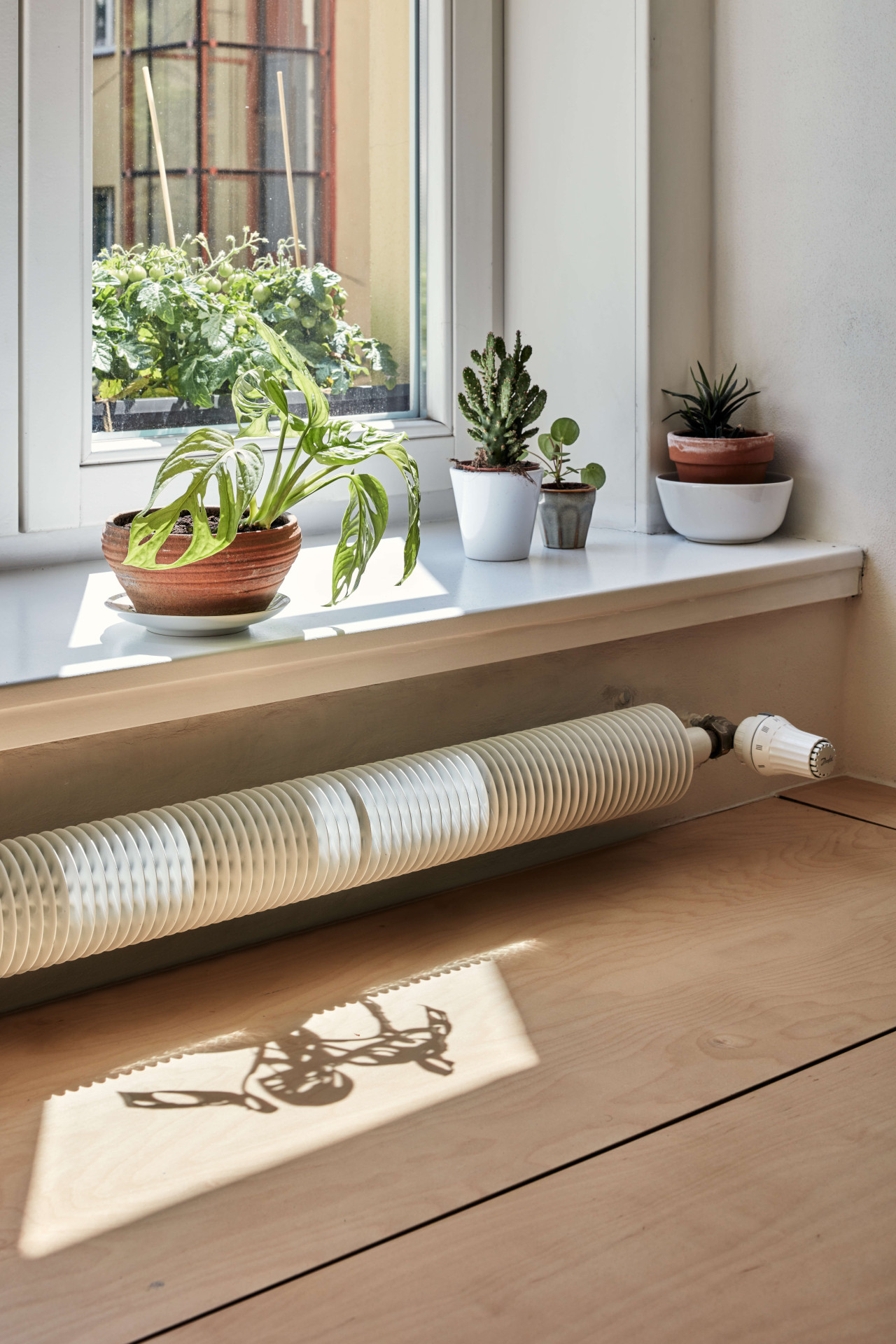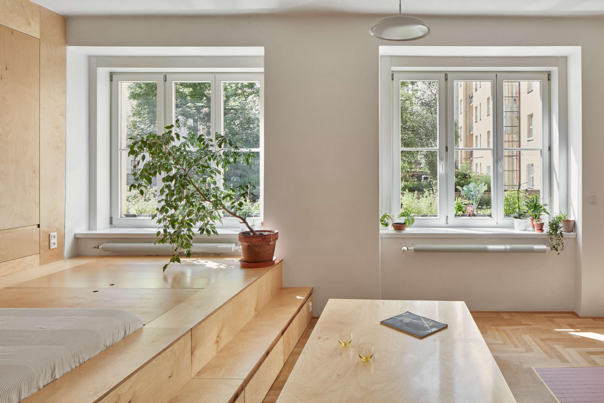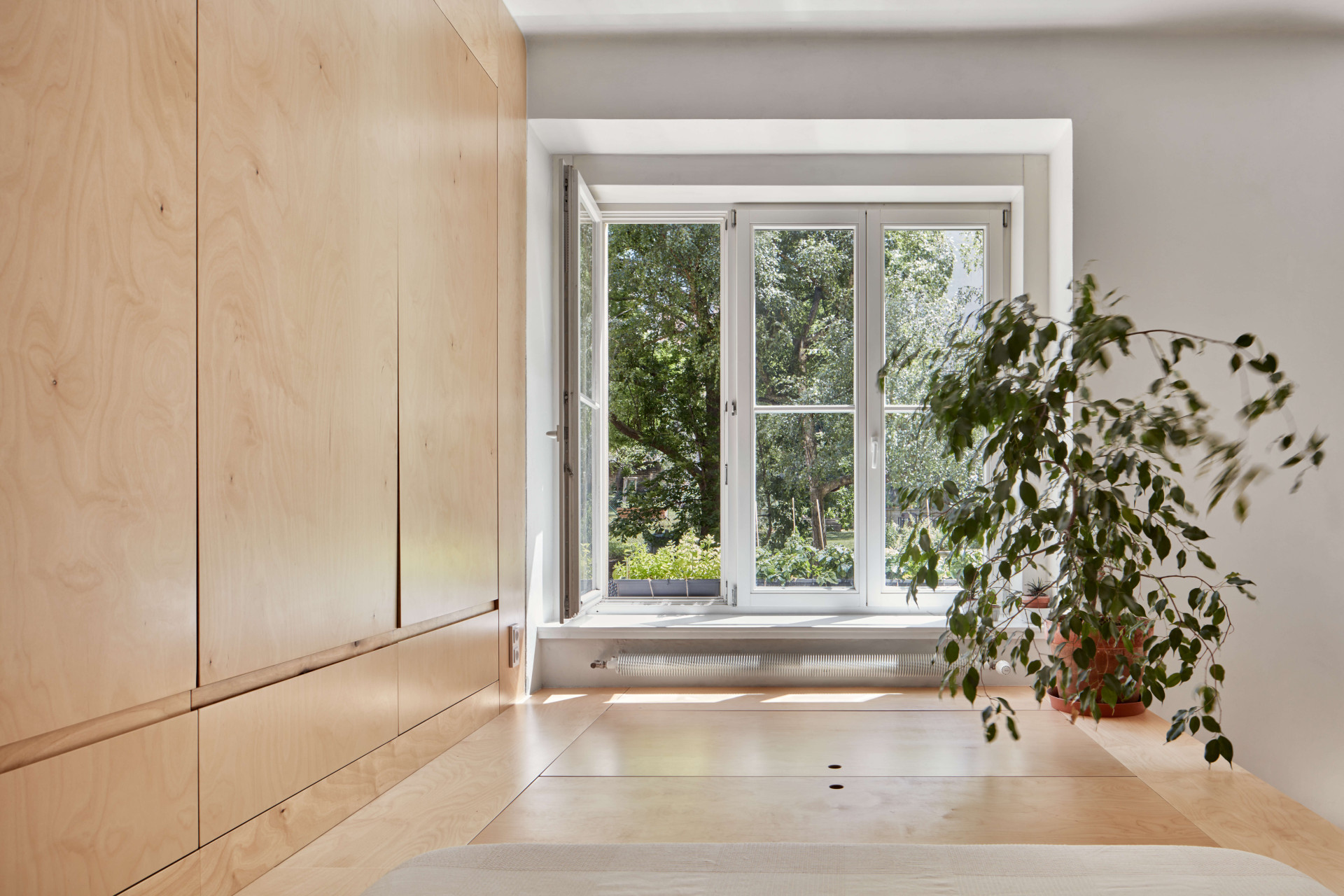 Řešený byt se nachází v přízemí činžovního domu na pražském Žižkově. Díky své poloze majiteli nabízí bezprostřední kontakt se zelení ve vnitrobloku, který se architekti rozhodli ještě posílit nezvyklým vestavěným pódiem z březové překližky. Protože pódium vedle úložných prostor, knihovny a lavice zahrnuje také vyvýšenou postel, může se investor při probouzení potěšit pohledem na rostliny za oknem.