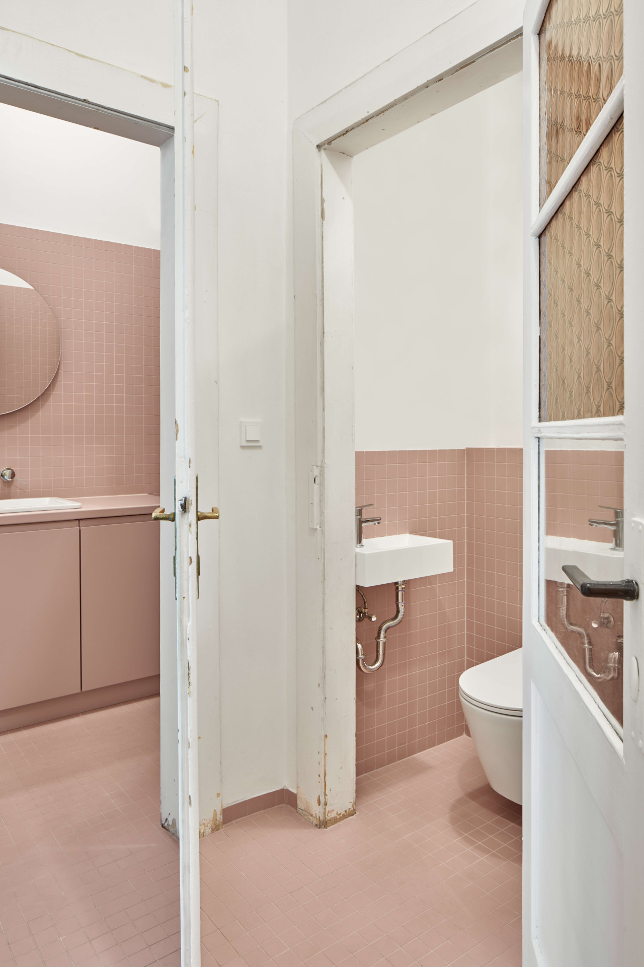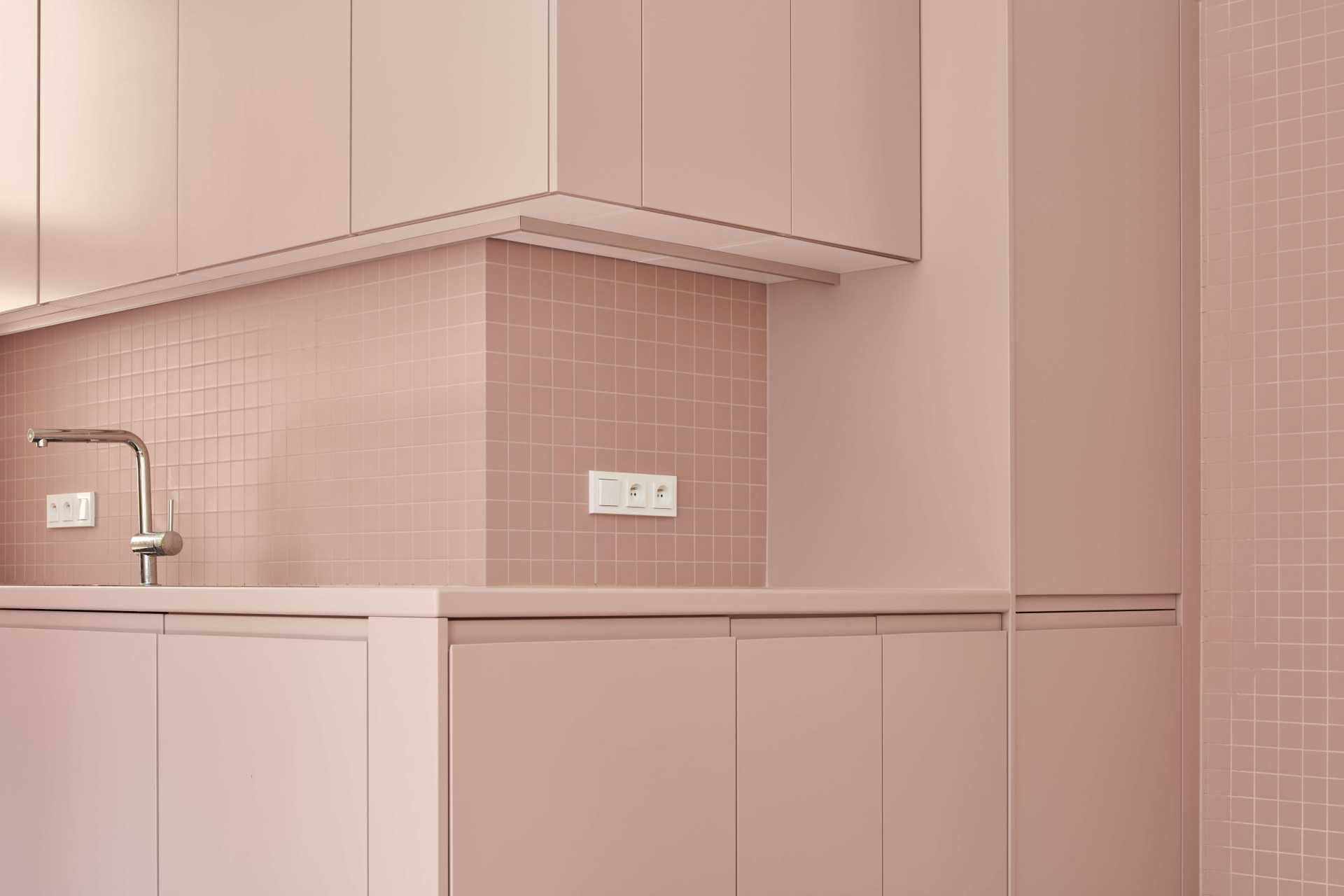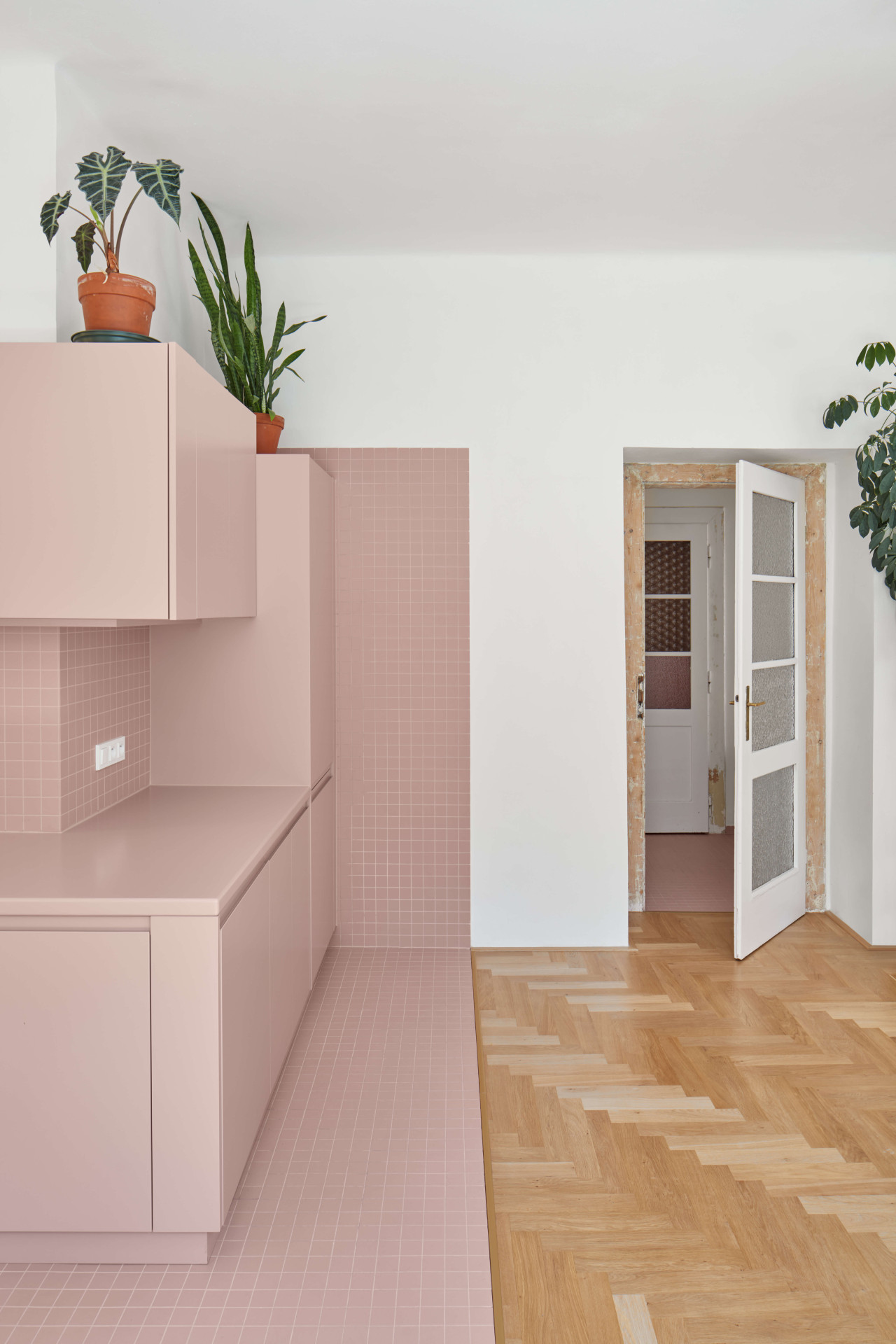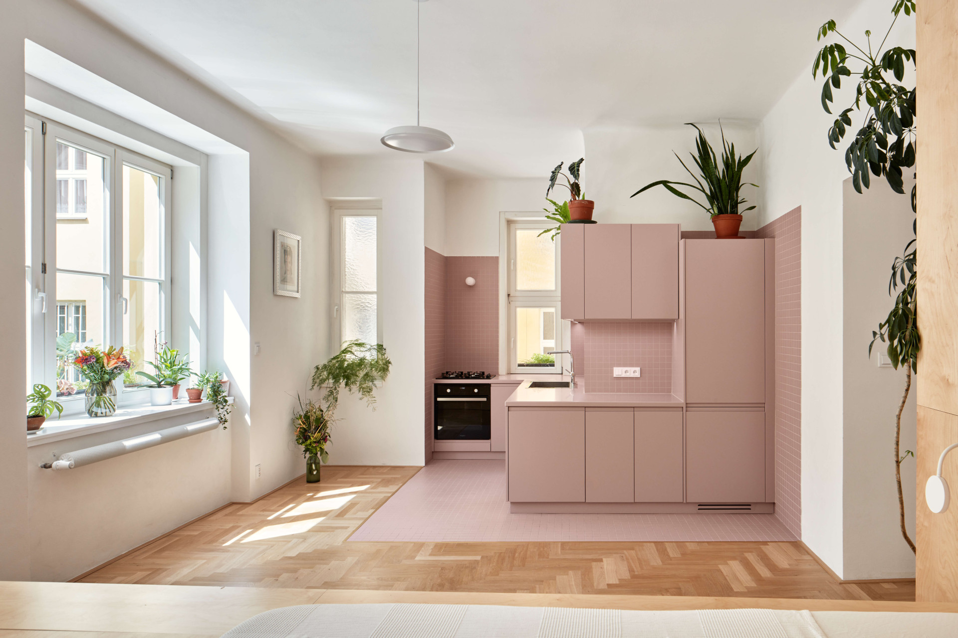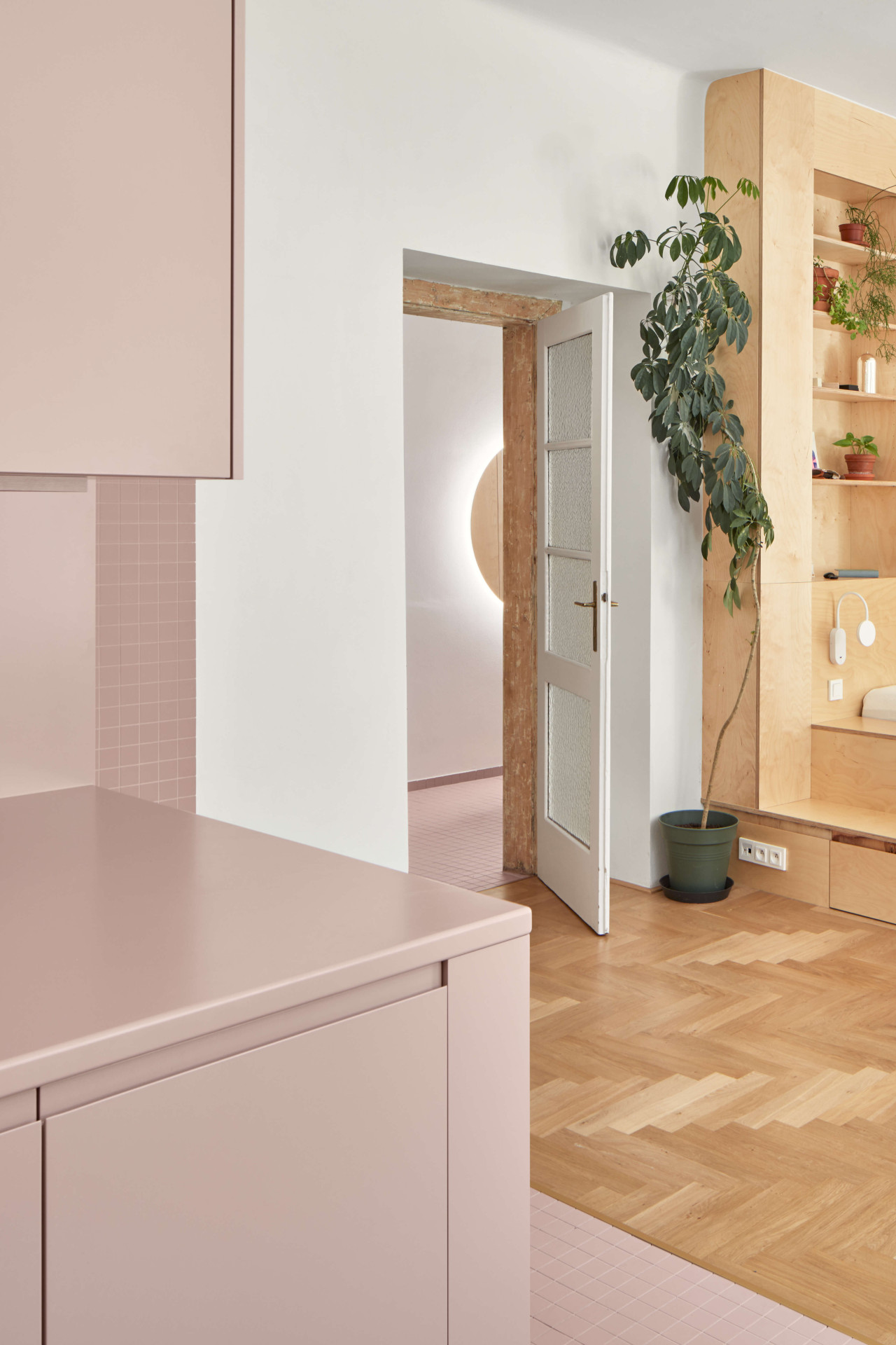 Propojením dříve oddělených místností vznikl otevřený obytný prostor, ve kterém se naproti růžové kuchyni nachází velké vestavěné pódium ze dřeva. To slouží jako lavice, knihovna, úložné prostory i vyvýšené lůžko v jednom.
