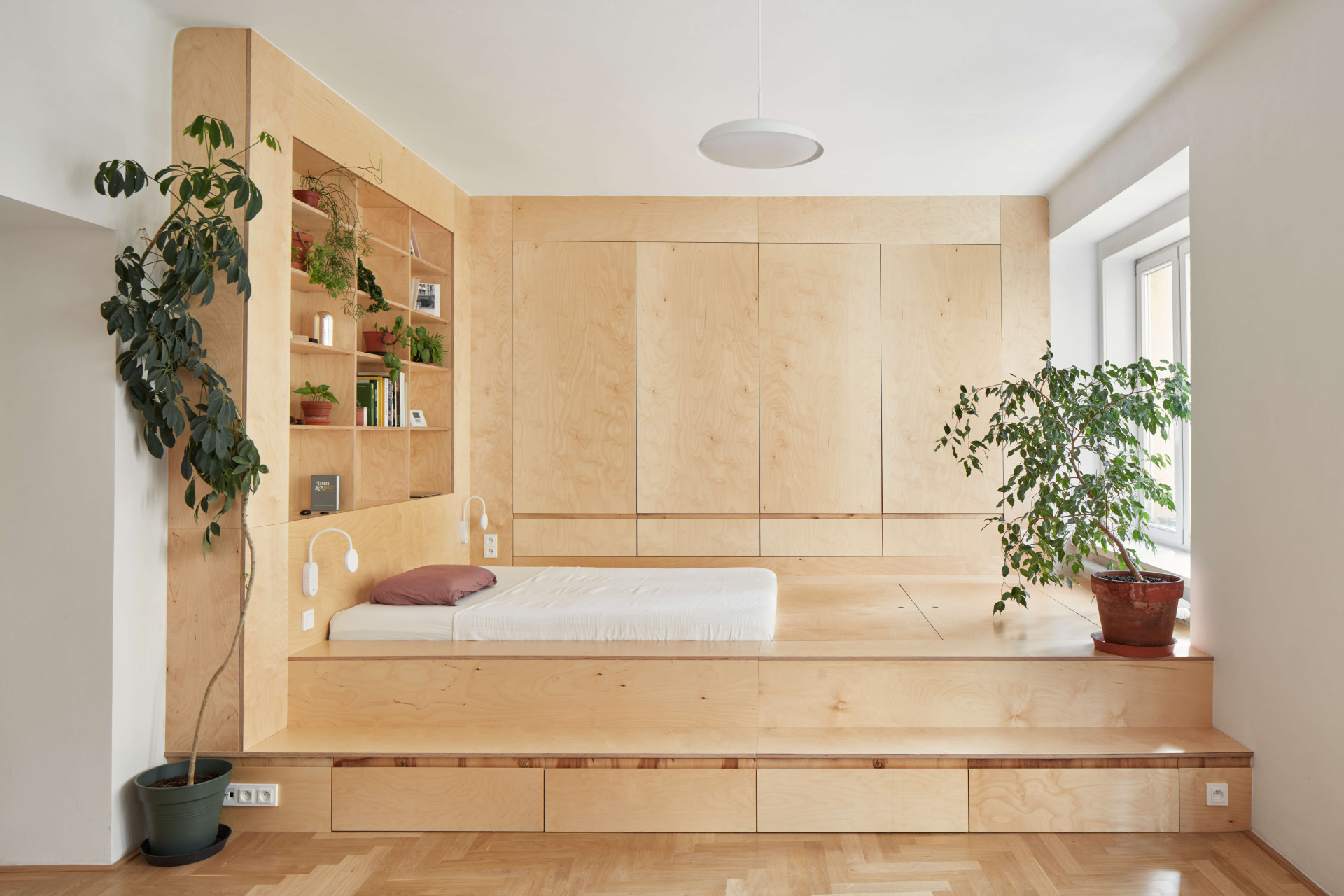 Z žižkovského 2+1 vytvořili architekti nevšedně pojatou garsonku se spacím pódiem