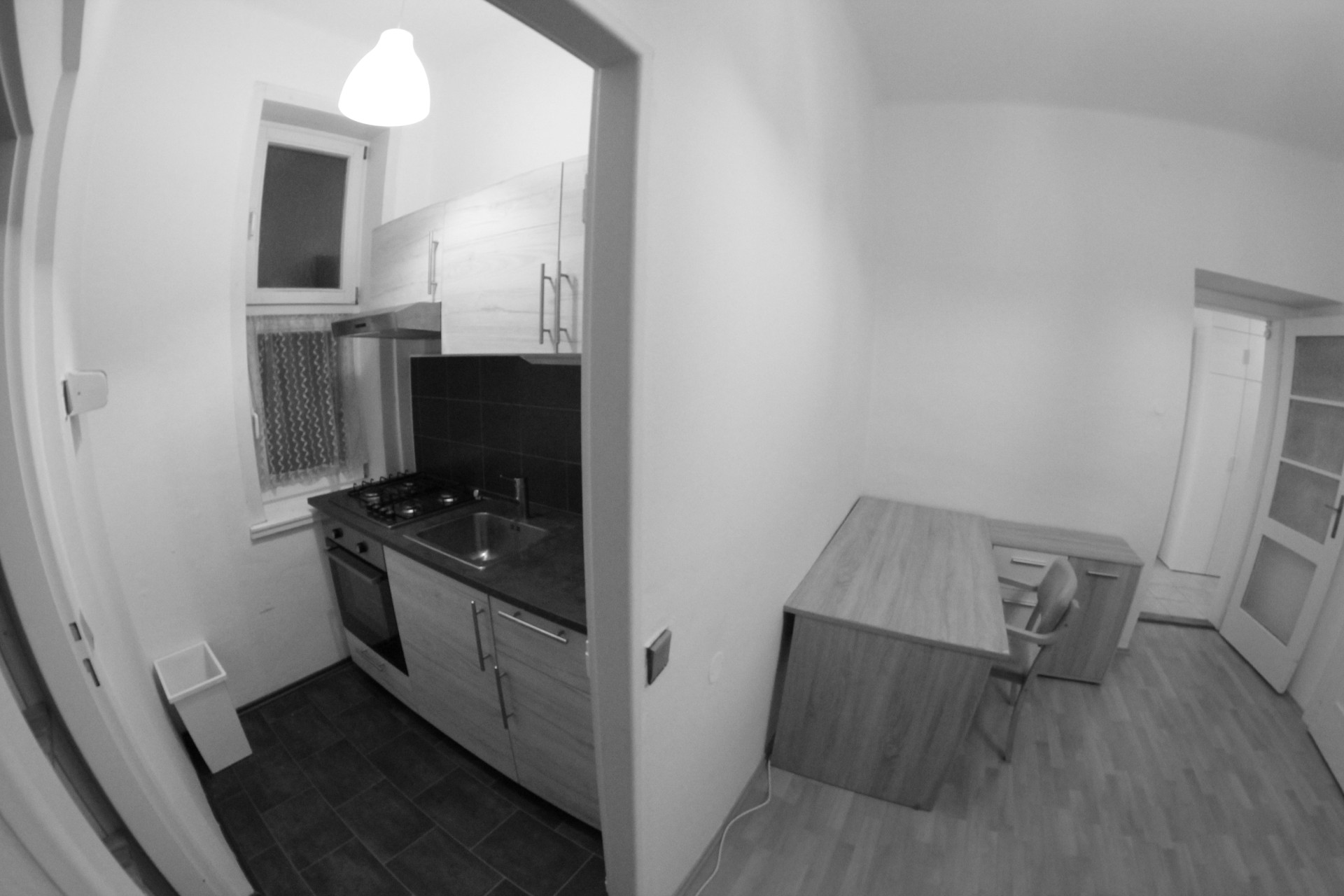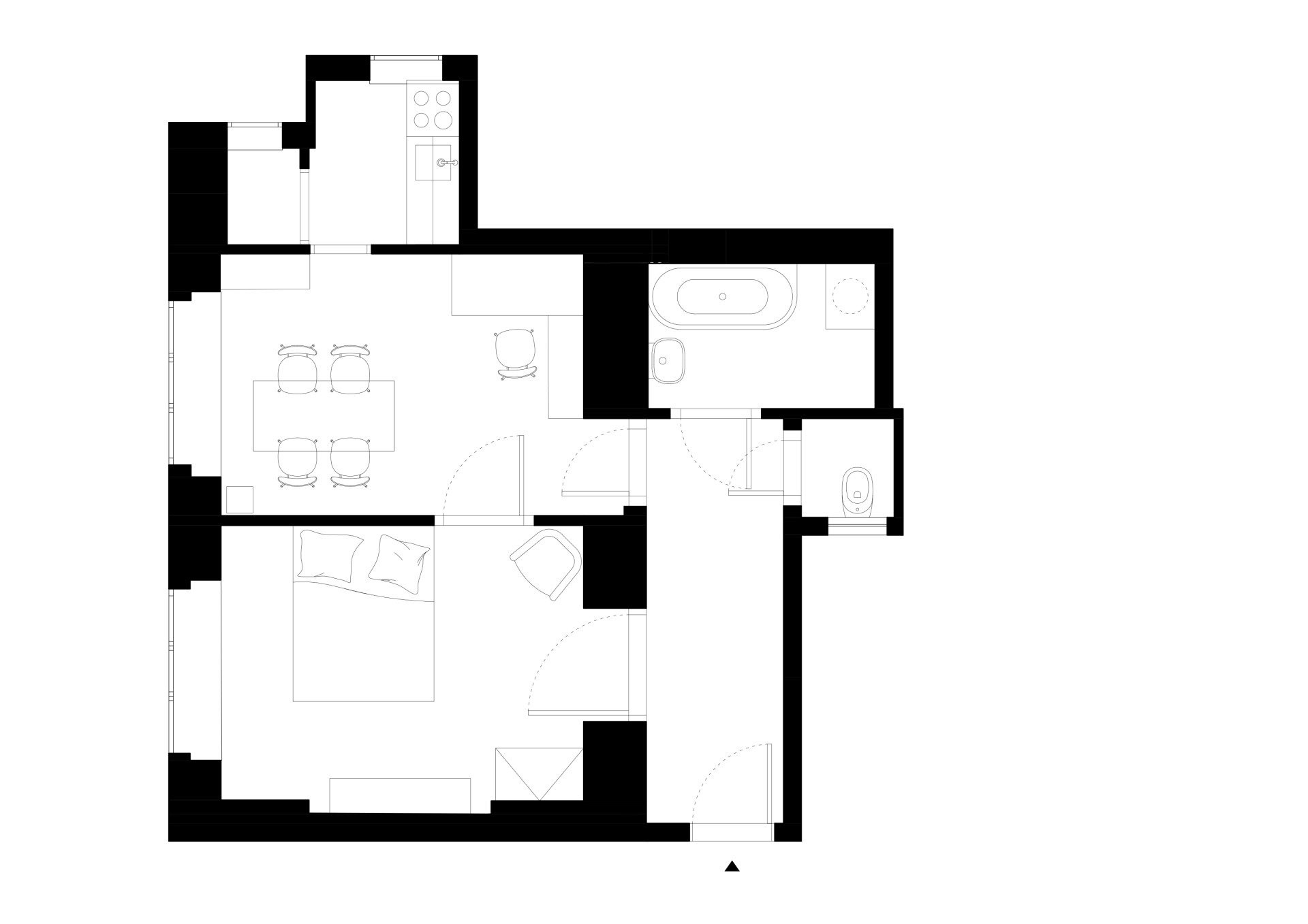 „Základní princip kompletní rekonstrukce spočíval ve vytvoření velkorysého obytného prostoru, který vznikl na půdorysu původní kuchyně, jídelny a ložnice. Sjednocení dispozice umožnilo přístup světla ze dvou směrů a zesílilo vizuální kontakt se zelení na dvoře. Hygienické zázemí a vstupní chodba byly taktéž kompletně zrekonstruovány, ale jejich půdorys se až na zrušení dveří do bývalé ložnice nijak neměnil,“ vysvětlují architekti.