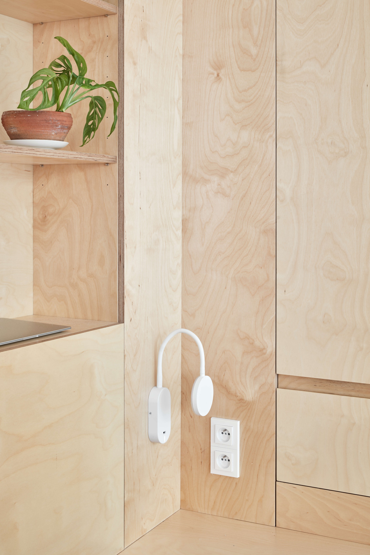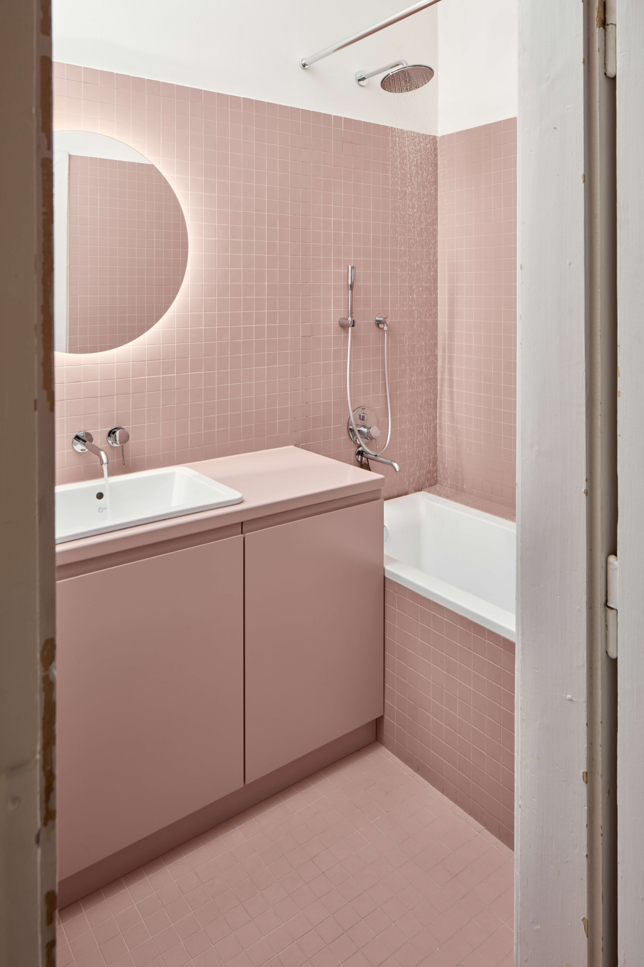 Multifunkční dřevěné podium svou kompaktností zajišťuje vzdušnost celého prostoru a současně vytváří neformální atmosféru bytu mladého architekta, který je zároveň vášnivým skateboardistou. Růžová barva uplatněná v kuchyni, koupelně i chodbě pak celý byt esteticky propojuje v jeden celek a vnáší do něj jistou hravost.