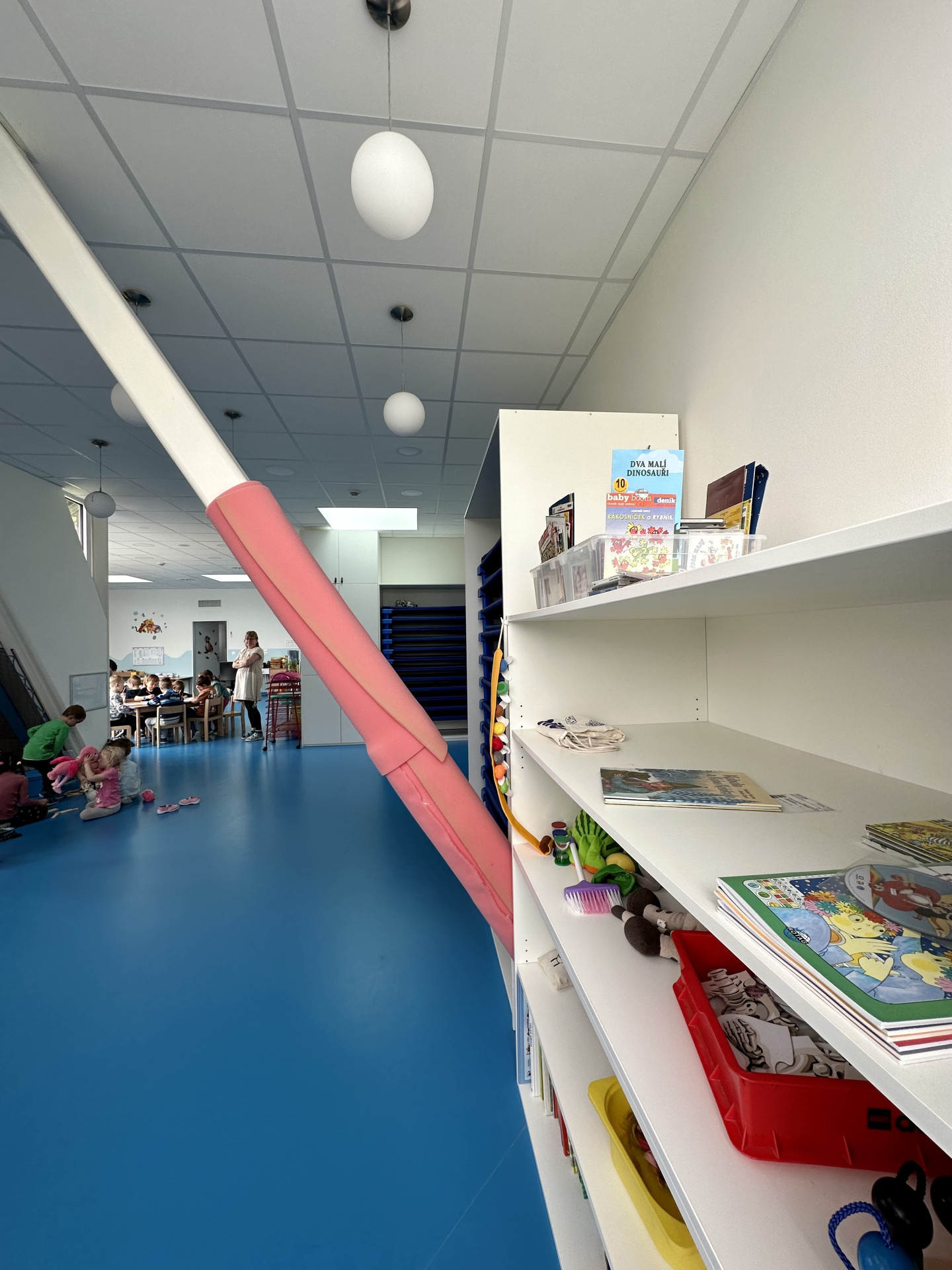 Hlavní dojem ale zůstává. A to je světlý a velkorysý prostor, vizuálně propojený se zahradou a také členité třídy s jehlany. Tohle na nás v nové školce působilo a zajímalo nás, jestli také na dětské duše. Dětí si tu hrálo v každé třídě kolem dvacítky, a jak jsme si všimli, nejoblíbenější místo bylo právě v jehlanu, ve slepém úhlu, kam paní učitelka nevidí.