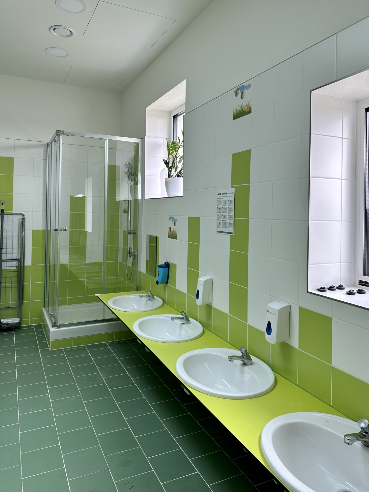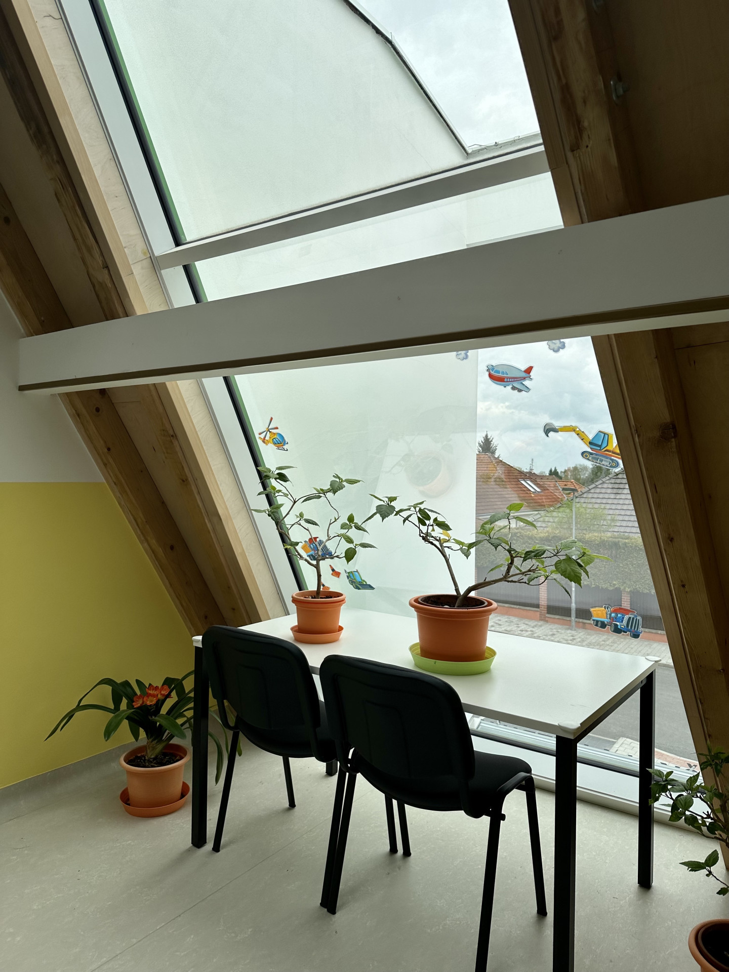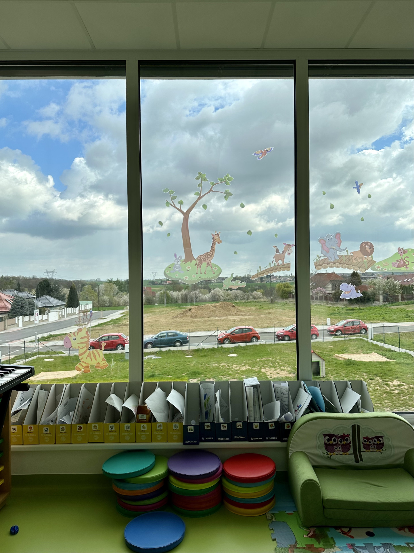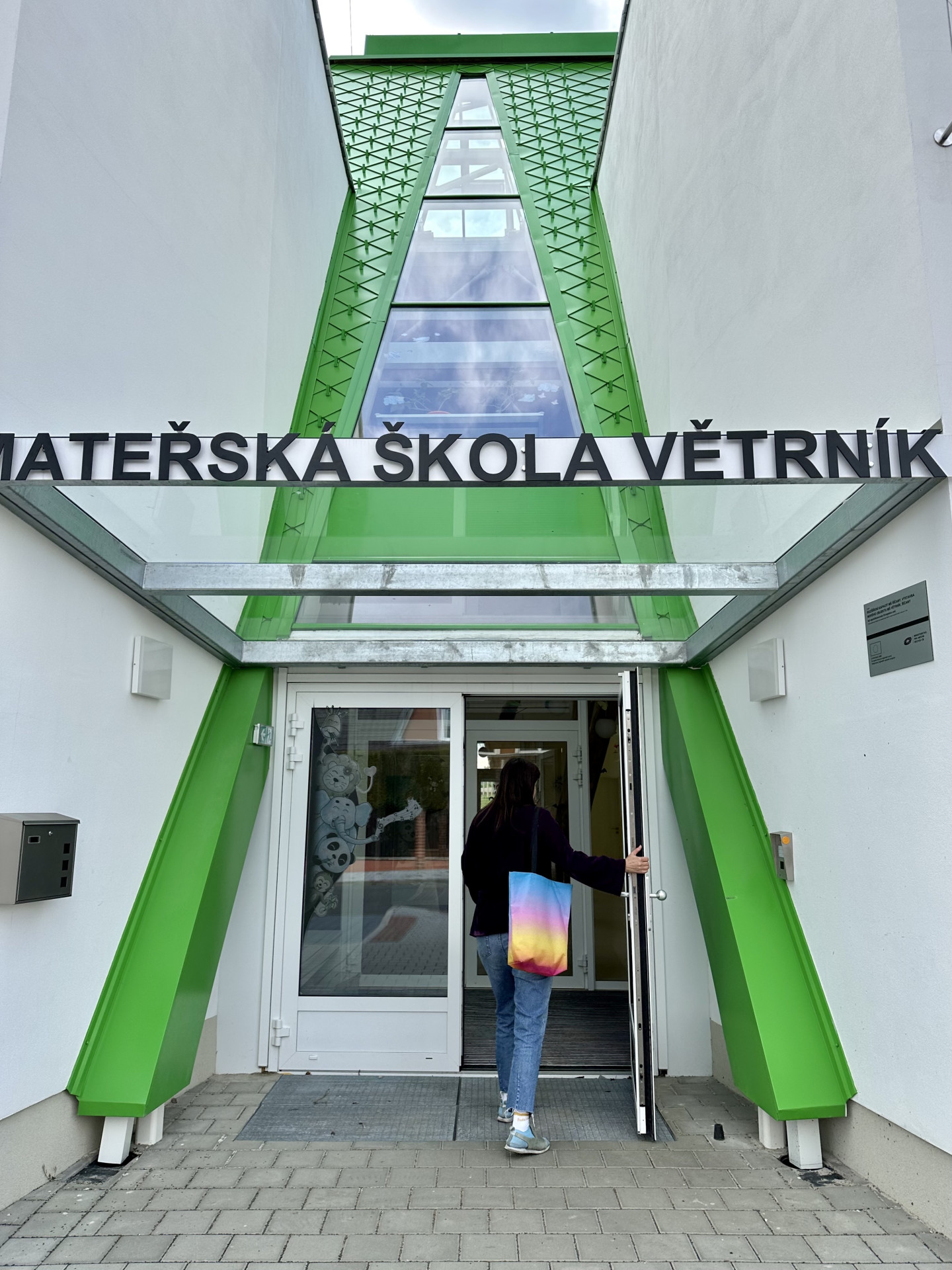 Proto tu také na všechny velké prosklené plochy nalepili velké barevné samolepky s bagříky a elfíky a dalšími takzvaně dětskými motivy. Jedna zvláště sladká a růžová elfka mrká z velkého prosklení na schodišti. Její úkol je chránit děti, aby nenarazily do skla, ale jak se ukazuje, také trochu zmírnit účinky architektury. Stejně tak peřiny s žirafkami, čarodějnice, sluníčka, barevné nástěnky a žlutá výmalba stěn v chodbách. Jak říká paní ředitelka, vymalovat chodby žlutě, to jim udělalo radost. „Aby to tu nebylo studené a bílé jako v nemocnici nebo obchoďáku,“ říká.