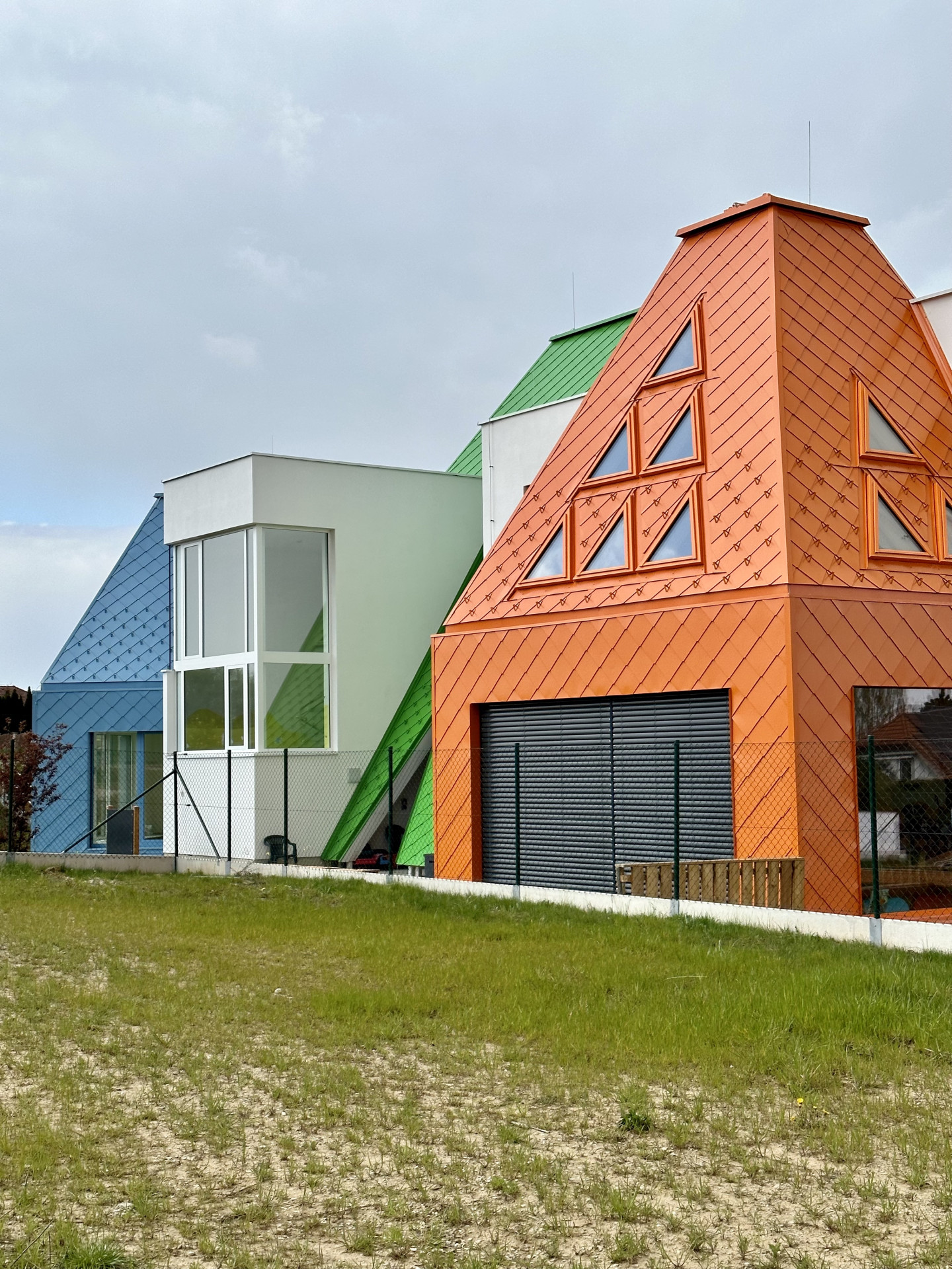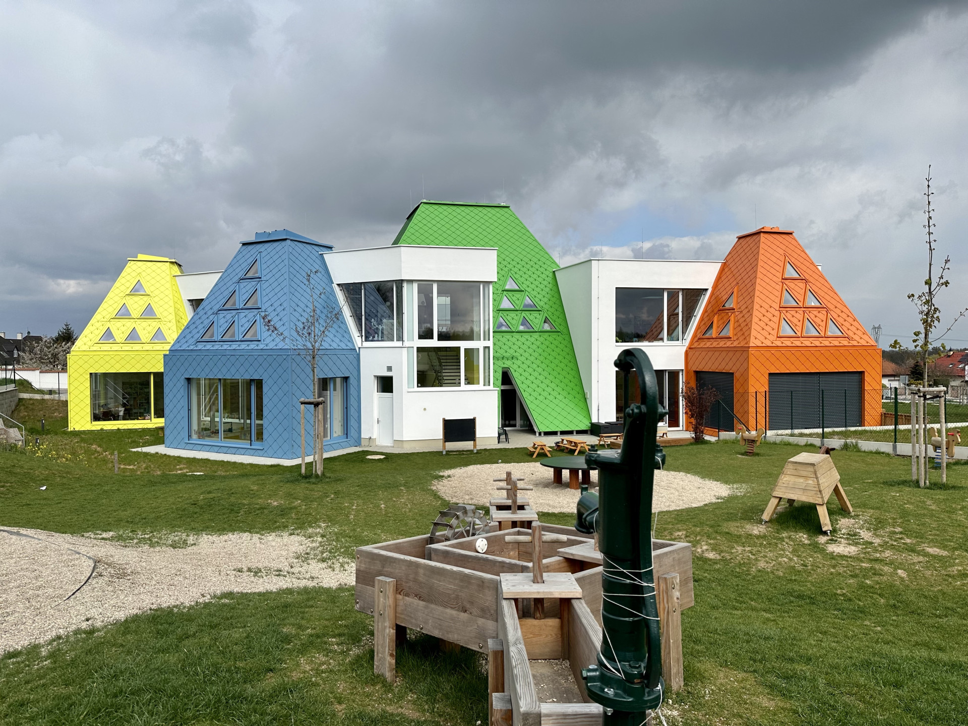 Školka stojí na okraji Říčan v oblasti zvané Na větrníku – zatím uprostřed pole, nové domy tu teprve začnou růst. Už z dálky jsou tudíž vidět jehlany v jasných barvách oranžové, žluté, modré a zelené. Jehlany, nebo spíš kvádry s jehlanovitou střechou, obklopují centrální bílý krabicovitý objem, kde je vstupní hala a společné prostory. Míříme ke vchodu.