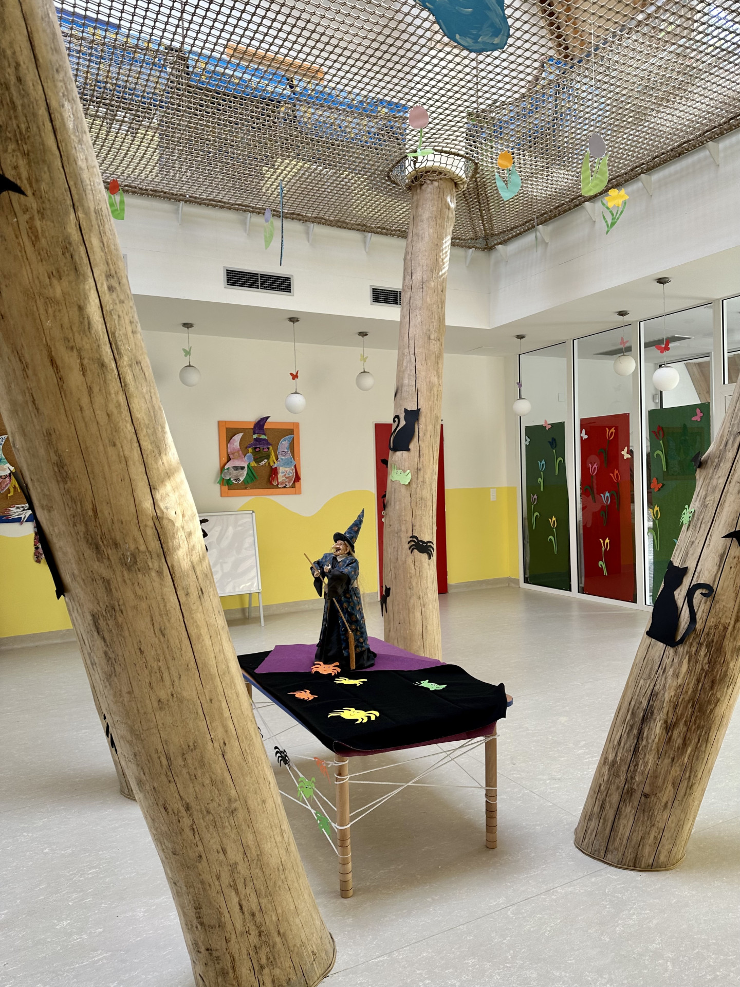 Kultura extrémní opatrnosti je vidět i tady ve Větrníku. Pobíhací síť je obehnaná zábradlím. Procházejí skrz ni mohutné kmeny, ovšem i ty jsou obalené molitanem. Třídy jsou na průsečíku ortogonální části a jehlanu, a každá má tudíž trochu nepravidelný půdorys. Vznikají jakési zálivy, kam není od stolu učitelky vidět, což je však dle předpisů nutné. „Na všechny děti musíme pořád vidět,“ říká ředitelka Řeháková. „My učitelky za vším vidíme úraz,“ dodává na vysvětlenou.