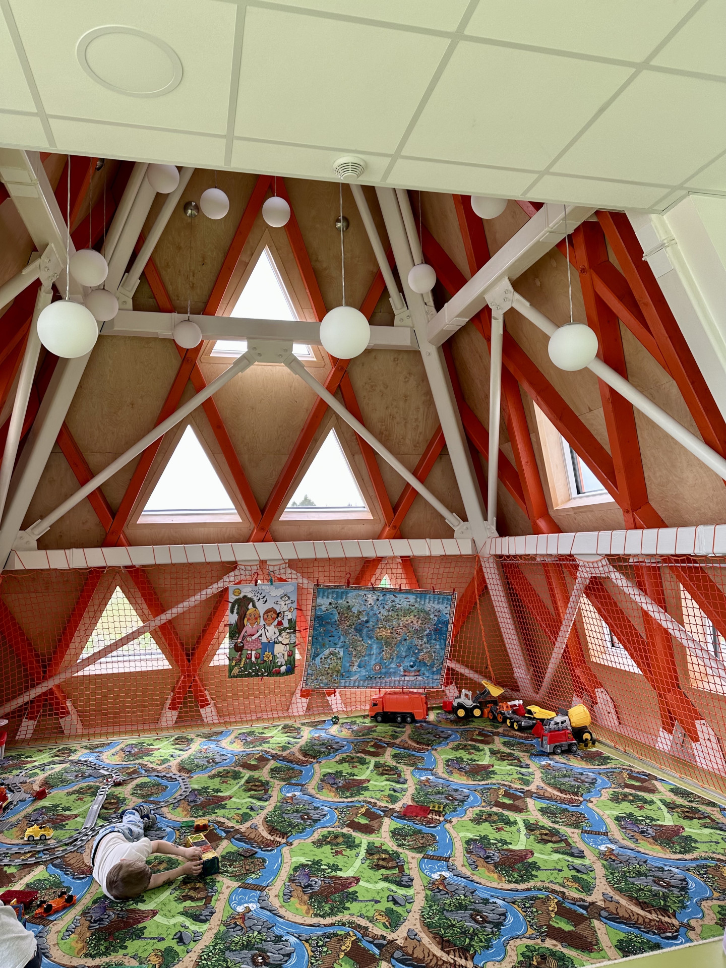 Na bílé krabici si povšimneme pokusu o vegetační fasádu – na obdélníku odhadem tři na dva metry jsou připevněny plastové květináčky, přičemž černého plastu je tu zatím o dost víc než rostlin. To moc přesvědčivě nevypadá. Pak ovšem vcházíme dovnitř a čeká nás wow efekt. Ocitli jsme se v hale, vysoké přes dvě podlaží a výš, až do špičky největšího jehlanu. Shora sem dopadá spousta světla. Ve výšce prvního patra je natažená síť, po níž by děti mohly pobíhat vysoko nad hlavami dospělých. Ale nepobíhají. „Když jsme to zkoušeli, dětem do sítě propadávaly nožičky,“ říká ředitelka školky Jiřina Řeháková. Síť je prázdná a kolem je zábradlí, které slouží na větrání lůžkovin.