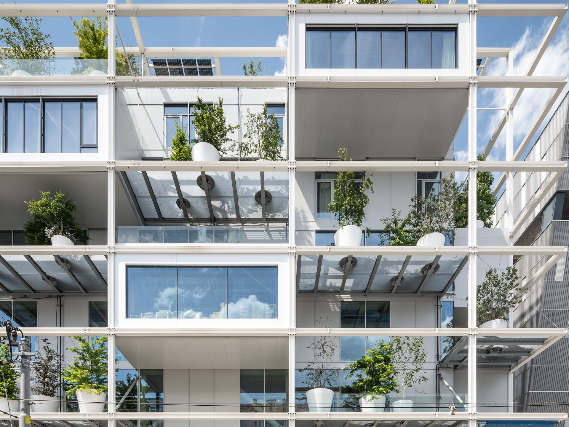Pro vlastní obvodový plášť budovy za ocelovými „policemi“ byl zvolen sloupko-příčkový systém Schüco FWS 50.SI, který byl oceněn stříbrnou plaketou udržitelnosti Cradle to Cradle. Prosklené plochy se střídají s uzavřenými fasádními panely, které jsou z vnější strany obloženy bíle lakovaným ocelovým plechem a z vnitřní jsou opatřeny sádrokartonovými panely.