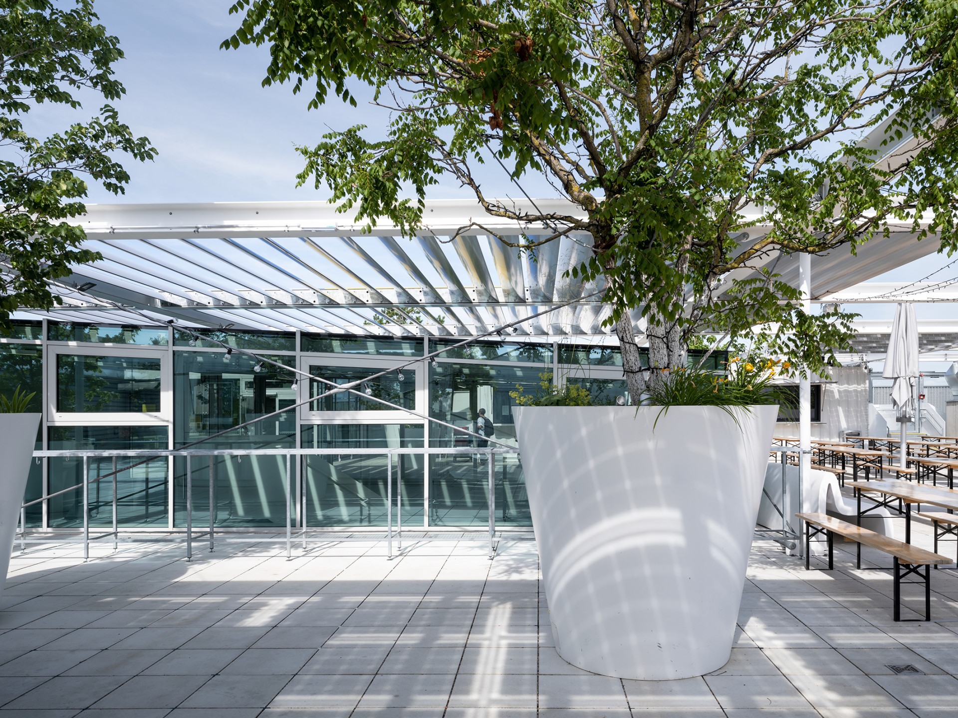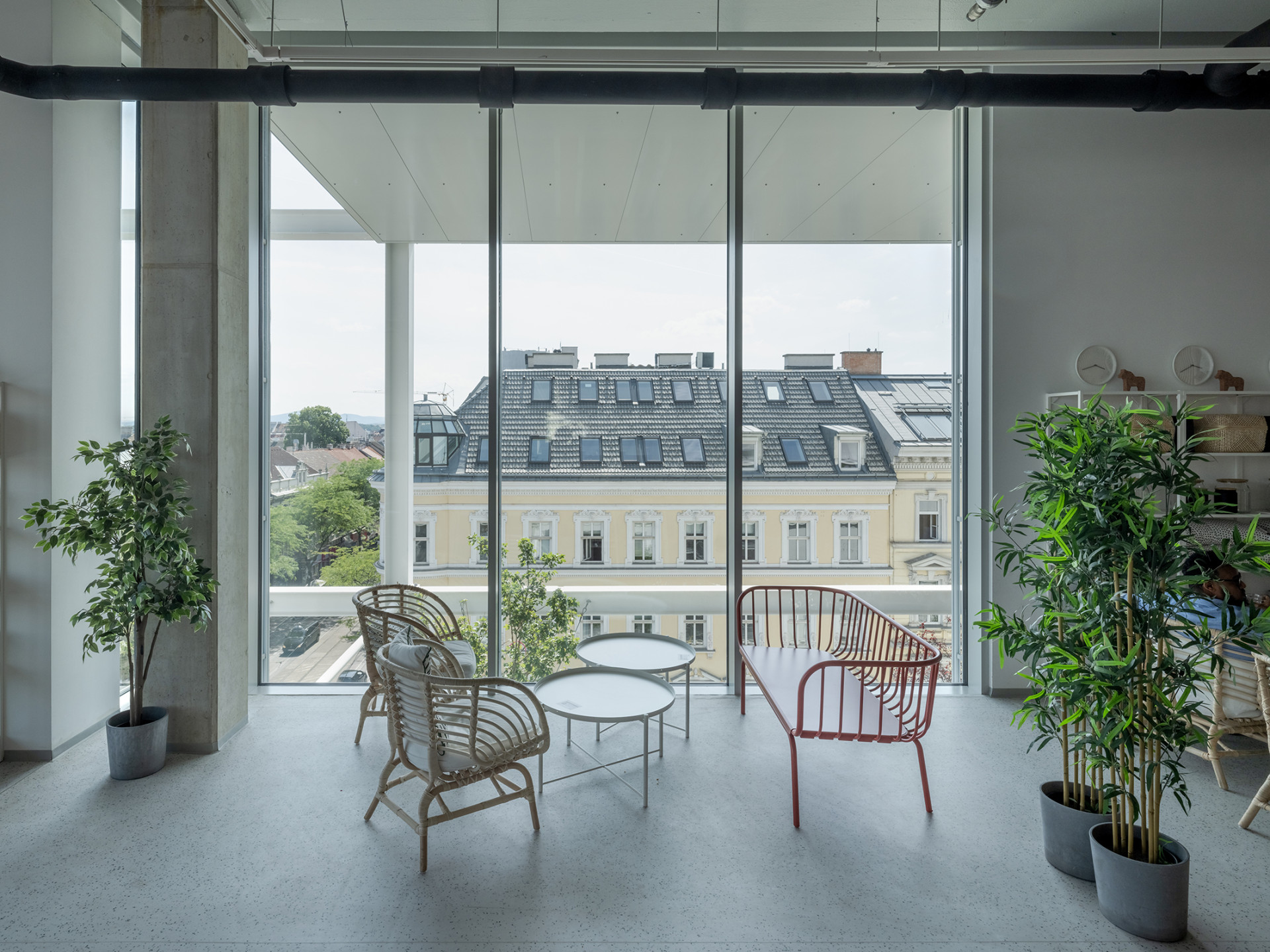 Avšak největší veřejnou atrakci vytvořili architekti přímo na střeše budovy. Působivý skelet z bíle lakované oceli pokračuje vzhůru jako otevřená pergola, kterou zvýrazňují solární panely a lamelové zastínění. Ukrývá se tu veřejná terasa, jež se rozprostírá po celé ploše střechy. Odtud mohou návštěvníci pozorovat celé centrum Vídně i kopce, které rakouskou metropoli obklopují.