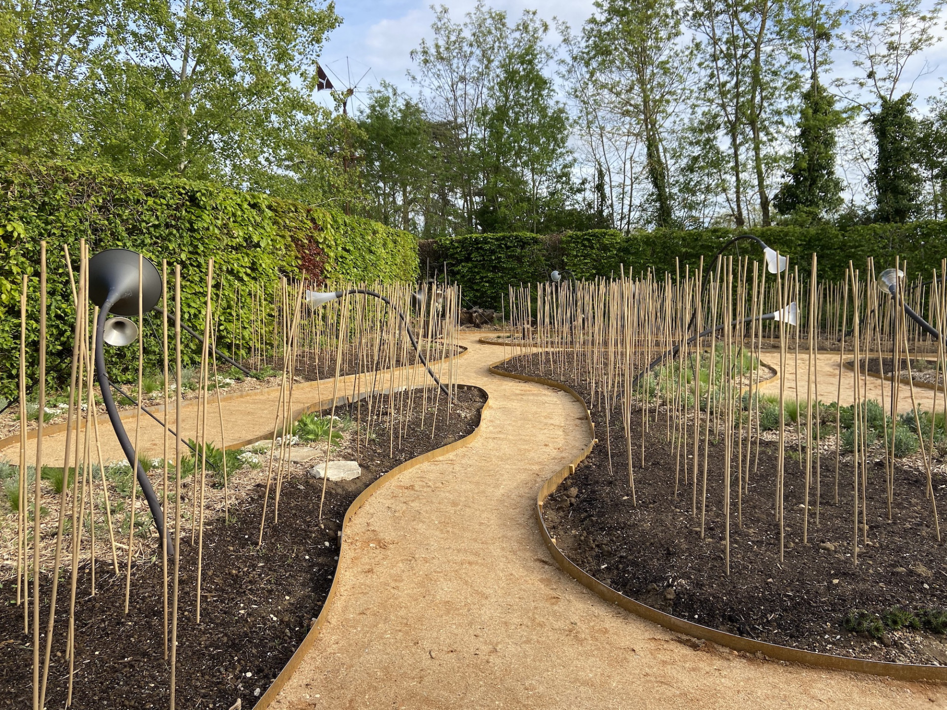 Studenti tak strávili první půlden pobytu v pracovně a zakreslovali změny. Do slepých ramen přidali alternativní výstup z pokojů pomocí šlapáků a tím vytvořili dva okruhy. Nakonec se shodli, že tato úprava projektu prospěla, což jim potvrdila i porota. „Samotná práce na naší zahradě byla podle mě velmi koordinovaná a naštěstí se nám dál už nic nepokazilo. Určité prvky měly ještě zajímavější efekt, než jsme předpokládali. Například po instalaci a zprovoznění vodního prvku jsme zjistili, že naše propojené trubky fungující jako zvukovody nesou zvuk kapající vody do úplně jiné části zahrady,“ říká Háta Enochová.