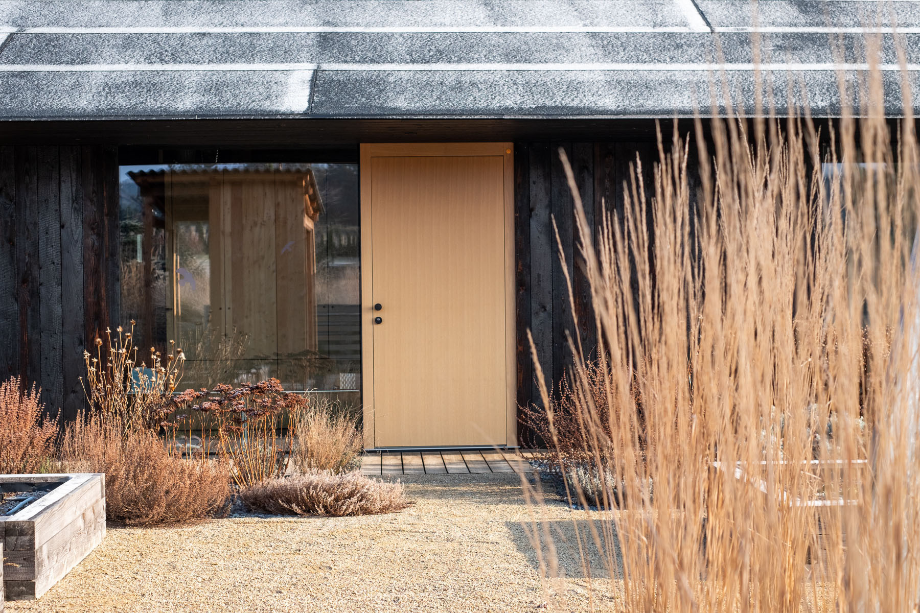 Dům – navržený ateliérem mjölk architekti – do takové krajiny zapadá. Má sedlovou střechu, podlouhlou hmotu, fasádu z opalovaného dřeva. Vypadá trošku jako stodola a trošku jako chata. Obojí se na místo hodí. Stojí totiž v chatařské kolonii, majitelé domu tady ale žijí na stálo.