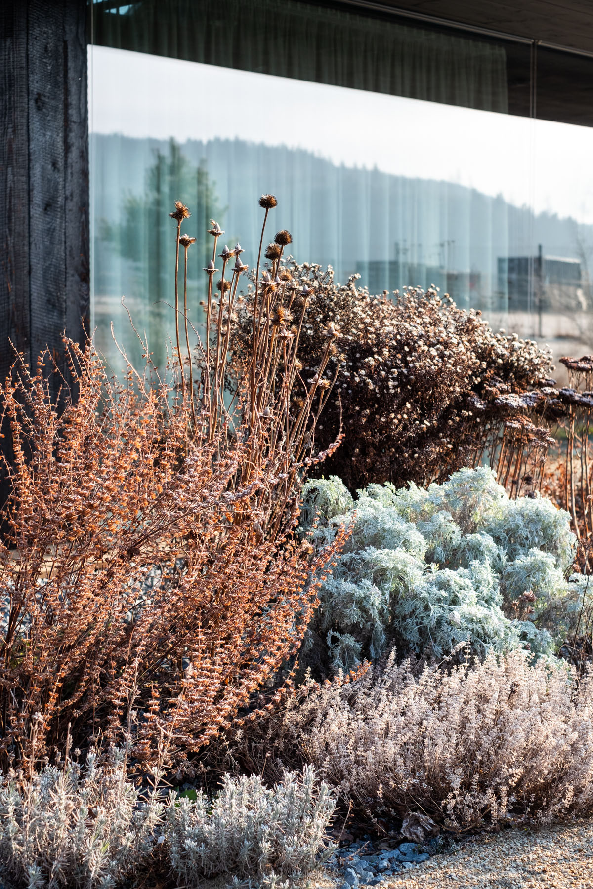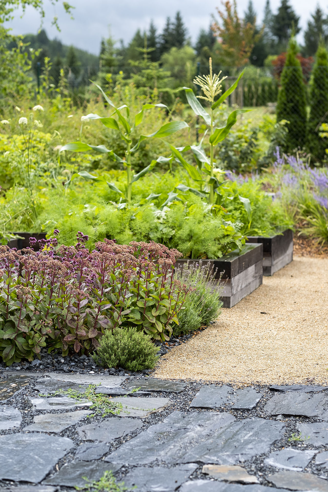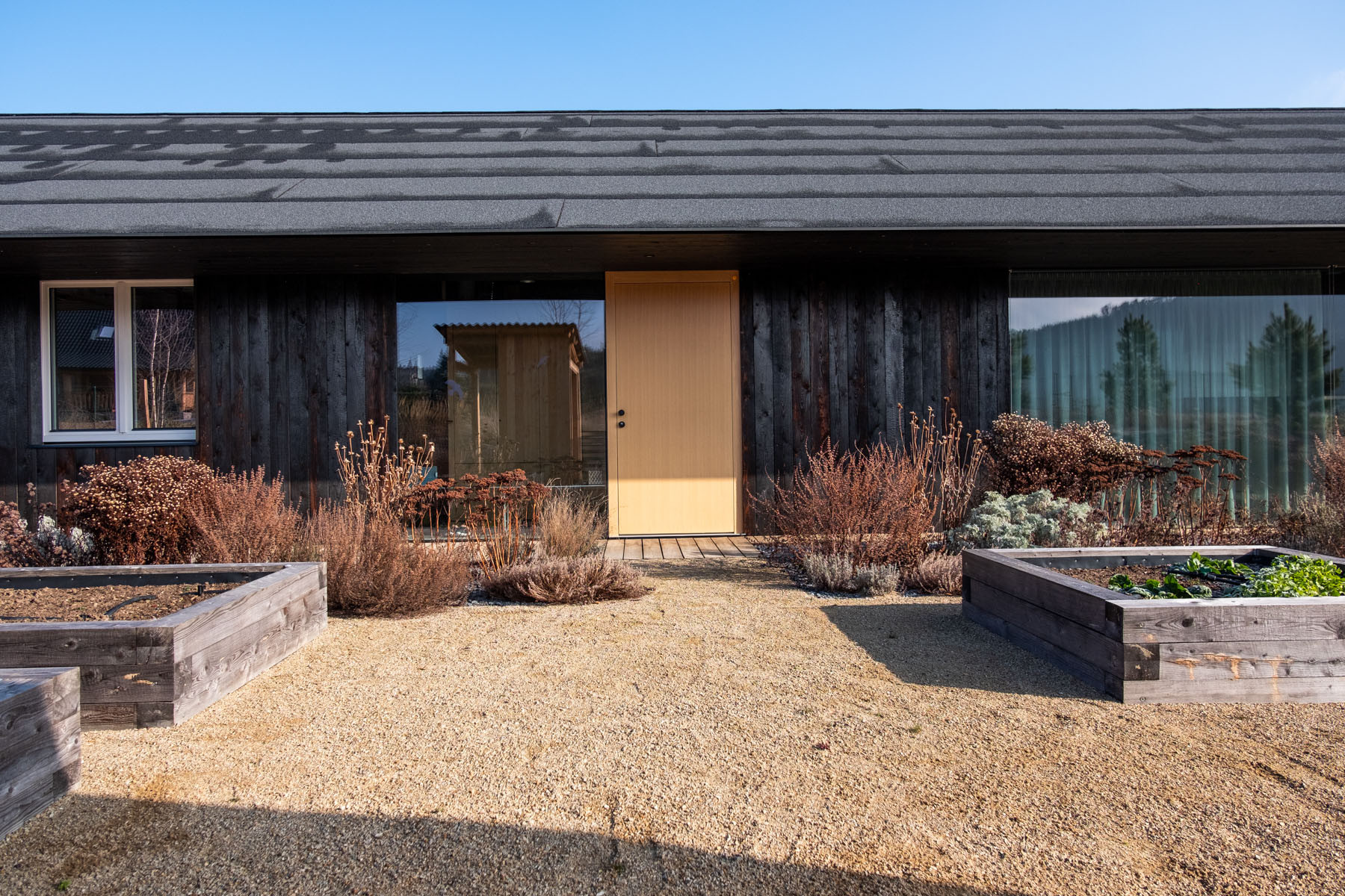 „Zeleninové zázemí je doplněno skladovacím a sázecím koutem, který si po tesařském kurzu vyrobil sám majitel. Soubor vyvýšených záhonů před domem vypadá, myslím, velmi vtipně a patřičně, ačkoliv v těch místech z podstaty očekáváme jiné uspořádání,“ říká k pěstitelské části ještě krajinářský architekt a podotýká, že záhony a skleníky bývají obvykle umisťovány ve větší vzdálenosti domů. Dát si je naopak takto blízko je ale podle něj praktické.